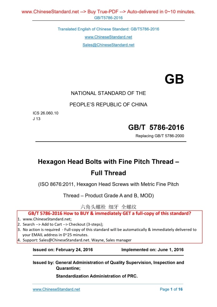 GB/T 5786-2016: Hexagon head bolts with fine pitch thread -- Full thread Delivery: 9 seconds. True-PDF full-copy in English & invoice will be downloaded + auto-delivered via email. See step-by-step procedure Status: Valid GB/T 5786: Historical versions