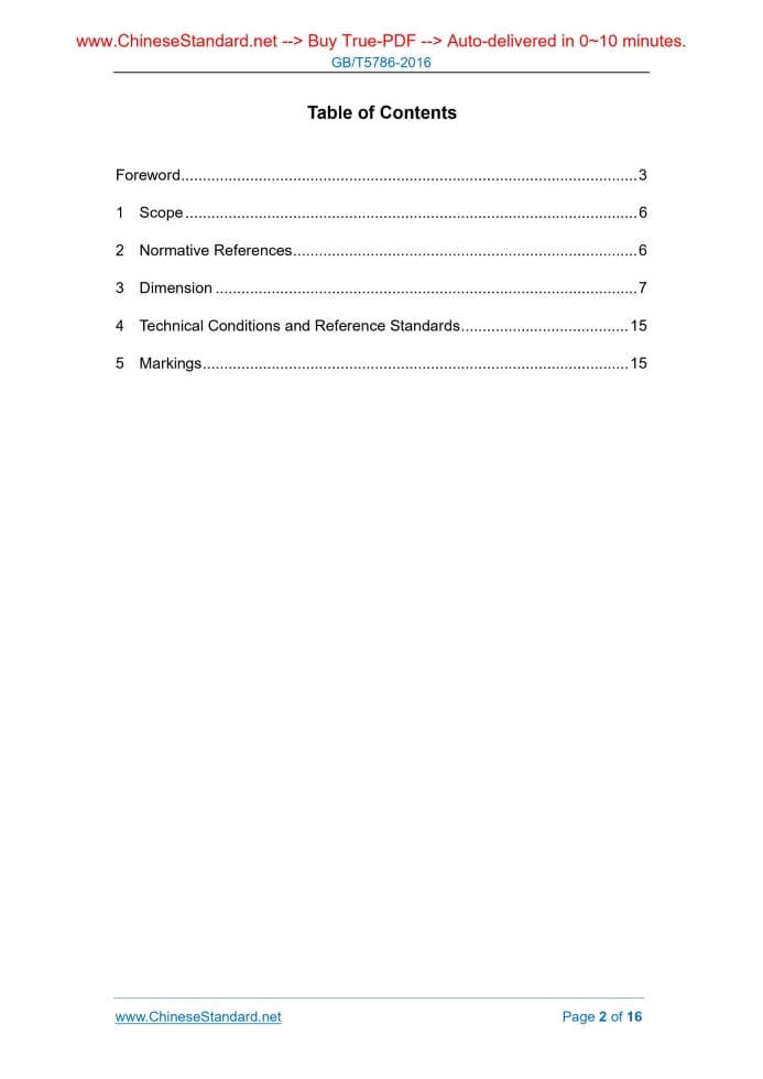 GB/T 5786-2016: Hexagon head bolts with fine pitch thread -- Full thread---This is an excerpt. Full copy of true-PDF in English version (including equations, symbols, images, flow-chart, tables, and figures etc.), auto-downloaded/delivered in 9 seconds, can be purchased online: https://www.ChineseStandard.net/PDF.aspx/GBT5786-2016GB NATIONAL STANDARD OF THE PEOPLE’S REPUBLIC OF CHINA ICS 26.060.10 J 13 Replacing GB/T 5786-2000 Hexagon Head Bolts with Fine Pitch Thread – Full Thread (ISO 8676.2011, Hexagon Head Screws with Metric Fine Pitch Thread – Product Grade A and B, MOD) 六角头螺栓 细牙 全螺纹 Issued on: FEBRUARY 24, 2016 Implemented on: JUNE 1, 2016 Issued by. General Administration of Quality Supervision, Inspection and Quarantine; Standardization Administration of PRC. Table of ContentsForeword ... 3 1 Scope ... 6 2 Normative References ... 6 3 Dimension ... 7 4 Technical Conditions and Reference Standards ... 15 5 Markings ... 15ForewordThis Standard is one of the serial national standards of “Hexagon Head Bolts”, which include. --- GB/T 27 Hexagon Head Stiffener Bolts; --- GB/T 28 Hexagon Fit Shank Bolts with Split Pin Hole on Shank; --- GB/T 29.1 Fillister Hexagon Head Bolt; --- GB/T 29.2 Hexagon Bolts with Cross Recess on Head; --- GB/T 31.1 Hexagon Bolts with Split Pin Hole on Shank; --- GB/T 31.2 Hexagon Bolts with Split Pin Hole on Shank – Reduced Shank – Product Grade B; --- GB/T 31.3 Hexagon Bolts with Split Pin Hole on Shank – Fine Pitch Thread – Product Grade A and B; --- GB/T 32.1 Hexagon Bolts with Wire Holes on Head; --- GB/T 32.2 Hexagon Bolts with Wire Holes on Head – Reduced Shank – product Grade B; --- GB/T 32.3 Hexagon Bolts with Wire Holes on Head – Fine Pitch Thread – Product Grade A and B; --- GB/T 5780 Hexagon Head Bolts – Product Grade C; --- GB/T 5781 Hexagon Head Bolts – Full Thread – Product Grade C; --- GB/T 5782 Hexagon Head Bolts; --- GB/T 5783 Hexagon Head Bolts – Full Thread; --- GB/T 5784 Hexagon Head Bolts – Reduced Shank – Product Grade B; --- GB/T 5785 Hexagon Head Bolts – Fine Pitch Thread; --- GB/T 5786 Hexagon Head Bolts with Fine Pitch Thread – Full Thread. This Standard was drafted as per the rules specified in GB/T 1.1-2009. This Standard replaced GB/T 5786-2000 Hexagon head Bolts with Fine Pitch Thread – Full Thread; compared with GB/T 5786-2000, this Standard has the major technical changes as follows. --- Modify the standard name. --- Delete the bibliography of ISO 8676. This Standard was proposed by China Machinery Industry Federation. This Standard shall be under the jurisdiction of National Technical Committee for Standardization of Fastener (SAC/TC 85). Drafting organizations of this Standard. China Productivity Center for Machinery. Participating drafting organizations of this Standard. Ningbo JiuLong Fasteners Manufacture Co., Ltd., and Ningbo Ningli High-Strength Fastener Co., Ltd.. This Standard shall be interpreted by the Secretariat of National Technical Committee for Standardization of Fastener. The historical editions replaced by this Standard are as follows. --- GB 21-1958, GB 21-1966, GB 21-1976; --- GB 22-1958, GB 22-1966, GB 22-1976; --- GB 30-1958, GB 30-1966, GB 30-1976; --- GB/T 5786-1986, GB/T 5786-2000. Hexagon Head Bolts with Fine Pitch Thread – Full Thread1 ScopeThis Standard specifies the type and dimension, technical conditions and markings of hexagon head bolts with fine pitch thread – full thread. This Standard is applicable to the hexagon head bolts with thread nominal diameter d=8mm~64mm, fine pitch thread, full-thread, Property Class 5.6, 8.8, 10.9, A2-70, A4- 70, A2-50, A4-50, CU2, CU3 and AL4, Product Grades A and B. Grade A is applied to the nuts with d=8mm~24mm and l≤10d or l≤150mm (as per the less value); while Grade B is applied to the nuts with d >24mm or l >10d or l >150mm (as per the less value). Preferred to select the coarse bolts specified in GB/T 5783.2 Normative ReferencesThe following documents are essential to the application of this document. For the dated documents, only the versions with the dates indicated are applicable to this document; for the undated documents, only the latest version (including all the amendments) are applicable to this document. GB/T 2 Fasteners - Ends of Parts with External Thread (GB/T 2-2016, ISO 4753.2011, MOD) GB/T 90.1 Fasteners – Acceptance Inspection (GB/T 90.1-2002, idt ISO 3269.2000) GB/T 90.2 Fasteners – Marking and Packaging GB/T 193 General Purpose Screw Threads – Diameters and Pitches (GB/T 193- 2003, ISO 261.1998, MOD) GB/T 1237 Designation System for Fasteners (GB/T 1237-2000, eqv ISO 8991.1986) GB/T 3098.1 Mechanical Properties of Fasteners - Bolts, Screws and Studs (GB/T 3098.1-2010, ISO 898-1.2009, MOD) GB/T 3098.6 Mechanical Properties of Fasteners - Stainless Steel Bolts, Screws and Studs (GB/T 3098.6-2014, ISO 3506-1.2009, MOD) GB/T 3098.10 Mechanical Properties of Fasteners - Bolts, Screws, Studs and Nuts Made of Non-Ferrous Metals (GB/T 3098.10-1993, eqv ISO 8839.1986) GB/T 3103.1 Tolerances for Fasteners – Bolts, Screws and Nuts (GB/T 3103.1- 2002, idt ISO 4759-1.2000) GB/T 5267.1 Fasteners – Electroplated Coatings (GB/T 5267.1-2002, ISO 4042.1999, IDT) GB/T 5267.2 Fasteners – Non-Electrolytically Applied Zinc Flake Coatings (GB/T 5267.2-2002, ISO 10683.2000, IDT) GB/T 5267.4 Passivation of Corrosion-Resistant Stainless-Steel Fasteners (GB/T 5267.4-2009, ISO 16048.2003, IDT) GB/T 5276 Fasteners - Bolts, Screws, Studs and Nuts - Symbols and Descriptions of Dimensions (GB/T 5276-2015, ISO 225.2010, MOD) GB/T 5779.1 Fasteners - Surface Discontinuities - Bolts, Screws and Studs for General Requirements GB/T 5783 Hexagon Head Bolts - Full Thread (GB/T 5783-2016, ISO 4017.2014, MOD) GB/T 9145 General Purpose Metric Screw Threads - Limits of Sizes for the Screw Threads of Medium Quality and Preferable Plan (GB/T 9145-2003, ISO 965- 2.1998, MOD) GB/T 16938 Fasteners – Gene
