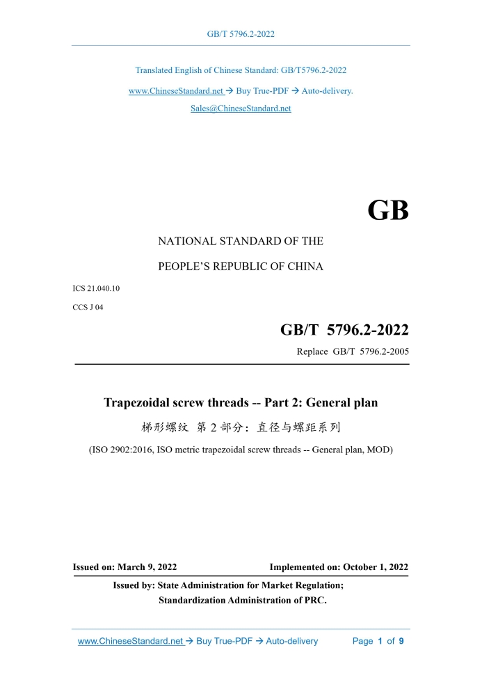 GB/T 5796.2-2022: Trapezoidal screw threads - Part 2: General plan Delivery: 9 seconds. True-PDF full-copy in English & invoice will be downloaded + auto-delivered via email. See step-by-step procedure Status: Valid GB/T 5796.2: Historical versions