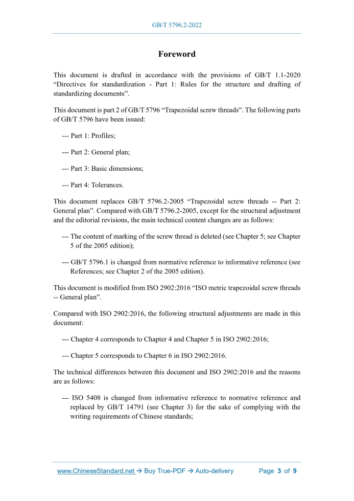 Similar standardsGB/T 5796.2-2022: Trapezoidal screw threads - Part 2: General plan---This is an excerpt. Full copy of true-PDF in English version (including equations, symbols, images, flow-chart, tables, and figures etc.), auto-downloaded/delivered in 9 seconds, can be purchased online: https://www.ChineseStandard.net/PDF.aspx/GBT5796.2-2022NATIONAL STANDARD OF THE PEOPLE’S REPUBLIC OF CHINA ICS 21.040.10 CCS J 04 Replace GB/T 5796.2-2005 Trapezoidal screw threads -- Part 2: General plan (ISO 2902:2016, ISO metric trapezoidal screw threads -- General plan, MOD) ISSUED ON: MARCH 9, 2022 IMPLEMENTED ON: OCTOBER 1, 2022 Issued by: State Administration for Market Regulation; Standardization Administration of PRC. Table of ContentsForeword ... 3 Introduction ... 5 1 Scope ... 6 2 Normative references ... 6 3 Terms and Definitions ... 6 4 Diameter and pitch series and the selection ... 6 5 Marking ... 7 References ... 9ForewordThis document is drafted in accordance with the provisions of GB/T 1.1-2020 “Directives for standardization - Part 1: Rules for the structure and drafting of standardizing documents”. This document is part 2 of GB/T 5796 “Trapezoidal screw threads”. The following parts of GB/T 5796 have been issued: --- Part 1: Profiles; --- Part 2: General plan; --- Part 3: Basic dimensions; --- Part 4: Tolerances. This document replaces GB/T 5796.2-2005 “Trapezoidal screw threads -- Part 2: General plan”. Compared with GB/T 5796.2-2005, except for the structural adjustment and the editorial revisions, the main technical content changes are as follows: --- The content of marking of the screw thread is deleted (see Chapter 5; see Chapter 5 of the 2005 edition); --- GB/T 5796.1 is changed from normative reference to informative reference (see References; see Chapter 2 of the 2005 edition). This document is modified from ISO 2902:2016 “ISO metric trapezoidal screw threads -- General plan”. Compared with ISO 2902:2016, the following structural adjustments are made in this document: --- Chapter 4 corresponds to Chapter 4 and Chapter 5 in ISO 2902:2016; --- Chapter 5 corresponds to Chapter 6 in ISO 2902:2016. The technical differences between this document and ISO 2902:2016 and the reasons are as follows: --- ISO 5408 is changed from informative reference to normative reference and replaced by GB/T 14791 (see Chapter 3) for the sake of complying with the writing requirements of Chinese standards; Trapezoidal screw threads -- Part 2: General plan1 ScopeThis document specifies the diameter and pitch combination series of trapezoidal screw threads, and the profiles conform to the provisions of GB/T 5796.1. This document applies primarily to mechanical transmission screw threads, and may also be used for fastening screw threads.2 Normative referencesThe following documents contain the provisions which, through normative reference in this document, constitute the essential provisions of this document. For the dated referenced documents, only the versions with the indicated dates are applicable to this document; for the undated referenced documents, only the latest version (including all the amendments) is applicable to this document. GB/T 14791 Screw threads – Vocabulary (GB/T 14791-2013, ISO 5408:2009, IDT)3 Terms and DefinitionsThe terms and definitions defined in GB/T 14791 apply to this document.4 Diameter and pitch series and the selectionThe combination series of nominal diameter and pitch of trapezoidal screw threads shall meet the requirements of Table 1. In Table 1, the 1st series of diameters shall be preferred; the 2nd series of diameters shall be selected secondly; the 3rd series of diameters shall be selected last. In new product designs, the 3rd series of diameters shall not be used. Select the pitch in the same row as the selected diameter, preferably the pitch in the thick black frame. If it is necessary to use a special pitch other than that in the same row of the diameter selected in Table 1, the pitch specified for the adjacent diameter in the table should be used. ......Source: Above contents are excerpted from the full-copy PDF -- translated/reviewed by: www.ChineseStandard.net / Wayne Zheng et al. Tips & Frequently Asked Questions:Question 1: How long will the true-PDF of English version of GB/T 5796.2-2022 be delivered?Answer: The full copy PDF of English version of GB/T 5796.2-2022 can be downloaded in 9 seconds, and it will also be emailed to you in 9 seconds (double mechanisms to ensure the delivery reliably), with PDF-invoice.Question 2: Can I share the purchased PDF of GB/T 5796.2-2022_English with my colleagues?Answer: Yes. The purchased PDF of GB/T 5796.2-2022_English will be deemed to be sold to your employer/organization who actually paid for it, including your colleagues and your employer's intranet.Question 3: Does the price include tax/VAT?Answer: Yes. Our tax invoice, downloaded/delivered in 9 seconds, includes all tax/VAT and complies with 100+ countries' tax regulations (tax exempted in 100+ countries) -- See Avoidance of Double Taxation Agreements (DTAs): List of DTAs signed between Singapore and 100+ countriesQuestion 4: Do you accept my currency other than USD?Answer: Yes. www.ChineseStandard.us -- GB/T 5796.2-2022 -- Click this link and select your country/currency to pay, the exact amount in your currency will be printed on the invoice. Full PDF will also be downloaded/emailed in 9 seconds.Question 5: Should I purchase the latest version GB/T 5796.2-2022?Answer: Yes. Unless special scenarios such as technical constraints or academic study, you should always prioritize to purchase the latest version GB/T 5796.2-2022 even if the enforcement date is in future. Complying with the latest version means that, by default, it also complies with all the earlier versions, technically.How to buy and download a true PDF of English version of GB/T 5796.2-2022?A step-by-step guide to download PDF of GB/T 5796.2-2022_EnglishStep 1: Visit website htt