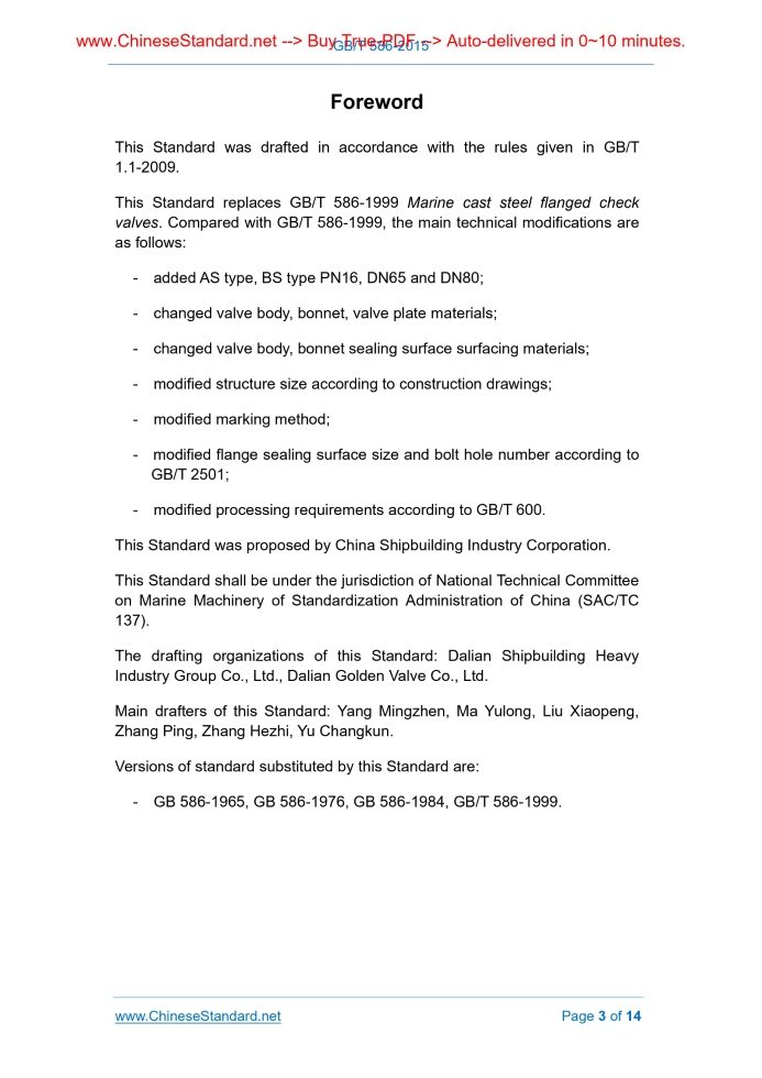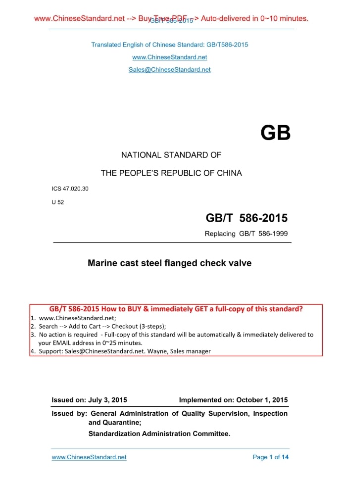 GB NATIONAL STANDARD OF THE PEOPLE’S REPUBLIC OF CHINA ICS 47.020.30 U 52 Replacing GB/T 586-1999 Marine cast steel flanged check valve Issued on: JULY 3, 2015 Implemented on: OCTOBER 1, 2015 Issued by. General Administration of Quality Supervision, Inspection and Quarantine; Standardization Administration Committee.