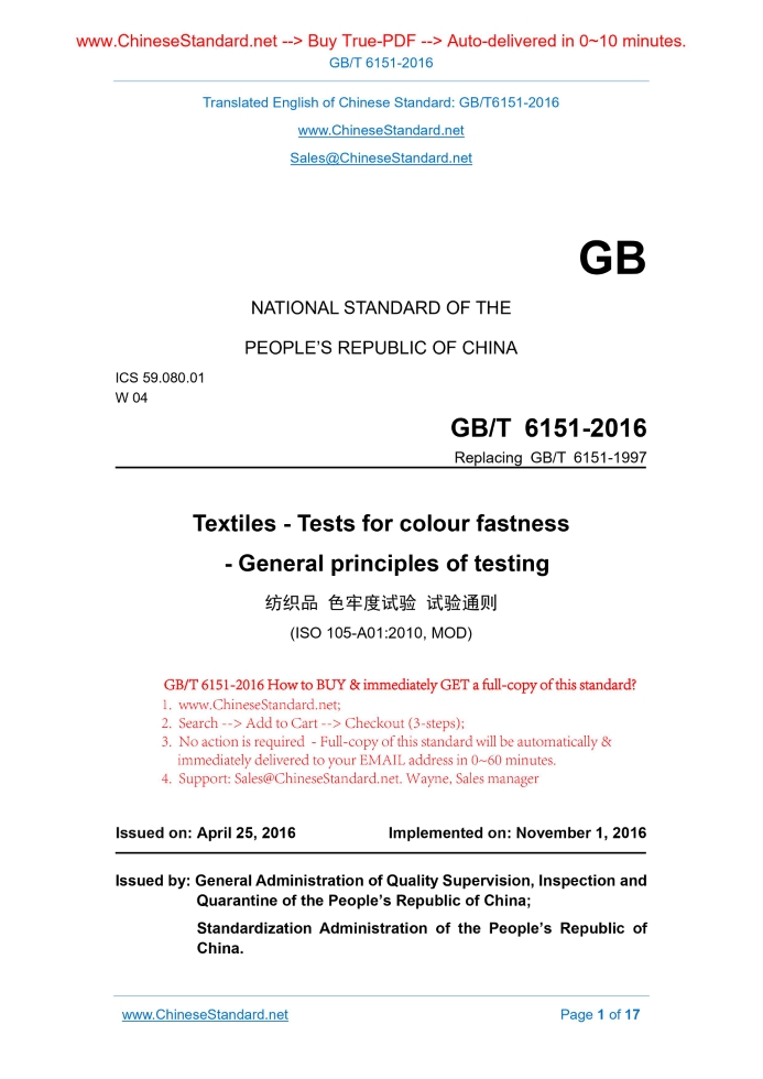 GB/T 6151-2016: Textiles -- Tests for colour fastness -- General principles of testing Delivery: 9 seconds. True-PDF full-copy in English & invoice will be downloaded + auto-delivered via email. See step-by-step procedure Status: Valid GB/T 6151: Historical versions