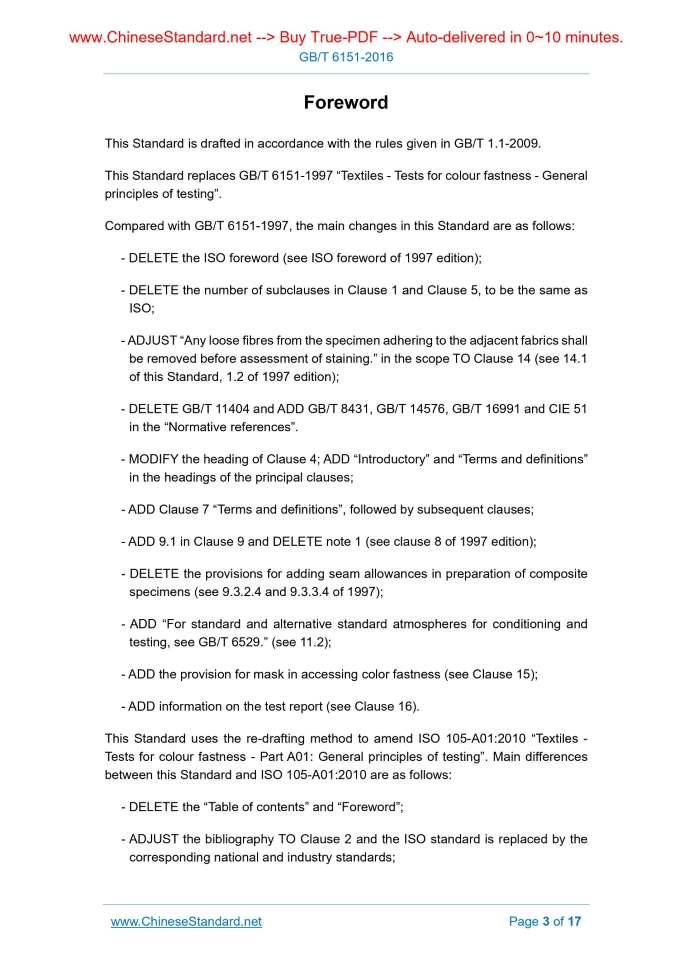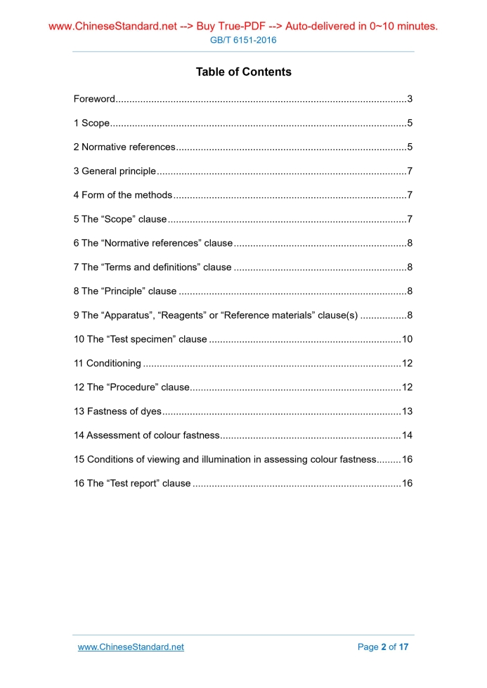 Similar standardsGB/T 6151-2016: Textiles -- Tests for colour fastness -- General principles of testing---This is an excerpt. Full copy of true-PDF in English version (including equations, symbols, images, flow-chart, tables, and figures etc.), auto-downloaded/delivered in 9 seconds, can be purchased online: https://www.ChineseStandard.net/PDF.aspx/GBT6151-2016GB NATIONAL STANDARD OF THE PEOPLE’S REPUBLIC OF CHINA ICS 59.080.01 W 04 Replacing GB/T 6151-1997 Textiles - Tests for colour fastness - General principles of testing (ISO 105-A01.2010, MOD) Issued on: APRIL 25, 2016 Implemented on: NOVEMBER 1, 2016 Issued by. General Administration of Quality Supervision, Inspection and Quarantine of the People’s Republic of China; Standardization Administration of the People’s Republic of China. 3. No action is required - Full-copy of this standard will be automatically & immediately delivered to your EMAIL address in 0~60 minutes. Table of ContentsForeword ... 3 1 Scope ... 5 2 Normative references ... 5 3 General principle ... 7 4 Form of the methods ... 7 5 The “Scope” clause ... 7 6 The “Normative references” clause ... 8 7 The “Terms and definitions” clause ... 8 8 The “Principle” clause ... 8 9 The “Apparatus”, “Reagents” or “Reference materials” clause(s) ... 8 10 The “Test specimen” clause ... 10 11 Conditioning ... 12 12 The “Procedure” clause... 12 13 Fastness of dyes ... 13 14 Assessment of colour fastness ... 14 15 Conditions of viewing and illumination in assessing colour fastness ... 16 16 The “Test report” clause ... 16ForewordThis Standard is drafted in accordance with the rules given in GB/T 1.1-2009. This Standard replaces GB/T 6151-1997 “Textiles - Tests for colour fastness - General principles of testing”. Compared with GB/T 6151-1997, the main changes in this Standard are as follows. - DELETE the ISO foreword (see ISO foreword of 1997 edition); - DELETE the number of subclauses in Clause 1 and Clause 5, to be the same as ISO; - ADJUST “Any loose fibres from the specimen adhering to the adjacent fabrics shall be removed before assessment of staining.” in the scope TO Clause 14 (see 14.1 of this Standard, 1.2 of 1997 edition); - DELETE GB/T 11404 and ADD GB/T 8431, GB/T 14576, GB/T 16991 and CIE 51 in the “Normative references”. - MODIFY the heading of Clause 4; ADD “Introductory” and “Terms and definitions” in the headings of the principal clauses; - ADD Clause 7 “Terms and definitions”, followed by subsequent clauses; - ADD 9.1 in Clause 9 and DELETE note 1 (see clause 8 of 1997 edition); - DELETE the provisions for adding seam allowances in preparation of composite specimens (see 9.3.2.4 and 9.3.3.4 of 1997); - ADD “For standard and alternative standard atmospheres for conditioning and testing, see GB/T 6529.” (see 11.2); - ADD the provision for mask in accessing color fastness (see Clause 15); - ADD information on the test report (see Clause 16). This Standard uses the re-drafting method to amend ISO 105-A01.2010 “Textiles - Tests for colour fastness - Part A01. General principles of testing”. Main differences between this Standard and ISO 105-A01.2010 are as follows. - DELETE the “Table of contents” and “Foreword”; - ADJUST the bibliography TO Clause 2 and the ISO standard is replaced by the corresponding national and industry standards; Textiles - Tests for colour fastness - General principles of testing1 ScopeThis Standard provides general information about the methods for testing colour fastness of textiles for the guidance of users. The uses and limitations of the methods are pointed out, several terms are defined, an outline of the form of the methods is given and the contents of the clauses constituting the methods are discussed. Procedures common to a number of the methods are discussed briefly. Colour fastness means the resistance of the colour of textiles to the different agents to which these materials may be exposed during manufacture and their subsequent use. The change in colour and staining of undyed adjacent fabrics are assessed as fastness ratings. Other visible changes in the textile material under test, for example surface effects, change in gloss or shrinkage, are considered as separate properties and reported as such. This Standard can be used not only for assessing colour fastness of textiles but also for assessing colour fastness of dyes. When the method is used for assessing colour fastness of dyes, the dye is applied to the textile in specified depths of colour by stated procedures and the textile is then tested in the usual way. Generally, individual methods are concerned with colour fastness to a single agent, as the agents of interest in a particular case, and the order of application, will generally vary. It is recognized that experience and future developments in practice can justify procedures in which two or more agents are combined. The conditions in the tests have been chosen to correspond closely to treatments usually employed in manufacture and to conditions of ordinary use. At the same time, they have been kept as simple and reproducible as possible. As it cannot be hoped that the tests will duplicate all the conditions under which textiles are processed or used, the fastness ratings are interpreted according to the particular needs of each user. They provide, however, a common basis for testing and reporting colour fastness.2 Normative referencesThe following referenced documents are indispensable for the application of this document. For dated references, only the edition cited applies. For undated references, the latest edition of the referenced document (including any amendments) applies. GB/T 250 Textiles - Tests for colour fastness - Grey scale for assessing change in colour (ISO 105-A02.1993, IDT) GB/T 251 Textiles - Tests for colour fastness - Grey scale for assessing staining (ISO 105-A03.1993, IDT) GB/T 6529 Textiles - Standard atmospheres fo