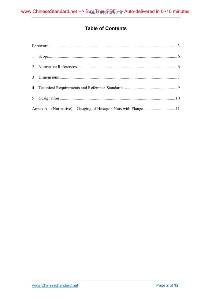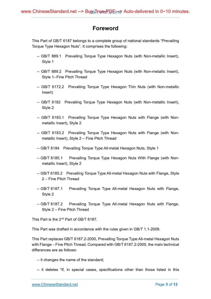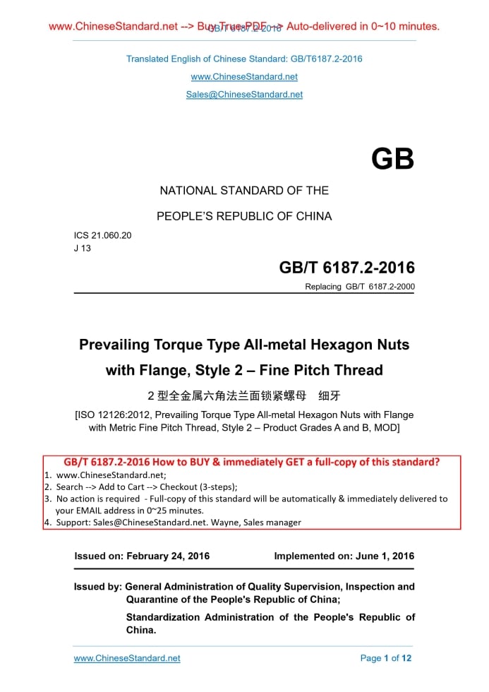 Similar standardsGB/T 6187.2-2016: Prevailing torque type all-metal hexagon nuts with flange, style 2 -- Fine pitch thread---This is an excerpt. Full copy of true-PDF in English version (including equations, symbols, images, flow-chart, tables, and figures etc.), auto-downloaded/delivered in 9 seconds, can be purchased online: https://www.ChineseStandard.net/PDF.aspx/GBT6187.2-2016 GB NATIONAL STANDARD OF THE PEOPLE’S REPUBLIC OF CHINA ICS 21.060.20 J 13 Replacing GB/T 6187.2-2000 Prevailing Torque Type All-metal Hexagon Nuts with Flange, Style 2 – Fine Pitch Thread [ISO 12126.2012, Prevailing Torque Type All-metal Hexagon Nuts with Flange with Metric Fine Pitch Thread, Style 2 – Product Grades A and B, MOD] Issued on: FEBRUARY 24, 2016 Implemented on: JUNE 1, 2016 Issued by. General Administration of Quality Supervision, Inspection and Quarantine of the People's Republic of China; Standardization Administration of the People's Republic of China. Table of ContentsForeword ... 3 1 Scope ... 6 2 Normative References ... 6 3 Dimensions ... 7 4 Technical Requirements and Reference Standards ... 9 5 Designation ... 10 Annex A (Normative) Gauging of Hexagon Nuts with Flange ... 11ForewordThis Part of GB/T 6187 belongs to a complete group of national standards “Prevailing Torque Type Hexagon Nuts”. It comprises the following. -- GB/T 889.1 Prevailing Torque Type Hexagon Nuts (with Non-metallic Insert), Style 1 -- GB/T 889.2 Prevailing Torque Type Hexagon Nuts (with Non-metallic Insert), Style 1--Fine Pitch Thread -- GB/T 6172.2 Prevailing Torque Type Hexagon Thin Nuts (with Non-metallic Insert) -- GB/T 6182 Prevailing Torque Type Hexagon Nuts (with Non-metallic Insert), Style 2 -- GB/T 6183.1 Prevailing Torque Type Hexagon Nuts with Flange (with Non- metallic Insert), Style 2 -- GB/T 6183.2 Prevailing Torque Type Hexagon Nuts with Flange (with Non- metallic Insert), Style 2 – Fine Pitch Thread -- GB/T 6184 Prevailing Torque Type All-metal Hexagon Nuts, Style 1 -- GB/T 6185.1 Prevailing Torque Type Hexagon Nuts With Flange (with Non- metallic Insert), Style 2 -- GB/T 6185.2 Prevailing Torque Type All-metal Hexagon Nuts with Flange, Style 2 – Fine Pitch Thread -- GB/T 6187.1 Prevailing Torque Type All-metal Hexagon Nuts with Flange, Style 2 -- GB/T 6187.2 Prevailing Torque Type All-metal Hexagon Nuts with Flange, Style 2 – Fine Pitch Thread This Part is the 2nd Part of GB/T 6187. This Part was drafted in accordance with the rules given in GB/T 1.1-2009. This Part replaces GB/T 6187.2-2000, Prevailing Torque Type All-metal Hexagon Nuts with Flange – Fine Pitch Thread. Compared with GB/T 6187.2-2000, the main technical differences are as follows. -- it changes the name of the standard; -- it deletes “If, in special cases, specifications other than those listed in this The following editorial modification is made in this Part. -- it changes the name of the standard. This Part was proposed by China Machinery Industry Federation. This Standard shall be under the jurisdiction of the National Standardization Technical Committee on Fasteners (SAC/TC 85). The responsible drafting organization of this Part. China Productivity Center for Machinery. The participating drafting organization of this Part. Dongfeng Commercial Vehicles Co Ltd. Dongfeng Commercial Vehicles Technology Centre. This Part shall be interpreted by the Secretariat of National Standardization Technical Committee on Fasteners. The previous edition replaced by this Part is as follows. -- GB/T 6187.2-2000. Prevailing Torque Type All-metal Hexagon Nuts with Flange, Style 2 – Fine Pitch Thread1 ScopeThis Part of GB/T 6187 specifies the dimensions, technical requirements and designation of prevailing torque type all-metal hexagon nuts with flange, style 2 – fine pitch thread. This Part applies to prevailing torque type all-metal hexagon nuts, style 2, with thread nominal diameter 8 mm to 20 mm, fine pitch thread, property class 6, 8 and 10 and of product grades A and B. Product grade A is used for nuts with D ≤ 16 mm; and product grade B is used for nuts with D > 16 mm. Note. The dimensions of the nuts correspond to those given in GB/T 6177.2 plus prevailing torque feature.2 Normative ReferencesThe following referenced documents are indispensable for the application of this document. For dated references, only the edition dated applies to this document. For undated references, the latest edition of the referenced document (including any amendments) applies to this Standard. GB/T 90.1 Fasteners – Acceptance Inspection (GB/T 90.1-2002, ISO 3269.2000, IDT) GB/T 90.2 Fasteners – Marking and Packaging GB/T 193 General Purpose Metric Screw Threads – Diameters and Pitches (GB/T 193-2003, ISO 261.1998, MOD) GB/T 1237 Designation System for Fasteners (GB/T 1237-2000, eqv. ISO 8991.1986) GB/T 3098.2 Mechanical Properties of Fasteners – Nuts (GB/T 3098.2-2015, ISO 898-2.2012, MOD) GB/T 3098.9 Mechanical Properties of Fasteners – Prevailing Torque Type Steel Nuts (GB/T 3098.9-2010, ISO 2320.2008, IDT) GB/T 3103.1 Essential Oils and Aromatic Extracts – Determination of Residual Benzene Content (GB/T 3103.1-2002, ISO 4759-1.2000, IDT) GB/T 5267.1 Fasteners – Electroplated Coatings (GB/T 5267.1-2002, ISO 4042.1999, IDT) GB/T 5267.2 Fasteners – Non-electrolytically Applied Zinc Flake Coatings (GB/T 5267.2-2002, ISO 10683.2000, IDT) GB/T 5276 Fasteners – Bolts, Screws, Studs and Nuts – Symbols and Description of Dimensions (GB/T 5276-2015, ISO 225.2010, MOD) GB/T 5779.2 Fasteners - Surface Discontinuities – Nuts (GB/T 5779.2-2000, ISO 6157-2.1995, IDT) GB/T 6177.2 Hexagon Nuts with Flange, Style 2 – Fine Pitch Thread (GB/T 6177.2-2016, ISO 10663.2012, MOD) GB/T 9145 General Purpose Metric Screw Threads – Limits of Sizes for the Screw Threads of Medium Quality and Preferable Plan (GB/T 9145-2003, ISO 965- 2.1998, MOD) GB/T 16938 Fasteners – General Requirements for Bolts Screws Studs and Nuts (GB/T 16938-2008