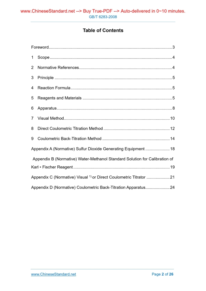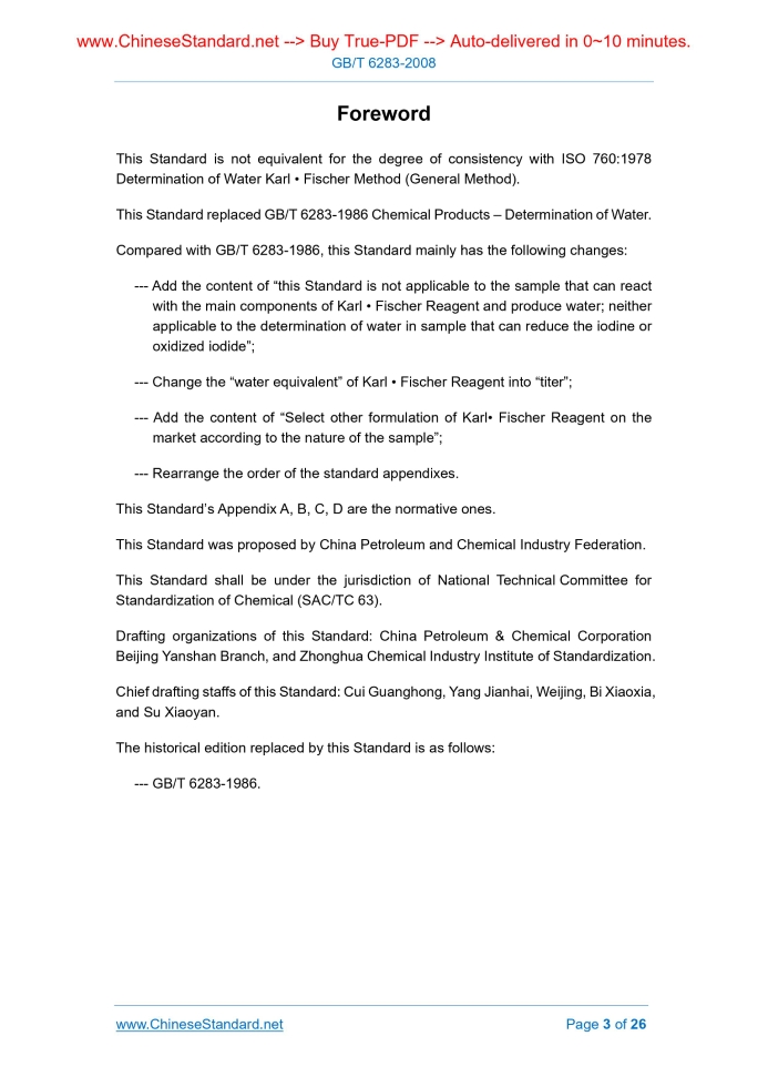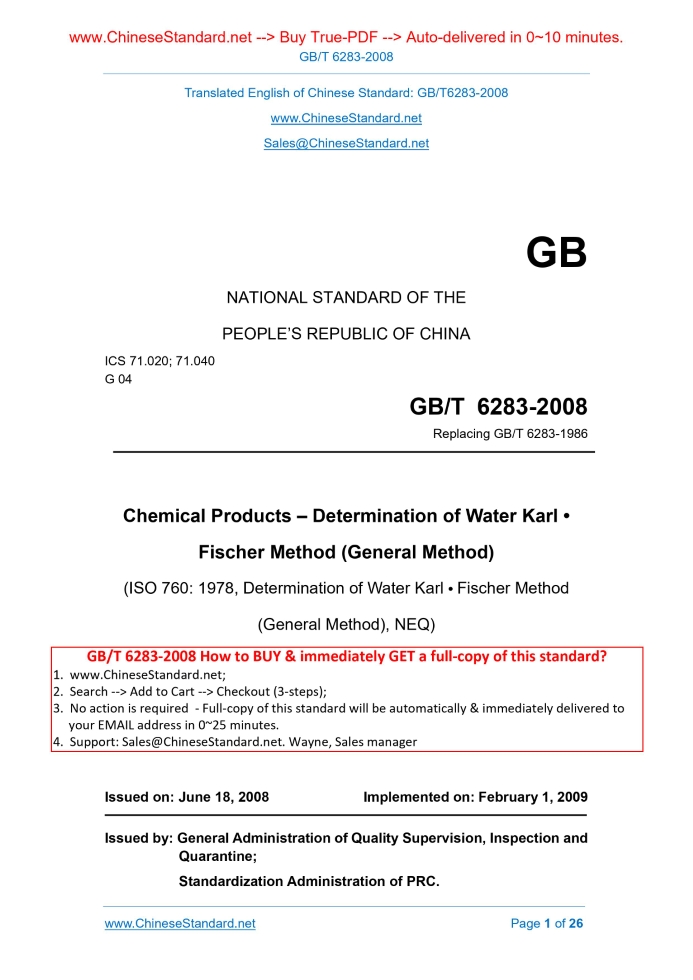 GB/T 6283-2008: Chemical products -- Determination of water Karl-Fischer method (general method)---This is an excerpt. Full copy of true-PDF in English version (including equations, symbols, images, flow-chart, tables, and figures etc.), auto-downloaded/delivered in 9 seconds, can be purchased online: https://www.ChineseStandard.net/PDF.aspx/GBT6283-2008GB NATIONAL STANDARD OF THE PEOPLE’S REPUBLIC OF CHINA ICS 71.020; 71.040 G 04 Replacing GB/T 6283-1986 Chemical Products – Determination of Water Karl • Fischer Method (General Method) (ISO 760.1978, Determination of Water Karl • Fischer Method (General Method), NEQ) Issued on. JUNE 18, 2008 Implemented on. FEBRUARY 1, 2009 Issued by. General Administration of Quality Supervision, Inspection and Quarantine; Standardization Administration of PRC. Table of ContentsForeword... 3 1 Scope... 4 2 Normative References... 4 3 Principle... 5 4 Reaction Formula... 5 5 Reagents and Materials... 5 6 Apparatus... 8 7 Visual Method... 10 8 Direct Coulometric Titration Method... 12 9 Coulometric Back-Titration Method... 14 Appendix A (Normative) Sulfur Dioxide Generating Equipment... 18 Appendix B (Normative) Water-Methanol Standard Solution for Calibration of Karl • Fischer Reagent... 19 Appendix C (Normative) Visual 1) or Direct Coulometric Titrator... 21 Appendix D (Normative) Coulometric Back-Titration Apparatus... 24ForewordThis Standard is not equivalent for the degree of consistency with ISO 760.1978 Determination of Water Karl • Fischer Method (General Method). This Standard replaced GB/T 6283-1986 Chemical Products – Determination of Water. Compared with GB/T 6283-1986, this Standard mainly has the following changes. --- Add the content of “this Standard is not applicable to the sample that can react with the main components of Karl • Fischer Reagent and produce water; neither applicable to the determination of water in sample that can reduce the iodine or oxidized iodide”; --- Change the “water equivalent” of Karl • Fischer Reagent into “titer”; --- Add the content of “Select other formulation of Karl• Fischer Reagent on the market according to the nature of the sample”; --- Rearrange the order of the standard appendixes. This Standard’s Appendix A, B, C, D are the normative ones. This Standard was proposed by China Petroleum and Chemical Industry Federation. This Standard shall be under the jurisdiction of National Technical Committee for Standardization of Chemical (SAC/TC 63). Drafting organizations of this Standard. China Petroleum & Chemical Corporation Beijing Yanshan Branch, and Zhonghua Chemical Industry Institute of Standardization. Chief drafting staffs of this Standard. Cui Guanghong, Yang Jianhai, Weijing, Bi Xiaoxia, and Su Xiaoyan. The historical edition replaced by this Standard is as follows. --- GB/T 6283-1986. Chemical Products – Determination of Water Karl • Fischer Method (General Method)1 ScopeThis Standard specifies a general method for the determination of the free or crystal water content of a sample by the Karl • Fischer visual method and the coulometric method. This Standard is applicable to the determination of free or crystal water content in the most organic and o inorganic solid, liquid chemical products. This Standard is not applicable to the sample that can react with the main components of Karl • Fischer Reagent and produce water; neither applicable to the determination of water in sample that can reduce the iodine or oxidized iodide. In some cases, the sample requires pretreatment measures, which shall be specified in the corresponding national standards. When there is no instrument for the coulometric method, the visual method can be used; it is a direct titration, but only can used for the colorless solution. The coulometric method includes direct titration and back titration methods. No matter which titration is adopted, the result is more accurate; therefore, the coulometric method is recommended to be used.2 Normative ReferencesThe provisions in following documents become the provisions of this Standard through reference in this Standard. For dated references, the subsequent amendments (excluding corrigendum) or revisions do not apply to this Standard, however, parties who reach an agreement based on this Standard are encouraged to study if the latest versions of these documents are applicable. For undated references, the latest edition of the referenced document applies. GB/T 6682 Water for Analytical Laboratory Use - Specification and Test Methods (GB/T 6682-2008, ISO 3696.1987, MOD)3 PrincipleAny water (free or crystal water) present in the sample is quantitatively reacted with Karl • Fischer Reagent (a solution consists of iodine, sulfur dioxide, pyridine and methanol) of know titer.4 Reaction Formula5 Reagents and Materials5.1 Water Tested water shall meet the specification of Grade-III water stipulated in GB/T 6682. 5.2 Methanol Analytically pure. If the mass fraction of water in reagent is greater than 0.05%, add 50g of 5A molecular sieve into 500mL of methanol; plug the bottle stopper; place overnight; absorb the supernatant to use. 5.4 Iodine Analytically pure. 5.5 Pyridine Analytically pure. If the mass fraction of water in reagent is greater than 0.05%, add 50g of 5A molecular sieve into 500mL of pyridine; plug the bottle stopper; place overnight, absorb the supernatant to use. 5.6 Glacial acetic acid Analytical pure. 5.9 Anhydrous sodium sulfite Chemically pure. 5.10 Sulfur dioxide The sulfur dioxide both loaded with steel bottle and generated through sulfuric acid decomposing the sodium sulfite shall go through the dehydrating and drying treatment. The sulfur dioxide generation unit can refer to Appendix A. 5.11 Sample solvent The mixture containing 4 volumes of methanol and 1 volume of pyridine; or the mixture containing 4 volumes of ethylene glycol monomethylether and 1 volume of pyridine (especially applicable to the carbonyl-containing comp