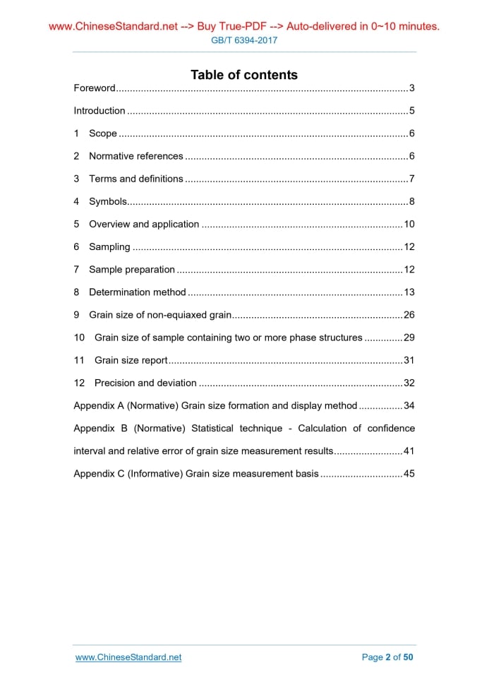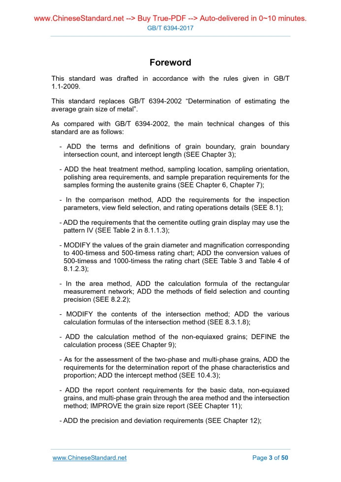 Similar standardsGB/T 6394-2017: Determination of estimating the average grain size of metal---This is an excerpt. Full copy of true-PDF in English version (including equations, symbols, images, flow-chart, tables, and figures etc.), auto-downloaded/delivered in 9 seconds, can be purchased online: https://www.ChineseStandard.net/PDF.aspx/GBT6394-2017GB NATIONAL STANDARD ICS 77.040.99 H 24 Replacing GB/T 6394-2002 Determination of estimating the average grain size of metal Issued on. FEBRUARY 28, 2017 Implemented on. NOVEMBER 01, 2017 Issued by. General Administration of Quality Supervision, Inspection and Quarantine of the People's Republic of China; Standardization Administration of PRC. Table of ContentsForeword... 3 Introduction... 5 1 Scope... 6 2 Normative references... 6 3 Terms and definitions... 7 4 Symbols... 8 5 Overview and application... 10 6 Sampling... 12 7 Sample preparation... 12 8 Determination method... 13 9 Grain size of non-equiaxed grain... 26 10 Grain size of sample containing two or more phase structures... 29 11 Grain size report... 31 12 Precision and deviation... 32 Appendix A (Normative) Grain size formation and display method... 34 Appendix B (Normative) Statistical technique - Calculation of confidence interval and relative error of grain size measurement results... 41 Appendix C (Informative) Grain size measurement basis... 451 Scope1.1 This standard specifies the expression and determination methods of the average grain size of metal structure, including the comparison method, area method and interception method; it is applicable to the single-phase structure; however, after being specified, it is also applicable to the determination of the average grain size of the certain type in the multi-phase or multi-component sample. If the histomorphology of the non-metallic material is similar to the metal structure in the rating chart, it may also make reference to it. 1.2 This standard uses the grain area, diameter or intercept length of the unimodal distribution (similar to the lognormal distribution) to determine the average grain size of the sample, AND it is not applicable to the grain size of the bimodal distribution. The evaluation of double grain size is as shown in GB/T 24177.For the determination of individual coarse grains on a fain grain substrate, SEE YB/T 4290. 1.3 This standard applies only to the measurement of the plane grain size measurement, AND it is not applicable to the three-dimensional grain size, that is, the measurement of three-dimensional grain size. 1.4 This standard is only used as a recommended test method, AND it shall cannot determine whether the test material is received or suitable for the range of use.2 Normative referencesThe following documents are essential to the application of this document. For the dated documents, only the versions with the dates indicated are applicable to this document; for the undated documents, only the latest version (including all the amendments) are applicable to this Standard. GB/T 4335 Determination of ferrite grain size for cold rolled low carbon steel sheets GB/T 13298 Inspection methods of microstructure for metals GB/T 24177 Standard test methods for characterizing duplex grain sizes GB/T 30067 Standard terminology relating to metallography YB/T 4290 Test methods for estimating the largest grain observed in a metallographic section (ALA grain size)3 Terms and definitionsThe terms and definitions as defined in GB/T 30067 AND the following terms and definitions apply to this document. 3.1 Grain boundary It refers to, for the polycrystalline material, a narrow region transitioning from one crystal direction to the other crystal direction, thereby separating the adjacent grains. 3.2 Grain It refers to the entire area surrounded by grain boundaries, that is, the area within the original grain boundary observed on the two-dimensional plane, or the volume surrounded by the original grain boundery on the three-dimensional object. For twin-grain boundary materials, the twin-grain boundary is not considered. 3.3 Grain size It refers to the measurement of the size of grain, which is evaluated or determined by different methods, is usually expressed using the length, area, volume, or grain size level, AND the grain size as expressed using the grain size level is independent of the measurement method and the unit of use. 3.4 Micro-grain size number The micro-grain size number G is defined as. 3.5 Macro-grain size number Gm The macro-grain size level Gm is defined as.4 SymbolsThe symbols and descriptions used in this standard are as shown in Table 1.5 Overview and application5.1 This standard specifies the basic method for determining the average grain size. comparison method, area method and intersection method. 5.2 Comparison method. comparison method does not need to count grain, intersection or intercept. 5.4 Intersection method. intersection method is to count the number of the intercept between the test line (or grid) of known length and the grain or the number of intersection between the test line (or grid) and the grain, AND to calculate the unit length intercept count NL or the intersection count PL, so as to determine the grain size level G. 5.6 In the event of a dispute, the intersection method is used as the arbitration method. 5.7 Low-carbon steel cold-rolled sheet ferrite grain size is determined in accordance with the provisions of GB/T 4335. 5.8 A single grain cannot be determined on the basis of the standard rating chart. Because the composition of the standard rating chart takes into account the relationship between the cut plane and the grain three-dimensional arrangement, it shows the arrangement distribution of grain from the minimum to the maximum, which reflects the representative normal distribution results. Therefore, the rating chart cannot be used to determine a single grain. 5.9 When determining the grain size, it shall be recognized that the determination of grain size is not a