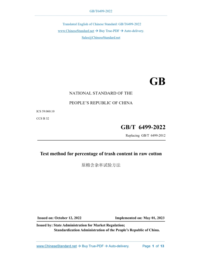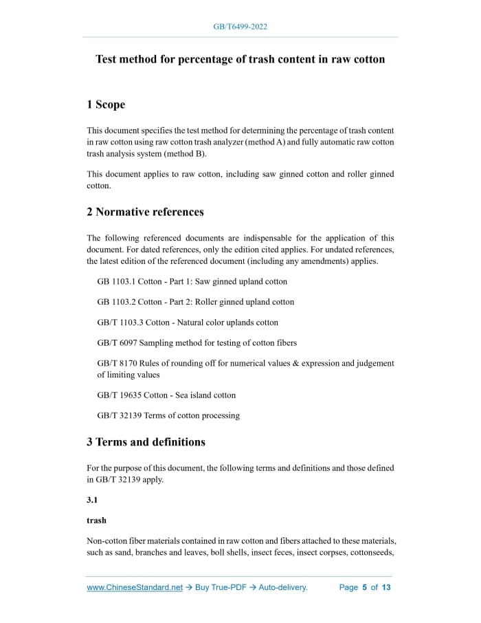 GB/T 6499-2022: Test method for percentage of trash content in raw cotton Delivery: 9 seconds. True-PDF full-copy in English & invoice will be downloaded + auto-delivered via email. See step-by-step procedure Status: Valid GB/T 6499: Historical versions