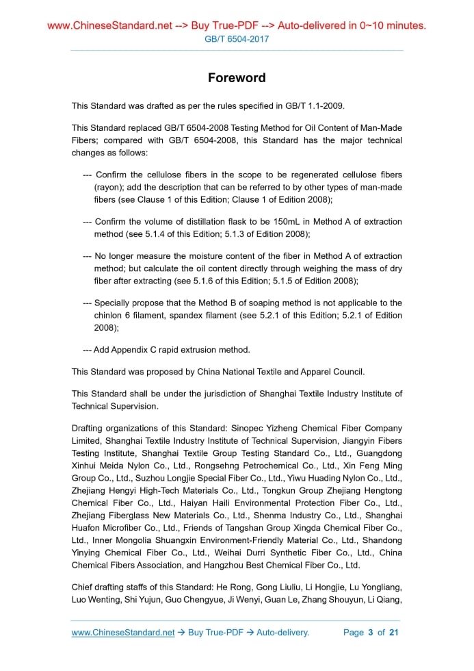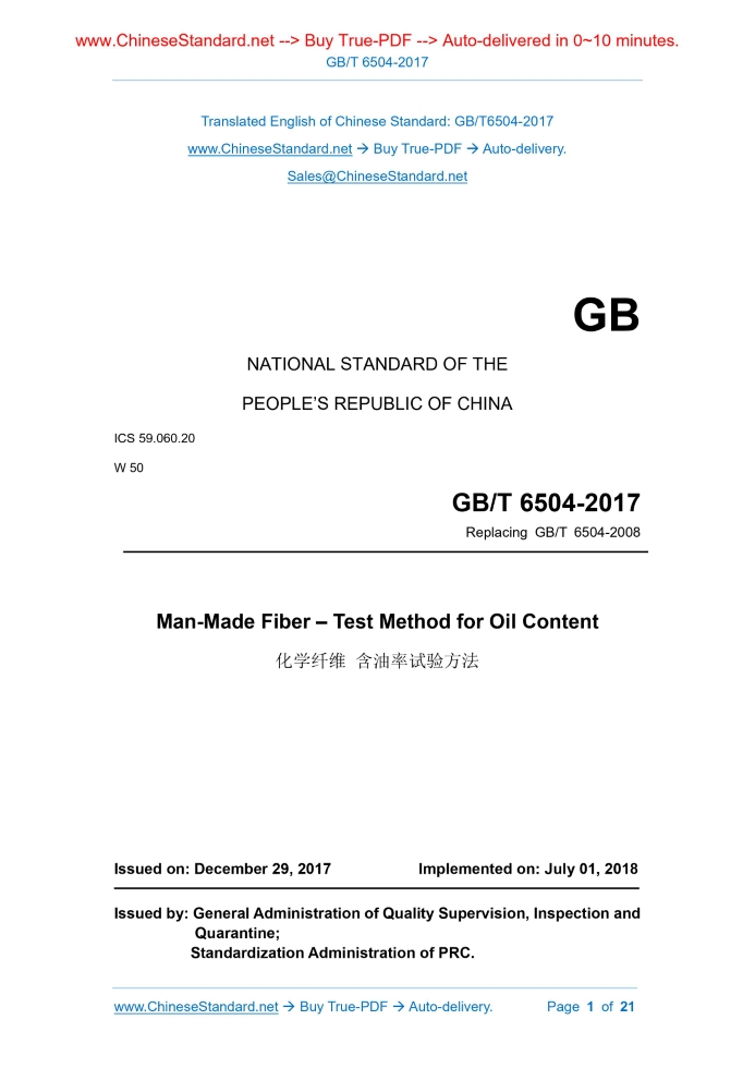 GB/T 6504-2017: Man-Made Fiber - Test Method for Oil Content Delivery: 9 seconds. True-PDF full-copy in English & invoice will be downloaded + auto-delivered via email. See step-by-step procedure Status: Valid GB/T 6504: Historical versions