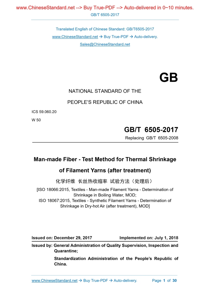 GB/T 6505-2017: Man-made fiber -- Test method for thermal shrinkage of filament yarns (after treatment) Delivery: 9 seconds. True-PDF full-copy in English & invoice will be downloaded + auto-delivered via email. See step-by-step procedure Status: Valid GB/T 6505: Historical versions