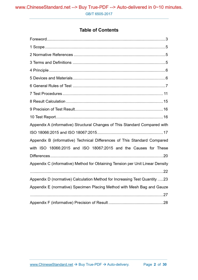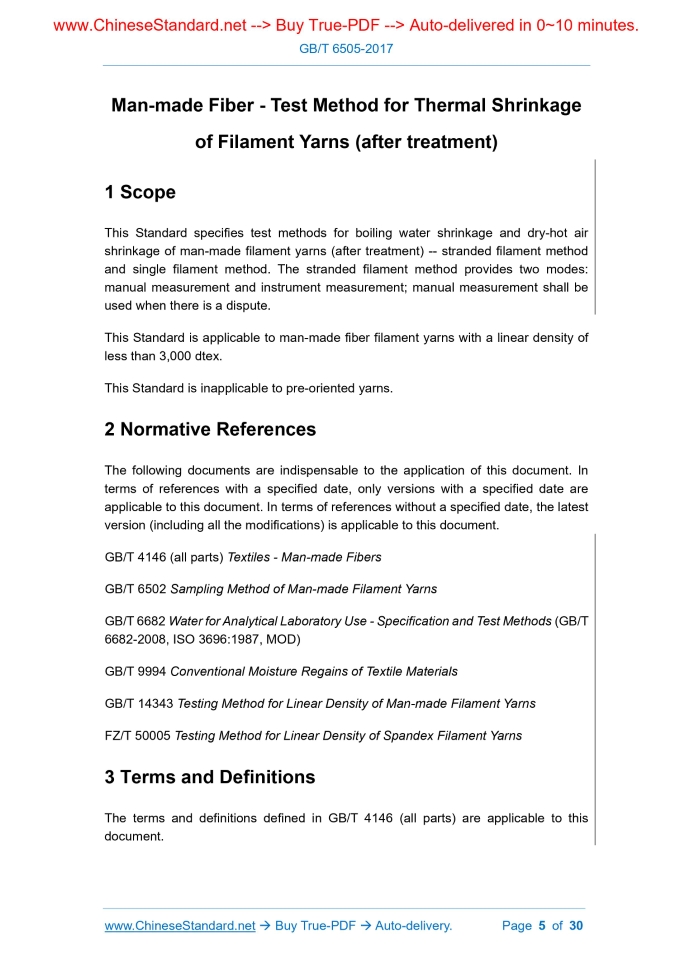GB/T 6505-2017: Man-made fiber -- Test method for thermal shrinkage of filament yarns (after treatment)---This is an excerpt. Full copy of true-PDF in English version (including equations, symbols, images, flow-chart, tables, and figures etc.), auto-downloaded/delivered in 9 seconds, can be purchased online: https://www.ChineseStandard.net/PDF.aspx/GBT6505-2017 GB NATIONAL STANDARD OF THE PEOPLE’S REPUBLIC OF CHINA ICS 59.060.20 W 50 Replacing GB/T 6505-2008 Man-made Fiber - Test Method for Thermal Shrinkage of Filament Yarns (after treatment) [ISO 18066:2015, Textiles - Man-made Filament Yarns - Determination of Shrinkage in Boiling Water, MOD; ISO 18067:2015, Textiles - Synthetic Filament Yarns - Determination of Shrinkage in Dry-hot Air (after treatment), MOD] ISSUED ON: DECEMBER 29, 2017 IMPLEMENTED ON: JULY 1, 2018 Issued by: General Administration of Quality Supervision, Inspection and Quarantine; Standardization Administration of the People’s Republic of China. Table of ContentsForeword ... 3 1 Scope ... 5 2 Normative References ... 5 3 Terms and Definitions ... 5 4 Principle ... 6 5 Devices and Materials ... 6 6 General Rules of Test ... 7 7 Test Procedures ... 11 8 Result Calculation ... 15 9 Precision of Test Result ... 16 10 Test Report ... 16 Appendix A (informative) Structural Changes of This Standard Compared with ISO 18066:2015 and ISO 18067:2015 ... 17 Appendix B (informative) Technical Differences of This Standard Compared with ISO 18066:2015 and ISO 18067:2015 and the Causes for These Differences ... 20 Appendix C (informative) Method for Obtaining Tension per Unit Linear Density ... 22 Appendix D (normative) Calculation Method for Increasing Test Quantity ... 23 Appendix E (normative) Specimen Placing Method with Mesh Bag and Gauze ... 27 Appendix F (informative) Precision of Result ... 28 Man-made Fiber - Test Method for Thermal Shrinkage of Filament Yarns (after treatment)1 ScopeThis Standard specifies test methods for boiling water shrinkage and dry-hot air shrinkage of man-made filament yarns (after treatment) -- stranded filament method and single filament method. The stranded filament method provides two modes: manual measurement and instrument measurement; manual measurement shall be used when there is a dispute. This Standard is applicable to man-made fiber filament yarns with a linear density of less than 3,000 dtex. This Standard is inapplicable to pre-oriented yarns.2 Normative ReferencesThe following documents are indispensable to the application of this document. In terms of references with a specified date, only versions with a specified date are applicable to this document. In terms of references without a specified date, the latest version (including all the modifications) is applicable to this document. GB/T 4146 (all parts) Textiles - Man-made Fibers GB/T 6502 Sampling Method of Man-made Filament Yarns GB/T 6682 Water for Analytical Laboratory Use - Specification and Test Methods (GB/T 6682-2008, ISO 3696:1987, MOD) GB/T 9994 Conventional Moisture Regains of Textile Materials GB/T 14343 Testing Method for Linear Density of Man-made Filament Yarns FZ/T 50005 Testing Method for Linear Density of Spandex Filament Yarns3 Terms and DefinitionsThe terms and definitions defined in GB/T 4146 (all parts) are applicable to this document.4 PrincipleUnder specified conditions, use thermal medium (boiling water or dry-hot air) to treat the test specimen. Measure the length variation of the test specimen before and after the treatment; calculate its percentage to the original length of the test specimen. Thus, the thermal shrinkage rate can be obtained.5 Devices and Materials5.1 Filament yarn length measuring instrument, attached with: a) A device that can adjust tension and a reciprocating filament-guiding device; b) A device that can adjust the speed, so as to ensure that the tension fluctuation is within the allowable range; c) Yarn frame, with a circumference of (1.000 ± 0.002) m; d) A reel counting device. 5.2 Filament-stranding rack: a cylindrical frame mechanism; multiple test specimens can be placed at the same time. Each test specimen has a 2.5 cN hook weight, with a height of at least 600 mm. There is respectively a row of hooks at the upper and lower ends. During the test, the stranded filament is hung between the upper and lower hooks. The upper hook is fixed; the lower hook is the 2.5 cN hook weight, which frictionlessly lifts and lowers along the metal wires on both sides. 5.3 Manual length measuring rack, attached with: a) Vertical measuring scale: measuring range is 1 m; minimum division value is 1 mm. The upper end is equipped with clamps and hooks. The clamping surface of the clamp is flat; it shall not damage the filament or slip during the clamping. The hooks are made of steel wire with a diameter of 2 mm ~ 3 mm; the upper end of the outer circle of the steel wire at the yarn hanging position is parallel to the zero position of the measuring scale; b) Device for applying pre-tension: the accuracy of applying pre-tension is ± 10%; tension device is a combination weight with a hook or a combination weight with a clamp. 5.4 Automatic length measuring instrument: it can automatically measure the length of the stranded filament before and after thermal treatment; calculate the thermal shrinkage rate and automatically adjust the tension. It is also equipped with a filament- the upper limit of the laboratory’s relative humidity; ---When the temperature of the sample is 5 °C lower than the laboratory temperature. 6.2.2 Standard atmosphere for conditioning and testing For test specimens with a conventional moisture regain less than 4.5%: temperature (20 ± 2) °C, relative humidity (65 ± 5) %. For test specimens with a conventional moisture regain greater than or equal to 4.5%: temperature (20 ± 2) °C, relative humidity (65 ± 3) %. The conventional moisture regain of various fibers shall refer to GB/T 9994. 6.2.3 Conditions of boiling water 
