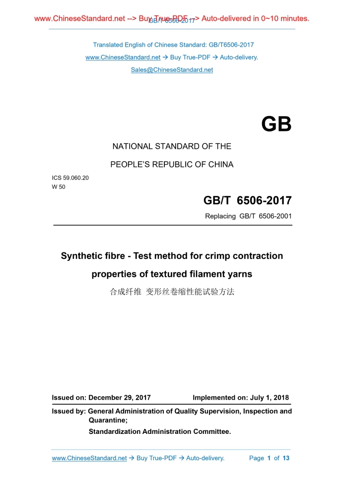 GB/T 6506-2017: Synthetic fibre - Test method for crimp contraction properties of textured filament yarns Delivery: 9 seconds. True-PDF full-copy in English & invoice will be downloaded + auto-delivered via email. See step-by-step procedure Status: Valid GB/T 6506: Historical versions