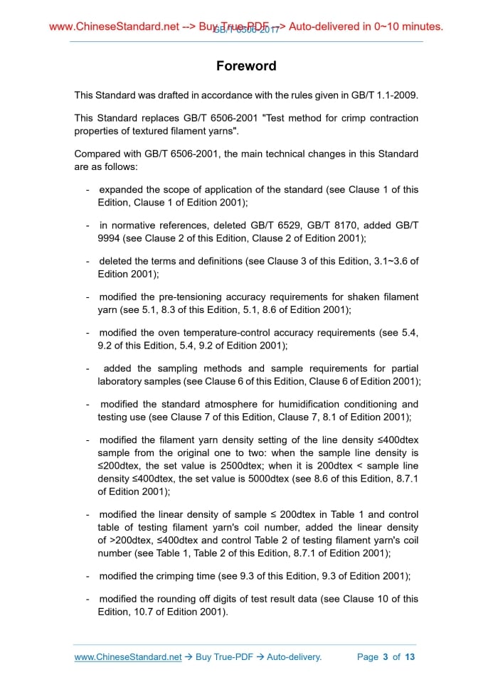 GB/T 6506-2017: Synthetic fibre - Test method for crimp contraction properties of textured filament yarns---This is an excerpt. Full copy of true-PDF in English version (including equations, symbols, images, flow-chart, tables, and figures etc.), auto-downloaded/delivered in 9 seconds, can be purchased online: https://www.ChineseStandard.net/PDF.aspx/GBT6506-2017 PEOPLE’S REPUBLIC OF CHINA ICS 59.060.20 W 50 GB/T 6506-2017 Replacing GB/T 6506-2001 Synthetic fibre - Test method for crimp contraction properties of textured filament yarns Issued on. December 29, 2017 Implemented on. July 1, 2018 Issued by. General Administration of Quality Supervision, Inspection and Quarantine; Standardization Administration Committee. Table of ContentsForeword ... 3 1 Scope ... 5 2 Normative references ... 5 3 Terms and definitions ... 5 4 Principle... 5 5 Instrument and device ... 6 6 Sampling ... 8 7 Standard atmosphere for humidity conditioning and testing use ... 8 8 Specimen preparation ... 8 9 Test procedures ... 10 10 Results calculation ... 11 11 Test report ... 12 Bibliography ... 13ForewordThis Standard was drafted in accordance with the rules given in GB/T 1.1-2009. This Standard replaces GB/T 6506-2001 "Test method for crimp contraction properties of textured filament yarns". Compared with GB/T 6506-2001, the main technical changes in this Standard are as follows. - expanded the scope of application of the standard (see Clause 1 of this Edition, Clause 1 of Edition 2001); - in normative references, deleted GB/T 6529, GB/T 8170, added GB/T 9994 (see Clause 2 of this Edition, Clause 2 of Edition 2001); - deleted the terms and definitions (see Clause 3 of this Edition, 3.1~3.6 of Edition 2001); modified the pre-tensioning accuracy requirements for shaken filament yarn (see 5.1, 8.3 of this Edition, 5.1, 8.6 of Edition 2001); modified the oven temperature-control accuracy requirements (see 5.4, 9.2 of this Edition, 5.4, 9.2 of Edition 2001); - added the sampling methods and sample requirements for partial laboratory samples (see Clause 6 of this Edition, Clause 6 of Edition 2001); modified the standard atmosphere for humidification conditioning and testing use (see Clause 7 of this Edition, Clause 7, 8.1 of Edition 2001); modified the filament yarn density setting of the line density ≤400dtex sample from the original one to two. when the sample line density is ≤200dtex, the set value is 2500dtex; when it is 200dtex < sample line density ≤400dtex, the set value is 5000dtex (see 8.6 of this Edition, 8.7.1 of Edition 2001); modified the linear density of sample ≤ 200dtex in Table 1 and control table of testing filament yarn's coil number, added the linear density of >200dtex, ≤400dtex and control Table 2 of testing filament yarn's coil number (see Table 1, Table 2 of this Edition, 8.7.1 of Edition 2001); modified the crimping time (see 9.3 of this Edition, 9.3 of Edition 2001); modified the rounding off digits of test result data (see Clause 10 of this Edition, 10.7 of Edition 2001). Synthetic fibre - Test method for crimp contraction properties of textured filament yarns1 ScopeThis Standard specifies the test methods for crimp contraction properties of textured filament yarns of synthetic fibre. This Standard is applicable to the textured filament yarns of synthetic fibre.2 Normative referencesThe following referenced documents are indispensable for the application of this document. For dated references, only the edition cited applies. For undated references, the latest edition of the referenced document (including any amendments) applies. GB/T 4146 (all parts), Textiles - Man-made fibers GB/T 6502, Sampling method of man-made filament yarns GB/T 9994, Conventional moisture regain of textiles GB/T 14343, Testing method for linear density of man-made filament yarns3 Terms and definitionsFor the purposes of this document, the terms and definitions defined in GB/T 4146 (all parts) apply.4 PrincipleSet a certain bus density of filament yarn. After the crimping process, load with the specified loading program then the length of the filament yarn shall change. By using the length of the filament yarn measured under the specified loading procedure, the indicators of crimp contraction properties such as crimping shrinkage CC, curl modulus CM, curl stability CS, etc. of the textured filament yarns can be calculated. The hammer for load application shall meet the following requirements. -no deformation at the specified temperature; -can meet the tension requirements of the loading program.6 Sampling6.1 Partial laboratory samples are extracted as required. 6.2 Batch laboratory sample extraction is according to GB/T 6502. Extract 20 packages. And randomly select 15 packages in the 20 packages. 6.3 The laboratory sample shall be taken from the same batch of stress decay time. If the laboratory sample is stored for more than 7 days, the effect of stress decay time on test results may not be considered.7 Standard atmosphere for humidity conditioning andtesting use 7.1 No humidity conditioning is required during testing. In the arbitration test, the vertical suspension made of textured filament yarn shall be added with 0.001 cN/dtex tension and humidity conditioning for 2h. 7.2 Specimen with a nominal moisture regain less than 4.5%. temperature of (20.0±2.0)°C, relative humidity of (65.0±5.0)%. Specimen with a fixed moisture regain of 4.5% or more. temperature of (20.0±2.0)°C, relative humidity of (65.0±3.0)%. The specific moisture regain of various fibers shall refer to GB/T 9994.8 Specimen preparation8.1 In addition to the nominal linear density of the known specimen, the linear density of the textured yarn is measured according to GB/T 14343, and the linear density is rounded to an integer. 8.2 For laboratory sample, shake 2 yarns per package. 8.3 Before removing the yarn, first remove at least 50 m of surface yarn on each package. The distance between the specimens must be at least 5 m. 8.4 Se