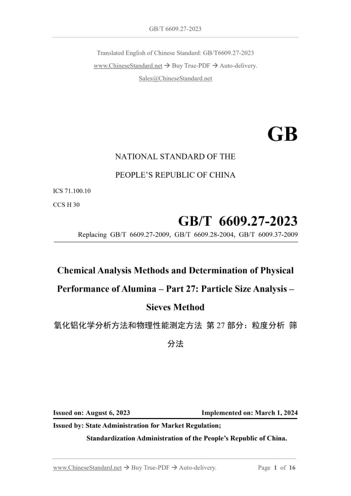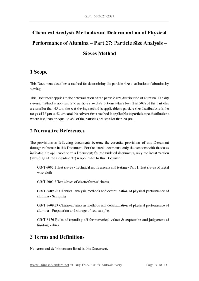 Similar standardsGB/T 6609.27-2023: Chemical analysis methods and determination of physical performance of alumina - Part 27: Particle size analysis - Sieves method---This is an excerpt. Full copy of true-PDF in English version (including equations, symbols, images, flow-chart, tables, and figures etc.), auto-downloaded/delivered in 9 seconds, can be purchased online: https://www.ChineseStandard.net/PDF.aspx/GBT6609.27-2023 GB NATIONAL STANDARD OF THE PEOPLE’S REPUBLIC OF CHINA ICS 71.100.10 CCS H 30 Replacing GB/T 6609.27-2009, GB/T 6609.28-2004, GB/T 6009.37-2009 Chemical Analysis Methods and Determination of Physical Performance of Alumina – Part 27.Particle Size Analysis – Sieves Method Issued on: AUGUST 6, 2023 Implemented on: MARCH 1, 2024 Issued by. State Administration for Market Regulation; Standardization Administration of the People’s Republic of China. Table of ContentsForeword... 3 Introduction... 6 1 Scope... 7 2 Normative References... 7 3 Terms and Definitions... 7 4 Sample... 8 5 Dry Sieving Method... 8 6 Wet Sieving Method... 10 7 Solvent Rinse Method... 13 8 Test Report... 15 Chemical Analysis Methods and Determination of Physical Performance of Alumina – Part 27.Particle Size Analysis – Sieves Method1 ScopeThis Document describes a method for determining the particle size distribution of alumina by sieving. This Document applies to the determination of the particle size distribution of alumina. The dry sieving method is applicable to particle size distributions where less than 50% of the particles are smaller than 45 μm; the wet sieving method is applicable to particle size distributions in the range of 16 μm to 63 μm; and the solvent rinse method is applicable to particle size distributions where less than or equal to 4% of the particles are smaller than 20 μm.2 Normative ReferencesThe provisions in following documents become the essential provisions of this Document through reference in this Document. For the dated documents, only the versions with the dates indicated are applicable to this Document; for the undated documents, only the latest version (including all the amendments) is applicable to this Document. GB/T 6003.1 Test sieves - Technical requirements and testing - Part 1.Test sieves of metal wire cloth GB/T 6003.3 Test sieves of electroformed sheets GB/T 6609.22 Chemical analysis methods and determination of physical performance of alumina - Sampling GB/T 6609.23 Chemical analysis methods and determination of physical performance of alumina - Preparation and storage of test samples GB/T 8170 Rules of rounding off for numerical values & expression and judgement of limiting values3 Terms and DefinitionsNo terms and definitions are listed in this Document.4 SampleSampling shall be carried out in accordance with the provisions of GB/T 6609.22; and the preparation and storage of specimen shall be carried out in accordance with the original sample specified in GB/T 6609.23.5 Dry Sieving Method5.1 Principle of method The test materials are forced through each level of the sieve by mechanically vibrating the test sieve. The mass of the test materials on each test sieve and on the sieve bottom is weighed, and the ratio of the mass to the total mass is the particle size distribution of the sample. 5.2 Apparatus 5.2.1 Test Sieve. The test sieve is circular, 200 mm in diameter, 50 mm or 75 mm in height, and includes a lid and sieve bottom. The lid, test sieve, and sieve bottom constitute a screening test system. The sieve is constructed of smooth metal wire or square-hole sheet, with mesh deviations conforming to the provisions of GB/T 6003.1 or GB/T 6003.3, respectively. The mesh sizes are 150 μm, 106 μm, 75 μm, 53 μm, and 45 μm. 5.2.2 Sieve vibrator. Provides horizontal rotation and vertical vibration. 5.2.3 Electronic balance. Accuracy 0.01 g. 5.2.4 Oven. Controllable temperature 110°C ± 5°C. 5.2.5 Ultrasonic cleaner. Sufficient volume to completely submerge the test sieve vertically. 5.2.6 Optical microscope. Desktop or portable, capable of magnification of 100× or more. 5.3 Test procedure 5.3.1 Preparation of test sieve Before the measurement, calibrate the test sieve using an optical microscope (5.2.6). If the pore blockage rate is no greater than 10%, it shall be used for the measurement. Otherwise, clean the test sieve in an ultrasonic cleaner (5.2.5) for 3 to 5 min to remove any surface debris. Place the test sieve in an oven (5.2.4) and dry at 110°C ± 5°C drying for 2 h. Remove and cool to room temperature. Weigh the mass (m1) of each test sieve (or sieve bottom) on an electronic balance (5.2.3), accurate to 0.01 g. 5.3.2 Test material Where. m4 - Mass of the test sieve and remaining test material, in g; m3 - Mass of the test sieve, in g; m0 - Mass of the test material, in g. Numerical rounding shall be performed in accordance with the provisions of GB/T 8170. Calculated results shall be expressed to two digits after the decimal point.7 Solvent Rinse Method7.1 Principle Wash the alumina sample with acetone and pass it through a 20 μm electroformed sieve. After drying at 300°C, calculate the content of the material on the sieve. 7.2 Reagents 7.2.1 Acetone. Analytically pure. Acetone is flammable and shall be used in a fume hood. 7.2.2 Desiccant. Activated alumina or molecular sieves are suitable; silica gel is not suitable. 7.2.3 Ethanol. Industrial pure. 7.3 Apparatus 7.3.1 Test Sieve. Meet the requirements of GB/T 6003.3, with a diameter of 75 mm to 150 mm, an electroformed sieve with a sieve aperture of 20 μm and circular mesh. 7.3.2 Brush. The material shall be resistant to acetone corrosion. 7.3.3 Oven. Oven with air circulation, capable of controlling to 300°C ± 10°C. 7.3.4 Vacuum dryer. 7.3.5 Platinum Crucible. Two crucibles, approximately 35 mm in diameter and 40 mm in height, with a capacity of 25 mL and lids. These are designated Platinum Crucible A and Platinum Crucible B. 7.3.6 Wash Bottle. A polyethylene bottle s