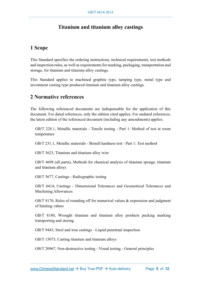 GB/T 6614-2014: Titanium and titanium alloy castings---This is an excerpt. Full copy of true-PDF in English version (including equations, symbols, images, flow-chart, tables, and figures etc.), auto-downloaded/delivered in 9 seconds, can be purchased online: https://www.ChineseStandard.net/PDF.aspx/GBT6614-2014NATIONAL STANDARD OF THE PEOPLE’S REPUBLIC OF CHINA ICS 77.120.50 J 31 Replacing GB/T 6614-1994 Titanium and titanium alloy castings Issued on: SEPTEMBER 03, 2014 Implemented on: JUNE 01, 2015 Issued by. General Administration of Quality Supervision, Inspection and Quarantine; Standardization Administration of the People’s Republic of China. Table of ContentsForeword... 3 1 Scope... 5 2 Normative references... 5 3 Ordering instructions... 6 4 Technical requirements... 6 5 Test methods... 9 6 Inspection rules... 10 7 Marking, quality certificate, packaging, transportation and storage... 12 Titanium and titanium alloy castings1 ScopeThis Standard specifies the ordering instructions, technical requirements, test methods and inspection rules, as well as requirements for marking, packaging, transportation and storage, for titanium and titanium alloy castings. This Standard applies to machined graphite type, tamping type, metal type and investment casting type produced titanium and titanium alloy castings.2 Normative referencesThe following referenced documents are indispensable for the application of this document. For dated references, only the edition cited applies. For undated references, the latest edition of the referenced document (including any amendments) applies. GB/T 228.1, Metallic materials - Tensile testing - Part 1.Method of test at room temperature GB/T 231.1, Metallic materials - Brinell hardness test - Part 1.Test method GB/T 3623, Titanium and titanium alloy wire GB/T 4698 (all parts), Methods for chemical analysis of titanium sponge, titanium and titanium alloys GB/T 5677, Castings - Radiographic testing GB/T 6414, Castings - Dimensional Tolerances and Geometrical Tolerances and Machining Allowances GB/T 8170, Rules of rounding off for numerical values & expression and judgment of limiting values GB/T 8180, Wrought titanium and titanium alloy products packing marking transporting and storing GB/T 9443, Steel and iron castings - Liquid penetrant inspection GB/T 15073, Casting titanium and titanium alloys GB/T 20967, Non-destructive testing - Visual testing - General principles3 Ordering instructionsThe contract or order form for ordering castings shall state the following. a) name and number of this Standard; b) product name, designation or code, supply state, casting quantity and drawing number; c) technical requirements and acceptance criteria; d) other matters that need to be explained.4 Technical requirements4.1 Materials 4.1.1 The master alloy ingots used for smelting and pouring shall be smelted by vacuum arc remelting, induced electricity, plasma arc, induction condensing shell, electron beam melting and other methods 4.1.2 When using sponge titanium as the raw material, the master alloy ingot shall be smelted at least twice. 4.1.3 It is allowed to use the processed return material of the same designation as the raw material. 4.2 Supply state 4.2.1 Castings can be supplied in the following states. as-cast (C), annealed (M), hot isostatic pressing (HIP) or hot isostatic pressing (HIP) + annealed (M), etc. 4.2.2 When the buyer has special requirements for the supply state of castings, it shall be negotiated by both parties, and shall be indicated in the contract or technical agreement. 4.3 Chemical compositions The chemical compositions of castings shall comply with the provisions of GB/T 15073. 4.4 Mechanical properties 4.4.1 The room temperature mechanical properties of the attached casting samples of the castings shall meet the requirements in Table 1. 4.4.2 Sampling from the body of the casting is allowed, where the sampling locations and room temperature mechanical property indexes shall be agreed upon by both parties. 4.6.3 Castings are not allowed to have cracks and penetrating defects; the requirements for the sealing surface of the castings shall be indicated in the drawing, contract or technical agreement. 4.6.4 Other surface defects shall meet the visual acceptance criteria listed in the contract or technical agreement. 4.6.5 When the buyer has special requirements for the surface quality of castings, it shall be negotiated by both parties. 4.6.6 When it is required by the buyer and indicated in the contract or technical agreement, the surface of the casting can be subjected to a non-destructive inspection in accordance with GB/T 9443 or agreed upon by both parties. 4.7 Internal quality When it is required by the buyer and indicated in the contract or technical agreement, the castings can be subjected to a radiographic inspection, where the inspection methods and quality judgment standards shall be in accordance with the requirements of GB/T 5677, or shall be negotiated by both the supplier and the buyer. For thick and large castings that are difficult to inspect by radiography, other inspection methods can be used, and the specific inspection methods and quality judgment standards shall be negotiated by both parties. 4.8 Welding repair 4.8.1 Except for the parts that are not allowed to be repaired -- required by the parts drawings, contracts or technical agreements -- all exposed pores, shrinkage holes, porosity, cracks, inclusions and dimensional defects after grinding on the casting are allowed to be repaired by welding. Before welding repair, the defective parts shall be thoroughly cleaned until the bright metal surface is exposed. 4.8.2 Defects exposed during processing, or defects found by radiographic inspection, can be repaired by welding as needed. 4.8.3 Welding repair shall be carried out under vacuum or argon protection; the solder joints shall not have oxidative bluing. 4.8.4 The filler wire shall generally be made of the material of the