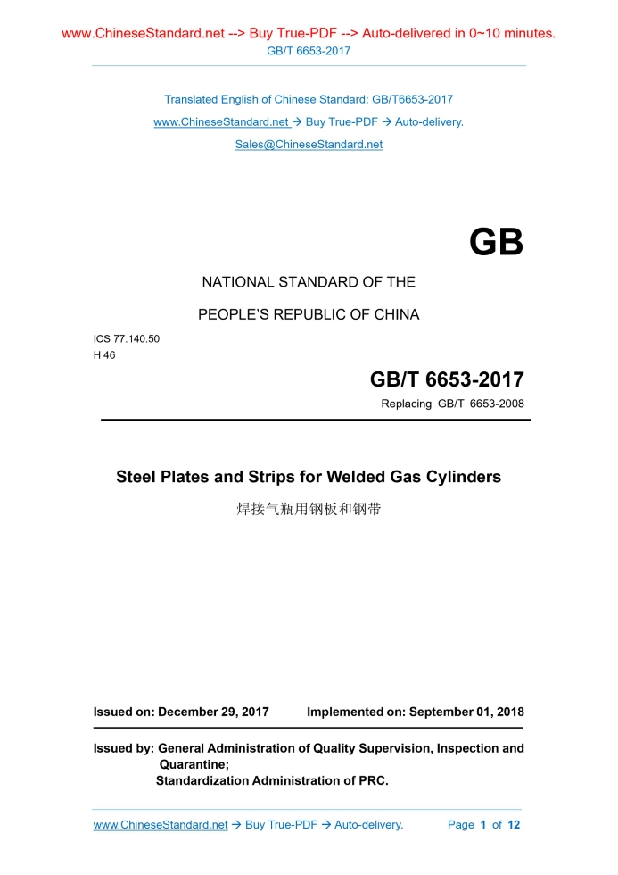 GB/T 6653-2017: Steel Plates and Strips for Welded Gas Cylinders Delivery: 9 seconds. True-PDF full-copy in English & invoice will be downloaded + auto-delivered via email. See step-by-step procedure Status: Valid GB/T 6653: Historical versions