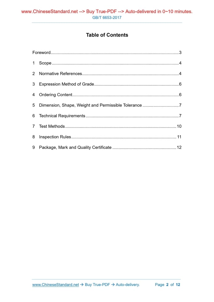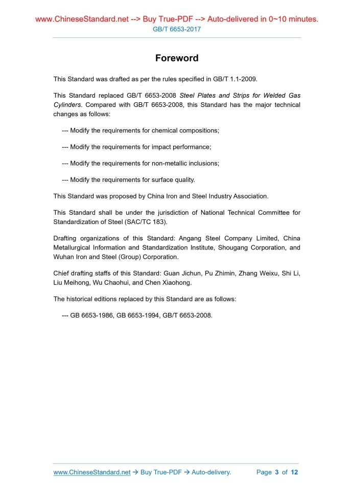 GB/T 6653-2017: Steel Plates and Strips for Welded Gas Cylinders---This is an excerpt. Full copy of true-PDF in English version (including equations, symbols, images, flow-chart, tables, and figures etc.), auto-downloaded/delivered in 9 seconds, can be purchased online: https://www.ChineseStandard.net/PDF.aspx/GBT6653-2017PEOPLE’S REPUBLIC OF CHINA ICS 77.140.50 H 46 GB/T 6653-2017 Replacing GB/T 6653-2008 Steel Plates and Strips for Welded Gas Cylinders Issued on. December 29, 2017 Implemented on. September 01, 2018 Issued by. General Administration of Quality Supervision, Inspection and Quarantine; Standardization Administration of PRC. Foreword ... 3 1 Scope ... 4 2 Normative References ... 4 3 Expression Method of Grade ... 6 4 Ordering Content ... 6 5 Dimension, Shape, Weight and Permissible Tolerance ... 7 6 Technical Requirements ... 7 7 Test Methods ... 10 8 Inspection Rules ... 11 9 Package, Markand Quality Certificate ... 12 This Standard was drafted as per the rules specified in GB/T 1.1-2009. This Standard replaced GB/T 6653-2008 Steel Plates and Strips for Welded Gas Cylinders. Compared with GB/T 6653-2008, this Standard has the major technical changes as follows. --- Modify the requirements for chemical compositions; --- Modify the requirements for impact performance; --- Modify the requirements for non-metallic inclusions; --- Modify the requirements for surface quality. This Standard was proposed by China Iron and Steel Industry Association. This Standard shall be under the jurisdiction of National Technical Committee for Standardization of Steel (SAC/TC 183). Drafting organizations of this Standard. Angang Steel Company Limited, China Metallurgical Information and Standardization Institute, Shougang Corporation, and Wuhan Iron and Steel (Group) Corporation. Chief drafting staffs of this Standard. Guan Jichun, Pu Zhimin, Zhang Weixu, Shi Li, Liu Meihong, Wu Chaohui, and Chen Xiaohong. The historical editions replaced by this Standard are as follows. --- GB 6653-1986, GB 6653-1994, GB/T 6653-2008. 1 ScopeThis Standard specifies the dimension, shape, weight and permissible deviation, technical requirements, test methods, inspection rules, package, mark and quality certificate of steel plates and strips for welded gas cylinders. This Standard is applicable to the hot-rolled steel plates and strips with thickness of 2.0mm~14.0mm, and cold-rolled steel plates and strips with thickness of 1.5mm~4.0mm used for the welded gas cylinder.2 Normative ReferencesThe following documents are essential to the application of this document. For the dated documents, only the versions with the dates indicated are applicable to this document; for the undated documents, only the latest version (including all the amendments) are applicable to this document. GB/T 222 Permissible Tolerances for Chemical Composition of Steel Products GB/T 223.9 Iron and Steel – Determination of Aluminum Content – Chromazurol S Photometric Method GB/T 223.12 Methods for Chemical Analysis of Iron, Steel and Alloy - The Sodium Carbonate Separation-Diphenyl Carbazide Photometric Method for the Determination of Chromium Content GB/T 223.14 Methods for Chemical Analysis of Iron, Steel and Alloy -The NBenzoy-N-Phenylhydroxylamine Extraction Photometric Method for the Determination of Vanadium Content GB/T 223.16 Methods for Chemical Analysis of Iron, Steel and Alloy -The Chromotropic Acid Photometric Method for the Determination of Titaninm Content GB/T 223.19 Methods for Chemical Analysis of Iron, Steel and Alloy -The Neocuproine-Chloroform Extraction Photometric Method for the Determination of Copper Content GB/T 223.23 Iron, Steel and Alloy-Determination of Nickel Content -The Dimethylglyoxime Spectrophotometric Method GB/T 223.40 Iron, Steel and Alloy -Determination of Niobium Content by the Sulphochlorophenol S Spectrophotometric Method GB/T 223.49 Methods for Chemical Analysis of Iron, Steel and Alloy - Extraction Separation -Chlorophosphonazo Ma Spectrophotometric Method for the Determination of the Total Rare Earth Content GB/T 223.59 Iron, Steel and Alloy -Determination of Phosphorus Content Bismuth Phosphomolybdate Blue Spectrophotometric Method and Antimony Phosphomolybdate Blue Spectrophotometric Method GB/T 223.60 Methods for Chemical Analysis of Iron, Steel and Alloy -The Perchloric Acid Dehydration Gravimetric Method for the Determination of Silicon Content GB/T 223.63 Methods for Chemical Analysis of Iron, Steel and Alloy -The Sodium(Potassium)Periodate Photometric Method for the Determination of Manganese Content GB/T 223.68 Methods for Chemical Analysis of Iron, Steel and Alloy -The Potassium Iodate Titration Method after Combustion in the Pipe Furnace for the Determination of Sulfur Content GB/T 223.69 Iron, Steel and Alloy -Determination of Carbon Contents -Gas-volumetric Method after Combustion in the Pipe Furnace GB/T 228.1 Metallic Materials -Tensile Testing - Part 1. Method of Test at Room Temperature GB/T 229 Metallic Materials – Charpy Notch Impact Test GB/T 232 Metallic Materials – Bend Test GB/T 247 General Rule of Acceptance, Package, Mark and Certification for Steel Plates (Sheets) and Strips GB/T 708 Dimension, Shape, Weight and Tolerance for Cold-Rolled Steel Plates and Strips GB/T 709 Dimension, Shape, Weight and Tolerance for Hot-Rolled Steel Plates and Strips GB/T 2975 Steel and Steel Products -Location and Preparation of Test Pieces for Mechanical Testing GB/T 6394 Metal – Methods for Estimating the Average Grain Size GB/T 8170 Rules of Rounding off for Numerical Values & Expression and Judgement of Limiting Values GB/T 10561 Steel -Determination of Content of Nonmetallic Inclusions - Micrographic Method Using Standards Diagrams GB/T 14977 General Requirements for Surface Condition of Hot-Rolled Steel Plates GB/T 17505 Steel and Steel Products – General Technical Delivery Requirements GB/T 20066 Steel and Iron-Sampling and Preparation of Samples for the Determination of Ch