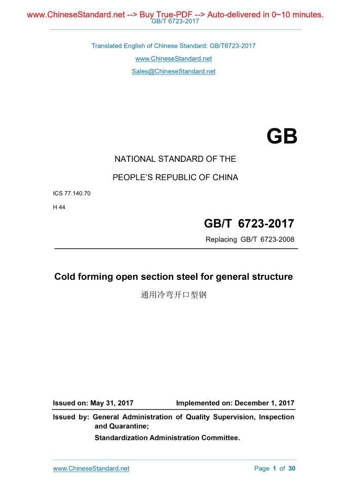 GB/T 6723-2017: Cold forming open section steel for general structure Delivery: 9 seconds. True-PDF full-copy in English & invoice will be downloaded + auto-delivered via email. See step-by-step procedure Status: Valid GB/T 6723: Historical versions