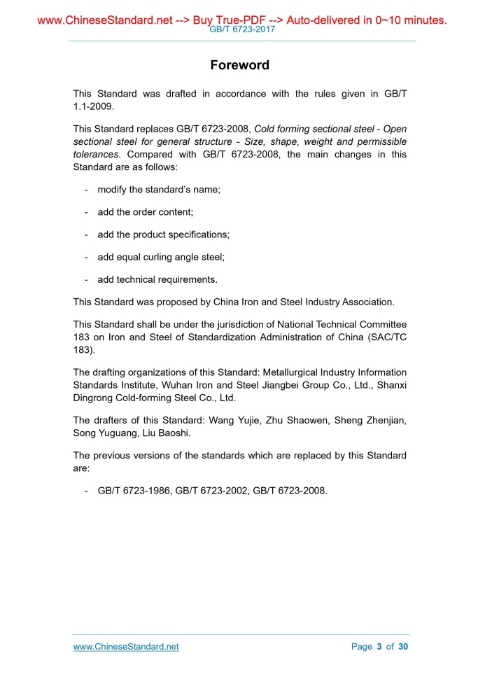 GB/T 6723-2017: Cold forming open section steel for general structure---This is an excerpt. Full copy of true-PDF in English version (including equations, symbols, images, flow-chart, tables, and figures etc.), auto-downloaded/delivered in 9 seconds, can be purchased online: https://www.ChineseStandard.net/PDF.aspx/GBT6723-2017NATIONAL STANDARD OF THE PEOPLE’S REPUBLIC OF CHINA ICS 77.140.70 H 44 Replacing GB/T 6723-2008 Cold forming open section steel for general structure Issued on. MAY 31, 2017 Implemented on. DECEMBER 1, 2017 Issued by. General Administration of Quality Supervision, Inspection and Quarantine; Standardization Administration Committee. Table of ContentsForeword... 3 1 Scope... 4 2 Normative references... 4 3 Order content... 4 4 Classification and code... 4 5 Cross-section size and allowable deviation... 5 6 Length and allowable deviation... 28 7 Shape... 29 8 Technical requirements... 30 9 Weight... 30 10 Marking examples... 30ForewordThis Standard was drafted in accordance with the rules given in GB/T 1.1-2009. This Standard replaces GB/T 6723-2008, Cold forming sectional steel - Open sectional steel for general structure - Size, shape, weight and permissible tolerances. Compared with GB/T 6723-2008, the main changes in this Standard are as follows. - modify the standard’s name; - add the order content; - add the product specifications; - add equal curling angle steel; - add technical requirements. This Standard was proposed by China Iron and Steel Industry Association. This Standard shall be under the jurisdiction of National Technical Committee 183 on Iron and Steel of Standardization Administration of China (SAC/TC 183). The drafting organizations of this Standard. Metallurgical Industry Information Standards Institute, Wuhan Iron and Steel Jiangbei Group Co., Ltd., Shanxi Dingrong Cold-forming Steel Co., Ltd. The drafters of this Standard. Wang Yujie, Zhu Shaowen, Sheng Zhenjian, Song Yuguang, Liu Baoshi. The previous versions of the standards which are replaced by this Standard are. - GB/T 6723-1986, GB/T 6723-2002, GB/T 6723-2008. Cold forming open section steel for general structure1 ScopeThis Standard specifies the order content, classification, code, section size and allowable deviation, length and allowable deviation, shape, technical requirements, weight and marking examples of cold forming open section steel for general structure. This Standard is applicable to cold forming open section steel (hereinafter referred to as section steel) which is produced on continuous roll cold bending unit by cold-rolled or hot-rolled steel sheets.2 Normative referencesThe following documents are indispensable for the application of this document. For dated references, only the dated version applies to this document. For undated references, the latest edition (including all amendments) applies to this document. GB/T 6725, General requirements of cold forming steel sections3 Order contentThe contract or order in accordance with this Standard shall include the following contents.4 Classification and codeThe section steels, according to their cross-section shapes, are divided into 9 types, and their codes are.5 Cross-section size and allowable deviation5.1 Cross-section shape and labeling of the section steel The cross-section shape and labeling of the section steel are shown in Figure 1 ~ Figure 9. 5.2 Size, theoretical weight, cross-section area and main parameters of the section steel 5.4 Size allowable deviation 5.4.1 The allowable deviation of the non-free side length of the section steel shall comply with the requirements of Table 11. 5.4.2 The allowable deviation of the free side length of the section steel shall comply with the requirements of Table 12. 5.4.3 When the nominal sizes of two free side lengths are equal, the actual size difference shall not exceed 75% of the allowance. When the nominal sizes of the two free side lengths are not equal, execute according to the allowable deviation of the larger side length. 5.5 Allowable deviation of bending angle The length allowable deviation of the bending angle shall comply with the requirements of Table 13. 5.6 Measuring position The size of the section steel shall be measured at not less than 100 mm from the end.6 Length and allowable deviation6.1 The general length of section steel is 4 000 mm ~ 16 000 mm. 6.2 When the steel is delivered in fixed-length or multiple-length, it shall be indicated in the contract. 6.3 Section steel is allowed to be delivered in short-length and non-fixed length not less than 2 000 mm, or in the form of interface-pipe; however, the buyer shall cut off the interface-pipe when using.7 Shape7.1 The bending degree of section steel shall not exceed 2 mm per meter; the total bending shall not exceed 0.2% of the total length. 7.2 The flatness of the flat section of the steel shall not exceed 0.6% of the side length, but shall be at least 0.4 mm. 7.4 The end of the section steel shall be straight; it is allowed to have minor deformations and burrs which are caused by cutting.8 Technical requirementsThe designation and chemical composition (melting analysis), mechanical property, process performance, surface quality, etc. of the section steel shall meet the requirements of GB/T 6725.9 WeightSection steels can be delivered according to the actual weight and the theoretical weight.10 Marking examplesA cold forming inside curling channel steel, that is made of designation-Q345 with a height of 160 mm, a middle-leg side-length of 60 mm, a small-leg side-length of 20 mm, and a wall thickness of 3 mm, is marked as. ......Source: Above contents are excerpted from the full-copy PDF -- translated/reviewed by: www.ChineseStandard.net / Wayne Zheng et al. Tips & Frequently Asked Questions:Question 1: How long will the true-PDF of English version of GB/T 6723-2017 be delivered?Answer: The full copy PDF of English version of GB/T 6723-2017 can be downloaded in 9 seconds, and it will also be emailed to you
