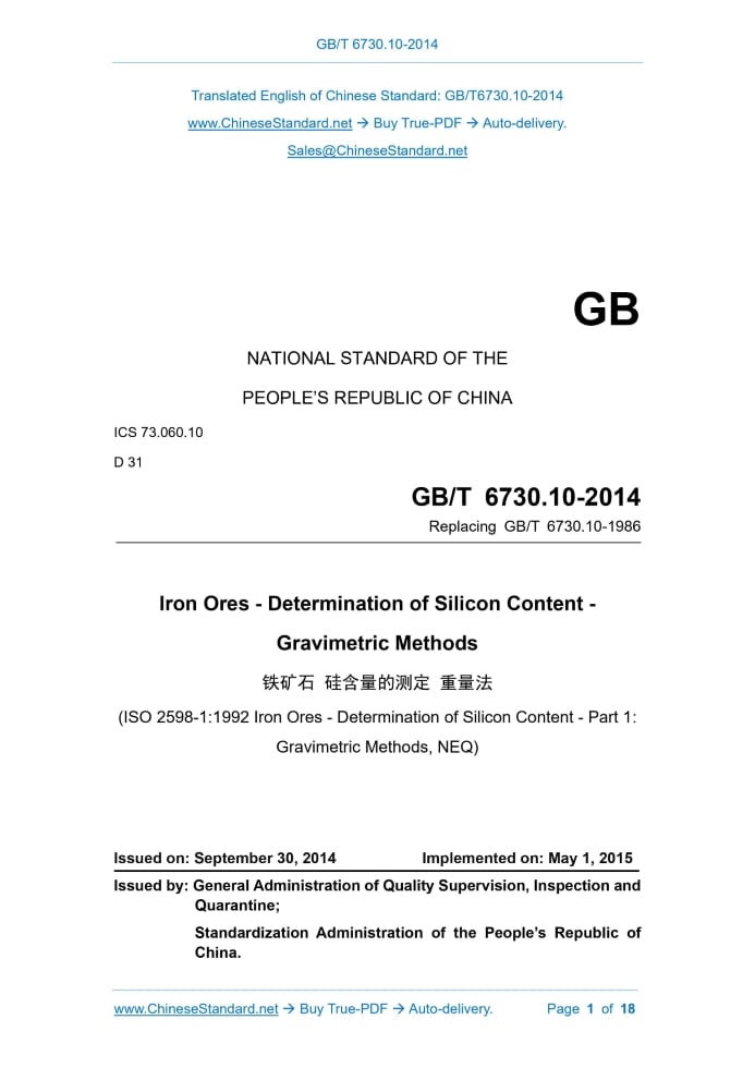GB/T 6730.10-2014: Iron ores -- Determination of silicon content -- Gravimetric methods Delivery: 9 seconds. True-PDF full-copy in English & invoice will be downloaded + auto-delivered via email. See step-by-step procedure Status: Valid GB/T 6730.10: Historical versions