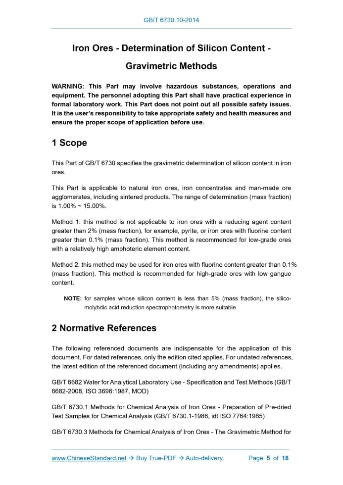 Similar standardsGB/T 6730.10-2014: Iron ores -- Determination of silicon content -- Gravimetric methods---This is an excerpt. Full copy of true-PDF in English version (including equations, symbols, images, flow-chart, tables, and figures etc.), auto-downloaded/delivered in 9 seconds, can be purchased online: https://www.ChineseStandard.net/PDF.aspx/GBT6730.10-2014GB NATIONAL STANDARD OF THE PEOPLE’S REPUBLIC OF CHINA ICS 73.060.10 D 31 Replacing GB/T 6730.10-1986 Iron Ores - Determination of Silicon Content - Gravimetric Methods (ISO 2598-1.1992 Iron Ores - Determination of Silicon Content - Part 1. Gravimetric Methods, NEQ) Issued on. SEPTEMBER 30, 2014 Implemented on. MAY 1, 2015 Issued by. General Administration of Quality Supervision, Inspection and Quarantine; Standardization Administration of the People’s Republic of China. Table of ContentsForeword... 3 1 Scope... 5 2 Normative References... 5 3 Principle... 6 4 Reagents and Materials... 6 5 Instruments... 7 6 Test Portion... 7 7 Analytical Procedures... 8 8 Result Calculation... 12 9 Test Report... 15 Appendix A (Normative) Flow Chart of Specimen Analytical Value Acceptance Procedure... 16 Appendix B (Informative) Formula Derivation of Repeatability and Tolerance 17 Appendix C (Informative) Precision Data Obtained in International Analytical Tests... 18ForewordGB/T 6730 Iron Ores is divided into 64 parts. This is Part 10 of GB/T 6730. This Part was drafted in accordance with the rules provided in GB/T 1.1-2009. This Part serves as a replacement of GB/T 6730.10-1986 Methods for Chemical Analysis of Iron Ores - The Gravimetric Method for the Determination of Silicon Content. In comparison with GB/T 6730.10-1986, apart from editorial modifications, the main technical changes are as follows. ---In the previous version, the specimen is decomposed with hydrochloric acid, and the residue is melted with a mixed solvent of sodium carbonate and boric acid. In this Part, two methods are used for the decomposition of the test portion. Method 1 uses sodium peroxide to melt and decompose, then, uses hydrochloric acid and perchloric acid for treatment; Method 2 uses hydrochloric acid, nitric acid and perchloric acid (if necessary, including boric acid) to dissolve, and evaporates, until it emits perchloric acid fumes; then, filters the silica precipitate together with all residues; uses sodium carbonate to melt it, and dissolves it in hydrochloric acid and perchloric acid. ---The range of determination is modified from 1.50% ~ 25.00% to 1.00% ~ 15.00%. ---In the previous version, in terms of data processing, rounding off the result data in accordance with the numerical rounding-off rules is only mentioned, without making a specific statement. After the revision, specific requirements are made for the data rounding-off rules. ---The clause of safety warning is added. ---Specific requirements for the content of the test report are added. This Part uses the re-drafting method and takes ISO 2598-1.1992 Iron Ores - Determination of Silicon Content - Part 1.Gravimetric Methods as a reference in the formulation. The degree of consistency with ISO 2598-1.1992 is non-equivalent. In comparison with ISO 2598-1.1992, the technical differences and the causes for the differences are as follows. ---In terms of Normative References, this Part makes adjustments with technical differences to adapt to the technical conditions of China. The adjustment is intensively reflected in Chapter 2 “Normative References”. See the specific adjustment below. The reference of GB/T 6682 is added (see Chapter 4); GB/T 6730.1, which equivalently adopts international standard, is used to replace ISO 7764 (see 6.1); GB/T 6730.3, which equivalently adopts international standard, is used to replace ISO 2596 (see 6.2.1); GB/T 10322.1, which equivalently adopts international standard, is used to replace ISO 3082 (see 6.1); GB/T 12806, which non-equivalently adopts international standard, is used to replace ISO 1042 (see Chapter 5); GB/T 12808, which equivalently adopts international standard, is used to replace ISO 648 (see Chapter 5). ---In the final result calculation in 8.2.3, the expression of ISO 2598-1.1992 is modified in accordance with the expression mode of the current Chinese standard, so as to be more consistent with the customs of China and facilitate the application. This Part was proposed by China Iron and Steel Association. This Part shall be under the jurisdiction of National Technical Committee 317 on Iron Ores and Directly Reduced Iron of Standardization Administration of China (SAC/TC 317). The drafting organizations of this Part. ANSTEEL Group Mining Corporation Limited; Shanghai Entry-Exit Inspection and Quarantine Bureau; Magang (Group) Holding Co., Ltd.; China Metallurgical Information and Standardization Institute. The main drafters of this Part. Tian Hong, Chen Zhihua, Gao Jingjun, Ren Liping, Cheng Jianping, Sun Deming, Yao Qiang. The issuing of the previous versions. ---GB/T 1368-1978, GB/T 6730.10-1986. Iron Ores - Determination of Silicon Content - Gravimetric Methods WARNING. This Part may involve hazardous substances, operations and equipment. The personnel adopting this Part shall have practical experience in formal laboratory work. This Part does not point out all possible safety issues. It is the user’s responsibility to take appropriate safety and health measures and ensure the proper scope of application before use.1 ScopeThis Part of GB/T 6730 specifies the gravimetric determination of silicon content in iron ores. This Part is applicable to natural iron ores, iron concentrates and man-made ore agglomerates, including sintered products. The range of determination (mass fraction) is 1.00% ~ 15.00%. Method 1.this method is not applicable to iron ores with a reducing agent content greater than 2% (mass fraction), for example, pyrite, or iron ores with fluorine content greater than 0.1% (mass fraction). This method is recommended for low-grad