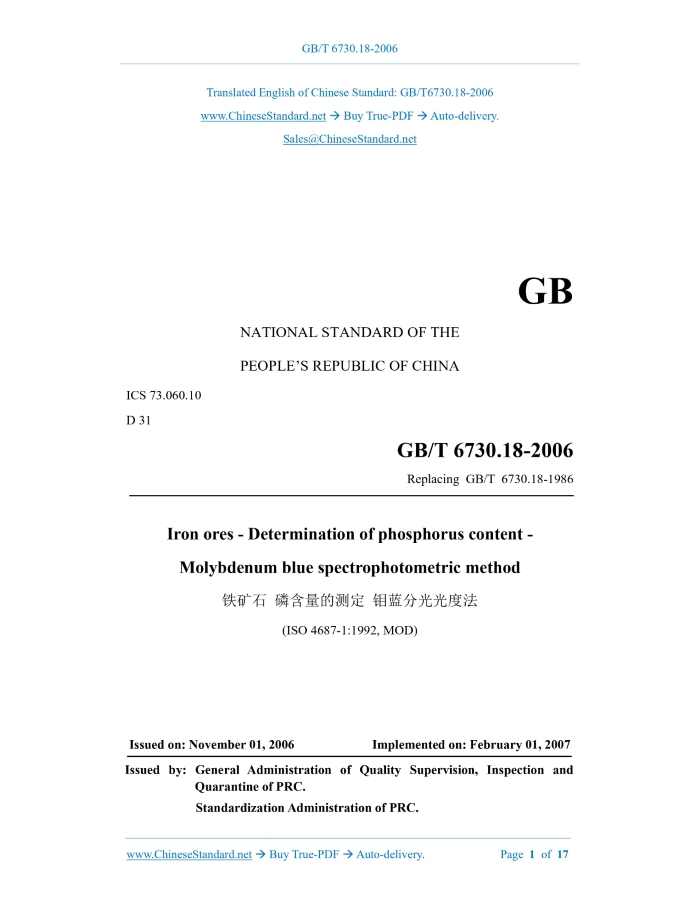 GB/T 6730.18-2006: Iron ores -- Determination of phosphorus content -- Molybdenum blue spectrophotometric method Delivery: 9 seconds. True-PDF full-copy in English & invoice will be downloaded + auto-delivered via email. See step-by-step procedure Status: Valid GB/T 6730.18: Historical versions