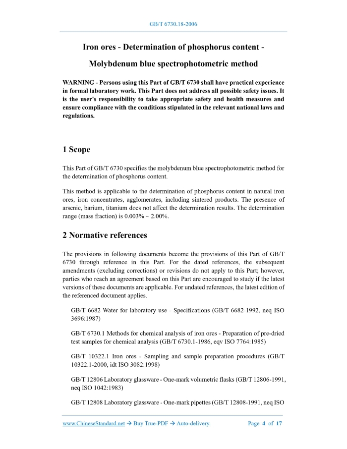 Similar standardsGB/T 6730.18-2006: Iron ores -- Determination of phosphorus content -- Molybdenum blue spectrophotometric method---This is an excerpt. Full copy of true-PDF in English version (including equations, symbols, images, flow-chart, tables, and figures etc.), auto-downloaded/delivered in 9 seconds, can be purchased online: https://www.ChineseStandard.net/PDF.aspx/GBT6730.18-2006 GB NATIONAL STANDARD OF THE PEOPLE’S REPUBLIC OF CHINA ICS 73.060.10 D 31 Replacing GB/T 6730.18-1986 Iron ores - Determination of phosphorus content - Molybdenum blue spectrophotometric method (ISO 4687-1:1992, MOD) ISSUED ON: NOVEMBER 01, 2006 IMPLEMENTED ON: FEBRUARY 01, 2007 Issued by: General Administration of Quality Supervision, Inspection and Quarantine of PRC. Standardization Administration of PRC. Table of ContentsForeword ... 3 1 Scope ... 4 2 Normative references ... 4 3 Principles ... 5 4 Reagents ... 5 5 Instrumentation ... 6 6 Sampling and specimen preparation ... 7 7 Analytical procedures ... 7 8 Calculation of results ... 10 9 Test report ... 14 Appendix A (Normative) Flowchart of acceptance procedure for specimen analysis value ... 15 Appendix B (Informative) Derivation of repeatability and tolerance formula ... 16 Appendix C (Informative) Precision data for international analytical tests ... 17 Iron ores - Determination of phosphorus content - Molybdenum blue spectrophotometric method WARNING - Persons using this Part of GB/T 6730 shall have practical experience in formal laboratory work. This Part does not address all possible safety issues. It is the user's responsibility to take appropriate safety and health measures and ensure compliance with the conditions stipulated in the relevant national laws and regulations.1 ScopeThis Part of GB/T 6730 specifies the molybdenum blue spectrophotometric method for the determination of phosphorus content. This method is applicable to the determination of phosphorus content in natural iron ores, iron concentrates, agglomerates, including sintered products. The presence of arsenic, barium, titanium does not affect the determination results. The determination range (mass fraction) is 0.003% ~ 2.00%.2 Normative referencesThe provisions in following documents become the provisions of this Part of GB/T 6730 through reference in this Part. For the dated references, the subsequent amendments (excluding corrections) or revisions do not apply to this Part; however, parties who reach an agreement based on this Part are encouraged to study if the latest versions of these documents are applicable. For undated references, the latest edition of the referenced document applies. GB/T 6682 Water for laboratory use - Specifications (GB/T 6682-1992, neq ISO 3696:1987) GB/T 6730.1 Methods for chemical analysis of iron ores - Preparation of pre-dried test samples for chemical analysis (GB/T 6730.1-1986, eqv ISO 7764:1985) GB/T 10322.1 Iron ores - Sampling and sample preparation procedures (GB/T 10322.1-2000, idt ISO 3082:1998) GB/T 12806 Laboratory glassware - One-mark volumetric flasks (GB/T 12806-1991, neq ISO 1042:1983) GB/T 12808 Laboratory glassware - One-mark pipettes (GB/T 12808-1991, neq ISO 4.7 Sodium sulfite solution, 100 g/L. The solution must be prepared immediately for use; a sufficient amount is prepared at one time, according to the number of tests to be done. 4.8 Hydrazine sulfate solution, 2 g/L. The solution must be prepared immediately for use; a sufficient amount is prepared at one time, according to the number of tests to be done. 4.9 Bottom fluid Weigh 1.6 g of sodium carbonate (4.1) and 0.8 g of sodium tetraborate (4.2), into a 250 mL beaker. Add 40 mL of water. Carefully add 70 mL of hydrochloric acid (4.4), while stirring it continuously. Heat and boil for 1 min. After cooling, transfer to a 200 mL one-mark volumetric flask. Use water to dilute to the mark. Mix well. 4.10 Ammonium molybdate solution, 20 g/L. Dissolve 20 g of ammonium molybdate [(NH4)6Mo7O24 • 4H2O] in 500 mL of water. After dissolution, slowly add 250 mL of 72% (mass fraction) perchloric acid or 325 mL of 60% (mass fraction) perchloric acid (4.5). After mixing and cooling, transfer to a 1000 mL one-mark volumetric flask. Use water to dilute it to the mark. 4.11 Phosphorus standard solution, 20 µg/mL. Dry the standard potassium dihydrogen phosphate (99.99%) at 110 °C to a constant weight. Put it in a desiccator, to cool it to room temperature. Weigh 0.2197 g and dissolve in water. Transfer to a 250 mL one-mark volumetric flask. Use water to dilute to the mark. Mix well. Then pipette 25.0 mL of this solution into a 250 mL one-mark volumetric flask. Use water to dilute to the mark. Mix well.5 InstrumentationOne-mark pipettes and one-mark volumetric flasks shall comply with the provisions of GB/T 12806 and GB/T 12808, respectively. General laboratory instruments and: 5.1 Platinum or platinum alloy crucible, the volume of which is not less than 25 mL. 5.2 Muffle furnace, which can provide a temperature of 1020 °C. 5.3 Heating plate with magnetic stirring function. 5.4 Stirring rod, which is sealed with polytetrafluoroethylene plastic, 1.0 cm long. 5.5 Water bath device, which can be used at boiling temperature. 5.6 Spectrophotometer, which is suitable for measuring absorbance at 820 nm.6 Sampling and specimen preparation6.1 Laboratory samples Take samples and prepare specimen, according to GB/T 10322.1. Generally, the specimen particle size shall be less than 100 µm. If the content of hydrated water or easily oxidized substances in the specimen is high, the particle size shall be less than 160 µm. Note 1: Please refer to GB/T 6730.1, for specific instructions on hygroscopic moisture or easily oxidized compounds. 6.2 Preparation of pre-dried specimens Mix the laboratory samples thoroughly. Take samples by fractional division method. According to the requirements in GB/T 6730.1, dry the specimen at a temperature of 105 °C ± 2 °C.7 Analytical procedures7.1 Number of mea