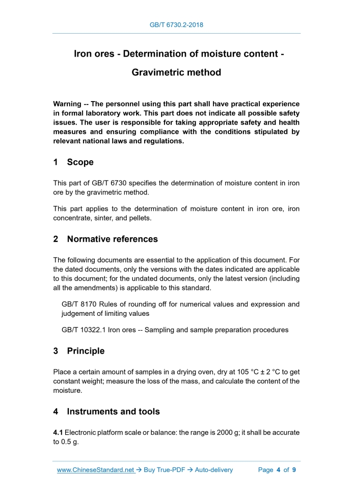GB/T 6730.2-2018: Iron ores -- Determination of moisture content -- Gravimetric method Delivery: 9 seconds. True-PDF full-copy in English & invoice will be downloaded + auto-delivered via email. See step-by-step procedure Status: Valid GB/T 6730.2: Historical versions
