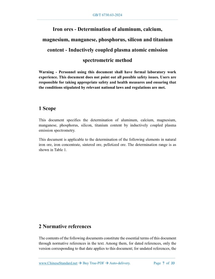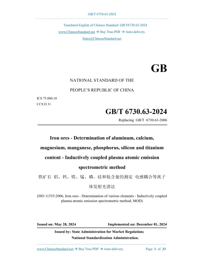 GB/T 6730.63-2024: Iron ores - Determination of aluminum, calcium, magnesium, manganese, phosphorus, silicon and titanium content - Inductively coupled plasma atomic emission spectrometric method Delivery: 9 seconds. True-PDF full-copy in English & invoice will be downloaded + auto-delivered via email. See step-by-step procedure Status: Valid GB/T 6730.63: Historical versions