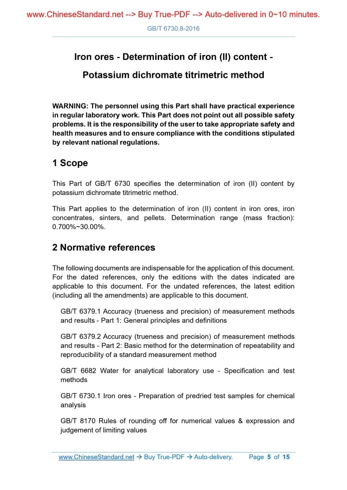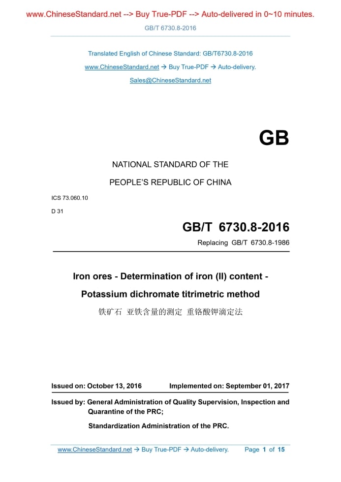 GB/T 6730.8-2016: Iron ores - Determination of iron (II) content - Potassium dichromate titrimetric method Delivery: 9 seconds. True-PDF full-copy in English & invoice will be downloaded + auto-delivered via email. See step-by-step procedure Status: Valid GB/T 6730.8: Historical versions