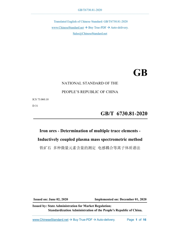 GB NATIONAL STANDARD OF THE PEOPLE’S REPUBLIC OF CHINA ICS 73.060.10 D 31 GB/T 6730.81-2020 Iron ores - Determination of multiple trace elements - Inductively coupled plasma mass spectrometric method ISSUED ON: JUNE 02, 2020 IMPLEMENTED ON: DECEMBER 01, 2020 Issued by: State Administration for Market Regulation; Standardization Administration of the People’s Republic of China.