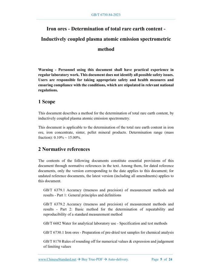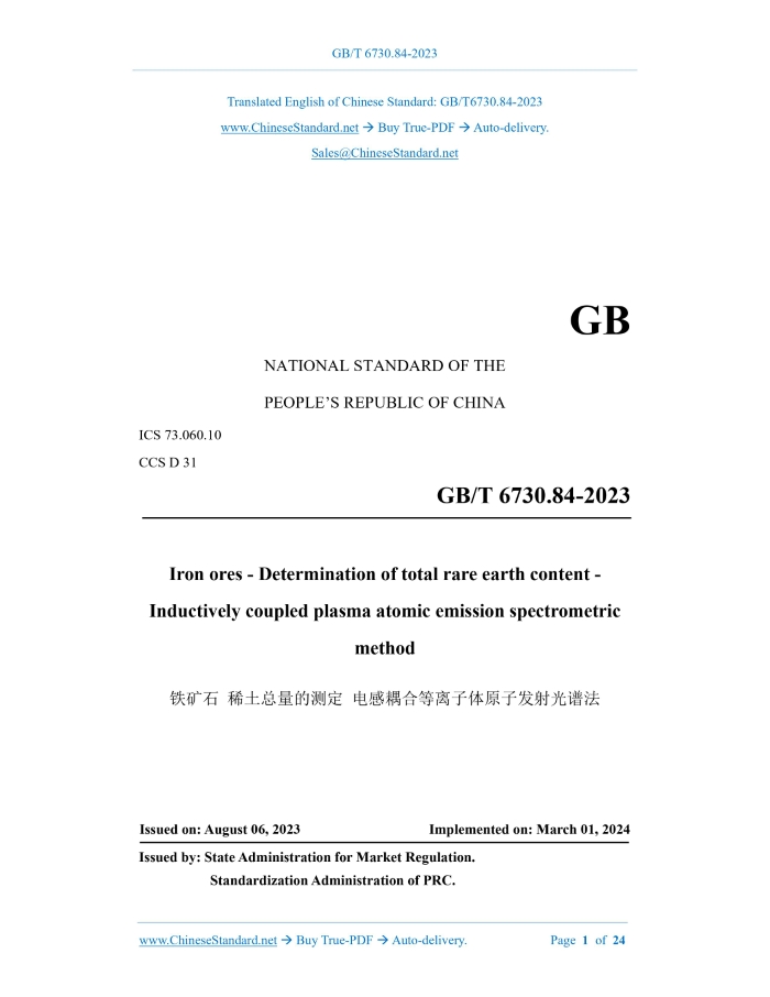 GB/T 6730.84-2023: Iron ores - Determination of total rare earth content - Inductively coupled plasma atomic emission spectrometric method Delivery: 9 seconds. True-PDF full-copy in English & invoice will be downloaded + auto-delivered via email. See step-by-step procedure Status: Valid