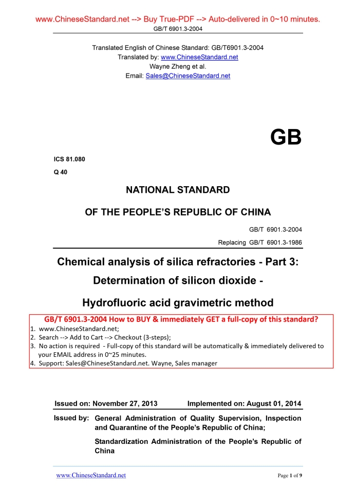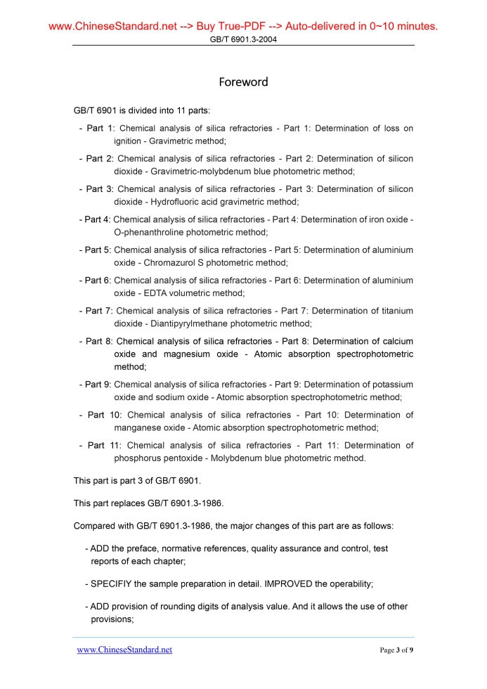 GB/T 6901.3-2004: Chemical analysis of silica refractories -- Part 3: Determination of silicon dioxide -- Hydrofluoric acid gravimetric method Delivery: 9 seconds. True-PDF full-copy in English & invoice will be downloaded + auto-delivered via email. See step-by-step procedure Status: Obsolete GB/T 6901.3: Historical versions