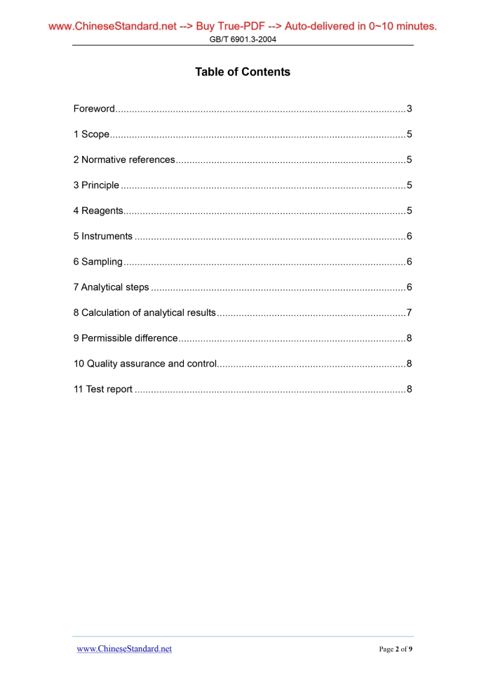 GB/T 6901.3-2004: Chemical analysis of silica refractories -- Part 3: Determination of silicon dioxide -- Hydrofluoric acid gravimetric method---This is an excerpt. Full copy of true-PDF in English version (including equations, symbols, images, flow-chart, tables, and figures etc.), auto-downloaded/delivered in 9 seconds, can be purchased online: https://www.ChineseStandard.net/PDF.aspx/GBT6901.3-2004 GB ICS 81.080 Q 40 NATIONAL STANDARD Replacing GB/T 6901.3-1986 Chemical analysis of silica refractories - Part 3. Determination of silicon dioxide - Hydrofluoric acid gravimetric method Issued on: NOVEMBER 27, 2013 Implemented on: AUGUST 01, 2014 Issued by. General Administration of Quality Supervision, Inspection and Quarantine of the People’s Republic of China; Standardization Administration of the People’s Republic of China Table of ContentsForeword... 3 1 Scope... 5 2 Normative references... 5 3 Principle... 5 4 Reagents... 5 5 Instruments... 6 6 Sampling... 6 7 Analytical steps... 6 8 Calculation of analytical results... 7 9 Permissible difference... 8 10 Quality assurance and control... 8 11 Test report... 8ForewordGB/T 6901 is divided into 11 parts. - Part 1.Chemical analysis of silica refractories - Part 1.Determination of loss on ignition - Gravimetric method; - Part 2.Chemical analysis of silica refractories - Part 2.Determination of silicon dioxide - Gravimetric-molybdenum blue photometric method; - Part 3.Chemical analysis of silica refractories - Part 3.Determination of silicon dioxide - Hydrofluoric acid gravimetric method; - Part 4.Chemical analysis of silica refractories - Part 4.Determination of iron oxide - O-phenanthroline photometric method; - Part 5.Chemical analysis of silica refractories - Part 5.Determination of aluminium oxide - Chromazurol S photometric method; - Part 6.Chemical analysis of silica refractories - Part 6.Determination of aluminium oxide - EDTA volumetric method; - Part 7.Chemical analysis of silica refractories - Part 7.Determination of titanium dioxide - Diantipyrylmethane photometric method; - Part 8.Chemical analysis of silica refractories - Part 8.Determination of calcium oxide and magnesium oxide - Atomic absorption spectrophotometric method; - Part 9.Chemical analysis of silica refractories - Part 9.Determination of potassium oxide and sodium oxide - Atomic absorption spectrophotometric method; - Part 10.Chemical analysis of silica refractories - Part 10.Determination of manganese oxide - Atomic absorption spectrophotometric method; - Part 11.Chemical analysis of silica refractories - Part 11.Determination of phosphorus pentoxide - Molybdenum blue photometric method. This part is part 3 of GB/T 6901. This part replaces GB/T 6901.3-1986. Compared with GB/T 6901.3-1986, the major changes of this part are as follows. - ADD the preface, normative references, quality assurance and control, test reports of each chapter; - SPECIFIY the sample preparation in detail. IMPROVED the operability; - ADD provision of rounding digits of analysis value. And it allows the use of other provisions; - According to GB/T 1.1-2000 and GB/T 20001.4-2001, ADJUST the structure and format of this part. This part was proposed by China Iron and Steel Association. This part shall be administered by National Refractories Standardization Technical Committee refractories (SAC/TC 193). Drafting organizations of this part. Luoyang Institute of Refractories Research, Shanxi Xixiaoping Refractories Co., Ltd., and Chongqing Special Steel Co. The main drafters of this part. Liang Xianlei, Guo Qiuhong, Zhang Huirong, Deng Xiangqing, and Tang Shubeng. The previous version replaced by this part is. - GB/T 6901.3-1986. Chemical analysis of silica refractories - Part 3. Determination of silicon dioxide - Hydrofluoric acid gravimetric method1 ScopeThis part specifies the hydrofluoric acid gravimetric method to determine silicon dioxide. This part applies to the determination of silicon dioxide in silica refractories. Measuring range (mass fraction) is greater than 95.00%.2 Normative referencesGB/T 6901.1-2004 Chemical analysis of silica refractories - Part 1.Determination of loss on ignition - Gravimetric method GB/T 8170 Rules of rounding off for numerical values & expression and judgement of limiting values GB/T 10325 Shaped refractory products - Rule of acceptance, sampling and inspection GB/T 17617 Refractory products - Sampling of raw materials and unshaped products3 PrincipleAfter the sample is burned to the constant, USE hydrofluoric acid and nitric acid to dissolve. EVAPORATE it to remove the silicon. Then USE nitrate to remove fluoride. BURN at 1000 °C - 1100 °C to constant weight. The difference between the 2 weighings is the amount of silicon dioxide.4 Reagents4.1 Nitrate (ρ1, 42 g/mL). 4.2 Hydrofluoric acid (40%). - Test date. ......Source: Above contents are excerpted from the full-copy PDF -- translated/reviewed by: www.ChineseStandard.net / Wayne Zheng et al. Tips & Frequently Asked Questions:Question 1: How long will the true-PDF of English version of GB/T 6901.3-2004 be delivered?Answer: The full copy PDF of English version of GB/T 6901.3-2004 can be downloaded in 9 seconds, and it will also be emailed to you in 9 seconds (double mechanisms to ensure the delivery reliably), with PDF-invoice.Question 2: Can I share the purchased PDF of GB/T 6901.3-2004_English with my colleagues?Answer: Yes. The purchased PDF of GB/T 6901.3-2004_English will be deemed to be sold to your employer/organization who actually paid for it, including your colleagues and your employer's intranet.Question 3: Does the price include tax/VAT?Answer: Yes. Our tax invoice, downloaded/delivered in 9 seconds, includes all tax/VAT and complies with 100+ countries' tax regulations (tax exempted in 100+ countries) -- See Avoidance of Double Taxation Agreements (DTAs): List of DTAs signed between Singapore and 100+ countriesQuestion 4: Do you accept my currency other than USD?Answer: Yes. www.ChineseSt