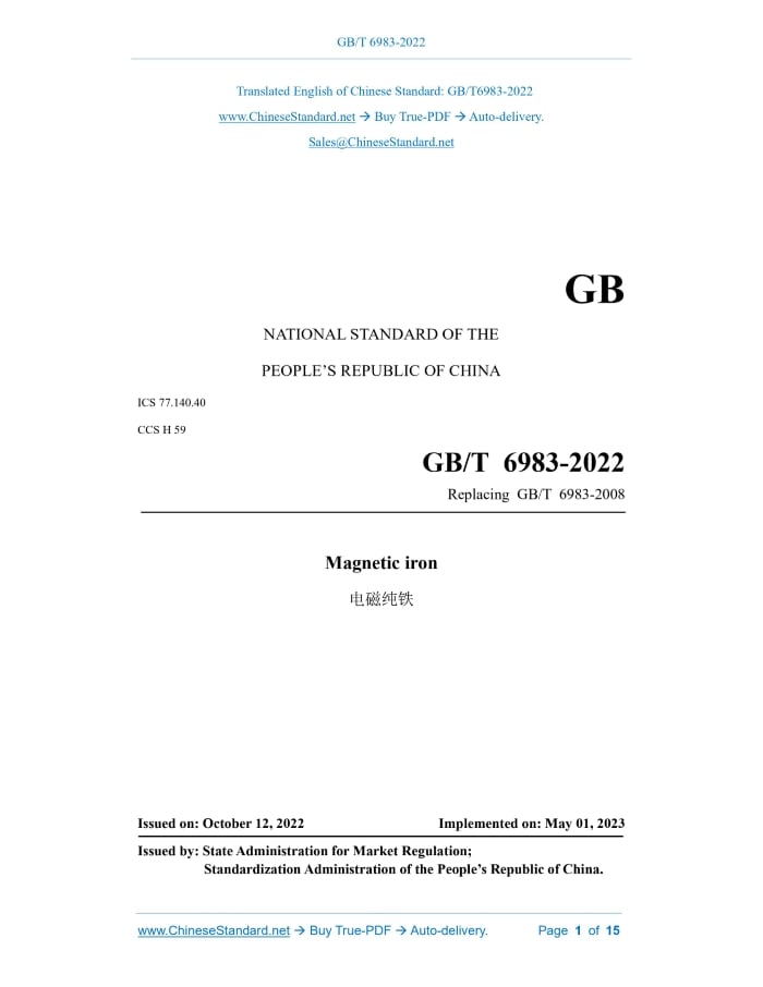 GB/T 6983-2022: Magnetic iron Delivery: 9 seconds. True-PDF full-copy in English & invoice will be downloaded + auto-delivered via email. See step-by-step procedure Status: Valid GB/T 6983: Historical versions