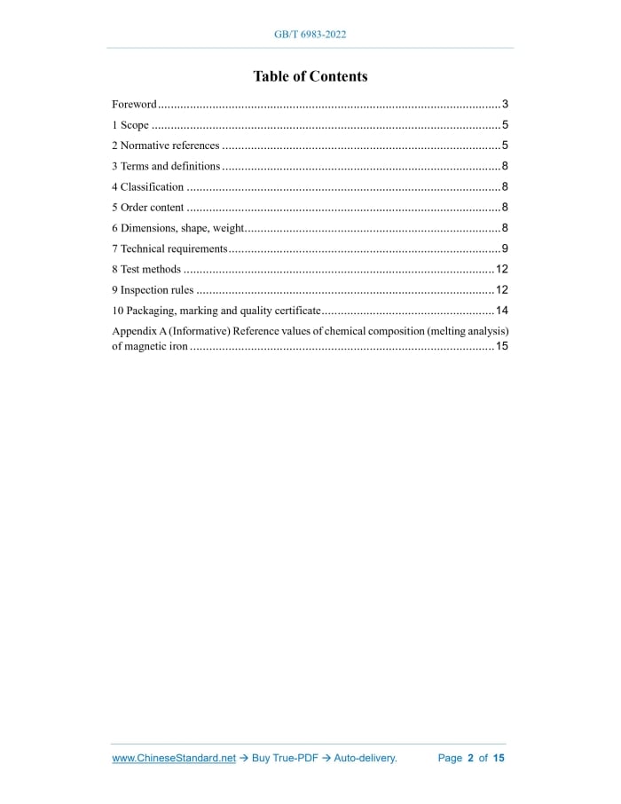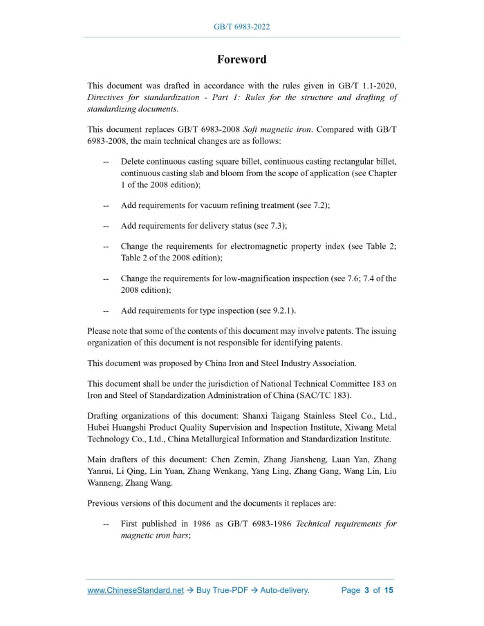 Similar standardsGB/T 6983-2022: Magnetic iron---This is an excerpt. Full copy of true-PDF in English version (including equations, symbols, images, flow-chart, tables, and figures etc.), auto-downloaded/delivered in 9 seconds, can be purchased online: https://www.ChineseStandard.net/PDF.aspx/GBT6983-2022GB NATIONAL STANDARD OF THE PEOPLE’S REPUBLIC OF CHINA ICS 77.140.40 CCS H 59 Replacing GB/T 6983-2008 Magnetic iron ISSUED ON: OCTOBER 12, 2022 IMPLEMENTED ON: MAY 01, 2023 Issued by: State Administration for Market Regulation; Standardization Administration of the People’s Republic of China. Table of ContentsForeword ... 3 1 Scope ... 5 2 Normative references ... 5 3 Terms and definitions ... 8 4 Classification ... 8 5 Order content ... 8 6 Dimensions, shape, weight ... 8 7 Technical requirements ... 9 8 Test methods ... 12 9 Inspection rules ... 12 10 Packaging, marking and quality certificate ... 14 Appendix A (Informative) Reference values of chemical composition (melting analysis) of magnetic iron ... 15ForewordThis document was drafted in accordance with the rules given in GB/T 1.1-2020, Directives for standardization - Part 1: Rules for the structure and drafting of standardizing documents. This document replaces GB/T 6983-2008 Soft magnetic iron. Compared with GB/T 6983-2008, the main technical changes are as follows: -- Delete continuous casting square billet, continuous casting rectangular billet, continuous casting slab and bloom from the scope of application (see Chapter 1 of the 2008 edition); -- Add requirements for vacuum refining treatment (see 7.2); -- Add requirements for delivery status (see 7.3); -- Change the requirements for electromagnetic property index (see Table 2; Table 2 of the 2008 edition); -- Change the requirements for low-magnification inspection (see 7.6; 7.4 of the 2008 edition); -- Add requirements for type inspection (see 9.2.1). Please note that some of the contents of this document may involve patents. The issuing organization of this document is not responsible for identifying patents. This document was proposed by China Iron and Steel Industry Association. This document shall be under the jurisdiction of National Technical Committee 183 on Iron and Steel of Standardization Administration of China (SAC/TC 183). Drafting organizations of this document: Shanxi Taigang Stainless Steel Co., Ltd., Hubei Huangshi Product Quality Supervision and Inspection Institute, Xiwang Metal Technology Co., Ltd., China Metallurgical Information and Standardization Institute. Main drafters of this document: Chen Zemin, Zhang Jiansheng, Luan Yan, Zhang Yanrui, Li Qing, Lin Yuan, Zhang Wenkang, Yang Ling, Zhang Gang, Wang Lin, Liu Wanneng, Zhang Wang. Previous versions of this document and the documents it replaces are: -- First published in 1986 as GB/T 6983-1986 Technical requirements for magnetic iron bars; Magnetic iron1 ScopeThis document specifies the classification, size, shape, weight, technical requirements, test methods, inspection rules, packaging, marking and quality certificate of magnetic iron. This document is applicable to magnetic iron hot-rolled (forged) bars (square, round, flat), hot-rolled wire rods, cold-drawn round bars, hot-rolled plates (strips), and cold- rolled plates (strips). Note: Magnetic iron is also called soft magnet internationally.2 Normative referencesThe following documents are referred to in the text in such a way that some or all of their content constitutes requirements of this document. For dated references, only the version corresponding to that date is applicable to this document; for undated references, the latest version (including all amendments) is applicable to this document. GB/T 223.5, Steel and iron - Determination of acid-soluble silicon and total silicon content - Reduced molybdosilicate spectrophotometric method GB/T 223.8, Methods for chemical analysis of iron, steel and alloy - The sodium fluoride separation - EDTA titration method for the determination of aluminium content GB/T 223.9, Iron, steel and alloy - Determination of aluminum content - Chrom azurol S photometric method GB/T 223.12, Methods for chemical analysis of iron, steel and alloy - The sodium carbonate separation-diphenyl carbazide photometric method for the determination of chromium content GB/T 223.19, Methods for chemical analysis of iron, steel and alloy - The neocuproine-chloroform extraction photometric method for the determination of copper content GB/T 223.23, Iron, steel and alloy - Determination of nickel content - The dimethylglyoxime spectrophotometric method GB/T 20125, Low-alloy steel - Determination of multi-element contents - Inductively coupled plasma atomic emission spectrometric method GB/T 20126, Unalloyed steel - Determination of low carbon content - Part 2: Infrared absorption method after combustion in an induction furnace (with preheating)3 Terms and definitionsNo terms and definitions need to be defined in this document.4 ClassificationMagnetic iron is divided into hot-rolled (forged) bars (square, round, flat), hot-rolled wire rods, cold-drawn round bars, hot-rolled plates (strips), and cold-rolled plates (strips).5 Order contentThe contract or order for goods placed in accordance with this document shall include the following: a) a reference to this document; b) product name: c) product designation; d) electromagnetic property; e) delivery weight; f) dimensions; g) delivery status; h) special requirements.6 Dimensions, shape, weight6.1 Dimensions and shape The dimensions, shape and allowable deviation of magnetic iron shall comply with the provisions of Table 1. As required by the buyer and, after negotiation between the 7.8.2 The magnetic iron cold-rolled plates (strips) delivered in the softened annealed state shall be subjected to surface hardness test. Three points of each sample shall be measured and the average value shall be taken as the measurement result of a single sample. The Vickers hardness value (HV5) sh