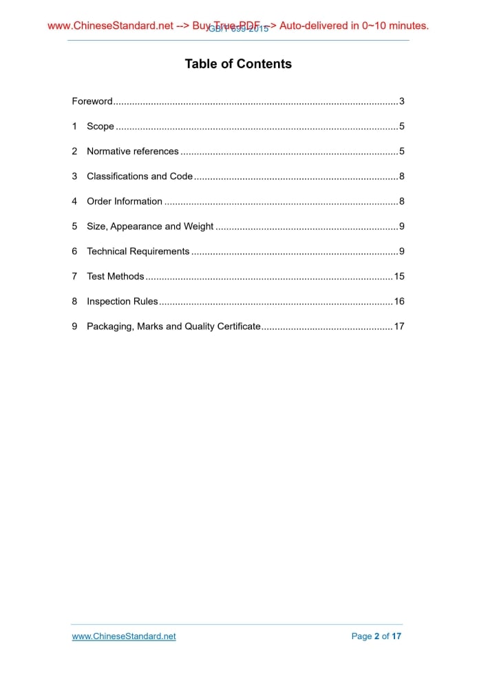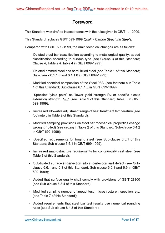 GB/T 699-2015: Quality carbon structure steels---This is an excerpt. Full copy of true-PDF in English version (including equations, symbols, images, flow-chart, tables, and figures etc.), auto-downloaded/delivered in 9 seconds, can be purchased online: https://www.ChineseStandard.net/PDF.aspx/GBT699-2015GB NATIONAL STANDARD OF THE PEOPLE’S REPUBLIC OF CHINA ICS 77.140.45 H 40 Replacing GB/T 699-1999 Quality carbon structure steels Issued on: DECEMBER 10, 2015 Implemented on: NOVEMBER 1, 2016 Issued by. General Administration of Quality Supervision, Inspection and Quarantine; Standardization Administration Committee. Table of ContentsForeword... 3 1 Scope... 5 2 Normative references... 5 3 Classifications and Code... 8 4 Order Information... 8 5 Size, Appearance and Weight... 9 6 Technical Requirements... 9 7 Test Methods... 15 8 Inspection Rules... 16 9 Packaging, Marks and Quality Certificate... 17ForewordThis Standard was drafted in accordance with the rules given in GB/T 1.1-2009. This Standard replaces GB/T 699-1999 Quality Carbon Structural Steels. Compared with GB/T 699-1999, the main technical changes are as follows. - Deleted steel bar classification according to metallurgical quality; added classification according to surface type (see Clause 3 of this Standard; Clause 4, Table 2 & Table 4 in GB/T 699-1999); - Deleted rimmed steel and semi-killed steel (see Table 1 of this Standard; Sub-clause 6.1.1.6 and 6.1.1.8 in GB/T 699-1999); - Modified chemical composition of the Steel 08Al (see footnote c in Table 1 of this Standard; Sub-clause 6.1.1.5 in GB/T 699-1999); - Specified “yield point” as “lower yield strength Rel or specific plastic extension strength Rp0.2” (see Table 2 of this Standard; Table 3 in GB/T 699-1999); - Increased allowable adjustment range of heat treatment temperature (see footnote c in Table 2 of this Standard); - Modified sampling provisions on steel bar mechanical properties change wrought (rolled) (see setting in Table 2 of this Standard; Sub-clause 6.4.2 in GB/T 699-1999); - Specified requirements for forging steel (see Sub-clause 6.5.1 of this Standard; Sub-clause 6.5.1 in GB/T 699-1999); - Increased macrostructure requirements for continuously cast steel (see Table 3 of this Standard); - Subdivided surface imperfection into imperfection and defect (see Sub- clause 6.6.1 and 6.8 of this Standard; Sub-clause 6.6.1 and 6.9 in GB/T 699-1999); - Added that surface quality shall comply with provisions of GB/T 28300 (see Sub-clause 6.8.4 of this Standard). - Modified sampling number of impact test, microstructure inspection, etc. (see Table 7 of this Standard); - Added requirements that steel bar test results use numerical rounding rules (see Sub-clause 8.4.3 of this Standard). This Standard was proposed by China Iron and Steel Association. This Standard shall be under the jurisdiction of the Technical Committee on Steel of Standardization Committee of China (SAC/TC 183). The main drafting organizations of this Standard. Information Standard Institute of the Ministry of Metallurgical Industry, Shijiazhuang Iron and Steel Co., Ltd., Fujian Province Sanming Steel (Group) Co., Ltd., Tianjin Iron and Steel Group Co., Ltd., Daye Special Steel Co., Ltd., Shougang Group, Qingdao Iron and Steel Co., Ltd. Main drafters of this Standard. Luan Yan, Dai Qiang, Meng Ruiying, Liu Jianfeng, Liu Guihua, Sun Zhicheng, Gong Cui, Hu Haiping, Liu Junhui, Yan Chengming, Deng Zhiyong. This Standard replaces the following previous standards. - GB 699-1965, GB 699-1988, GB/T 699-1999. Quality Carbon Structural Steels1 ScopeThis Standard specifies classification and code, order information, size, appearance and weight, technical requirements, test methods, inspection rules, packaging, marks and quality certificate of quality carbon structural steel bars. This Standard is applicable to hot-rolled or forged quality carbon structural steel bars of which nominal diameter or thickness is not greater than 250 mm. Hot- rolled or forged quality carbon structural steel bars of which nominal diameter or thickness is greater than 250 mm shall also be supplied, as agreed between the buyer and the supplier (hereinafter referred to as steel bars) The designations and chemical composition specified in this Standard are also applicable to steel ingots, steel billets, steels and its products of other cross- sections.2 Normative referencesThe following referenced documents are indispensable for the application of this document. For dated references, only the edition cited applies. For undated references, the latest edition of the referenced document (including any amendments) applies. GB/T 222 Method of sampling steel for determination of chemical composition and permissible variations for product analysis GB/T 223.5 Steel and iron - Determination of acid-soluble silicon and total silicon content - Reduced molybdosilicate spectrophotometric method GB/T 223.11 Iron steel and alloy--Determination of chromium content - Visual titration or potentiometric titration method GB/T 223.19 Methods for chemical analysis of iron steel and alloy - The neocuproine-chloroform extraction photometric method for the determination of copper content GB/T 223.23 Iron steel and alloy - Determination of nickel content - The dimethylglyoxime spectrophotometric method GB/T 223.59 Iron, steel and alloy - Determination of phosphorus content - Bismuth phosphomolybdate blue spectrophotometric method and antimony phosphomolybdate blue spectrophotometric method GB/T 223.63 Methods for chemical analysis of iron, steel and alloy - The sodium (potassium) periodate photometric method for the determination of manganese content GB/T 223.79 Iron and steel - Determination of multi-element contents - X- ray fluorescence spectrometry (Routine method) GB/T 223.81 Iron steel and alloy - Determination of total aluminum and total boron contents - Microwave digestion-inductively coupled plasma mass spectrometric method GB/T 223.85 Steel an