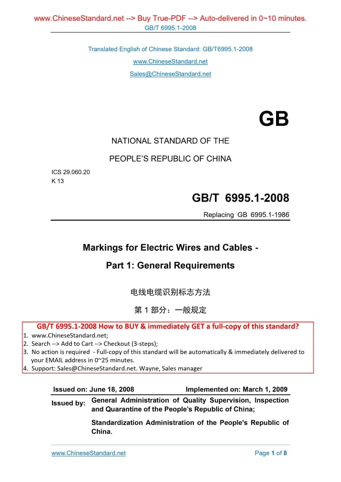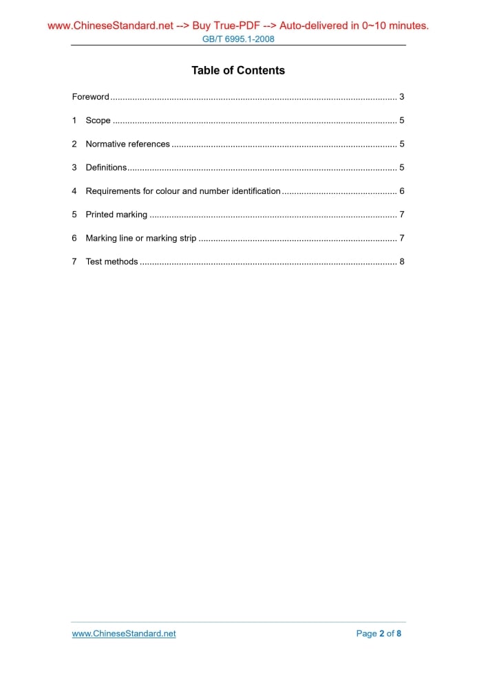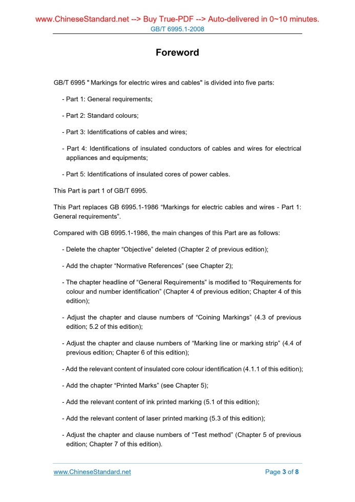 Similar standardsGB/T 6995.1-2008: Markings for electric wires and cables -- Part 1: General requirements---This is an excerpt. Full copy of true-PDF in English version (including equations, symbols, images, flow-chart, tables, and figures etc.), auto-downloaded/delivered in 9 seconds, can be purchased online: https://www.ChineseStandard.net/PDF.aspx/GBT6995.1-2008GB NATIONAL STANDARD OF THE PEOPLE’S REPUBLIC OF CHINA ICS 29.060.20 K 13 Replacing GB 6995.1-1986 Markings for Electric Wires and Cables - Part 1.General Requirements Issued on. JUNE 18, 2008 Implemented on. MARCH 1, 2009 Issued by. General Administration of Quality Supervision, Inspection and Quarantine of the People’s Republic of China; Standardization Administration of the People's Republic of China. Table of ContentsForeword... 3 1 Scope... 5 2 Normative references... 5 3 Definitions... 5 4 Requirements for colour and number identification... 6 5 Printed marking... 7 6 Marking line or marking strip... 7 7 Test methods... 8ForewordGB/T 6995 " Markings for electric wires and cables" is divided into five parts. - Part 1.General requirements; - Part 2.Standard colours; - Part 3.Identifications of cables and wires; - Part 4.Identifications of insulated conductors of cables and wires for electrical appliances and equipments; - Part 5.Identifications of insulated cores of power cables. This Part is part 1 of GB/T 6995. This Part replaces GB 6995.1-1986 “Markings for electric cables and wires - Part 1. General requirements”. Compared with GB 6995.1-1986, the main changes of this Part are as follows. - Delete the chapter “Objective” deleted (Chapter 2 of previous edition); - Add the chapter “Normative References” (see Chapter 2); - The chapter headline of “General Requirements” is modified to “Requirements for colour and number identification” (Chapter 4 of previous edition; Chapter 4 of this edition); - Adjust the chapter and clause numbers of “Coining Markings” (4.3 of previous edition; 5.2 of this edition); - Adjust the chapter and clause numbers of “Marking line or marking strip” (4.4 of previous edition; Chapter 6 of this edition); - Add the relevant content of insulated core colour identification (4.1.1 of this edition); - Add the chapter “Printed Marks” (see Chapter 5); - Add the relevant content of ink printed marking (5.1 of this edition); - Add the relevant content of laser printed marking (5.3 of this edition); - Adjust the chapter and clause numbers of “Test method” (Chapter 5 of previous edition; Chapter 7 of this edition). This Part was proposed by China Electrical Equipment Industrial Association. This Part shall be under the jurisdiction of National Technical Committee on Wires and Cables of Standardization Administration of China (SAC/TC 213). Main drafting organizations of this Part. Shanghai Electric Cable Research Institute. Participating drafting organizations of this Part. Baosheng Science & Technology Innovation Co., Ltd., Shanghai Surrey Polymers Co., Ltd., Jinshan Electric Wire & Cable Ltd., Tianjin, Far East Holding Group Co., Ltd. AND Wenzhou Zhenhua Electronic Co., Ltd. Chief drafting staffs of this Part. Zhou Xiaowei, Zhang Jingping, Pang Yuchun, Dong Jiandong, Zheng Guojun, Wang Chuanbin and Yang Feng. The previous edition replaced by this Part is as follows. - GB 6995.1-1986. Markings for Electric Wires and Cables - Part 1.General Requirements1 ScopeThis Part of GB/T 6995 is applicable to the identification markings for electrical appliance and equipment wires/cables, electric cables and telecommunication cables, etc., as well as the insulated cores. This Part shall be used together with Part 2, Part 3, Part 4 and Part 5 of GB/T 6995.2 Normative referencesThe following documents contain the provisions which, through reference in this Part of GB/T 6995, become the provisions of this Standard. For dated references, their subsequent amendments (excluding corrigendum) or revisions do not apply to this Standard. However, the parties who enter into agreement based on this Standard are encouraged to investigate whether the latest versions of these documents are applicable. For undated reference documents, the latest versions apply to this Part. GB/T 6995.2-2008 Markings for electric wires and cables – Part 2.Standard colours GB/T 6995.3-2008 Markings for Electric Wires and Cables - Part 3.Identifications of Cables and Wires GB/T 6995.4-2008 Markings for Electric Wires and Cables - Part 4.Identifications of Insulated Conductors of Cables and Wires for Electrical Appliances and Equipments GB/T 6995.5-2008 Markings for Electric Wires and Cables - Part 5.Identifications of Insulated Cores of Power Cables3 DefinitionsFor the purposes of this Part, the following definitions apply. 3.1 Wire and Cable Identification The manufacturer, product trademark, model, specification and function, etc. are identified with markings such as word, letter, symbol and colour. 3.2 Core Identification The function that different insulated cores of multicore cables are differentiated or insulated cores are identified with Arabic numerals, colours (single-colour or mixed- colours).4 Requirements for colour and number identification4.1 Colour Identification 4.1.1 Requirements Marking colours shall be confirmed to comply with or to be near to a colour specified in GB/T 6995.2-2008. 4.1.2 Clarity Marking colours shall be easy to identify or recognize. 4.1.3 Rubbing resistance Markings shall be rubbing resistant; the colour shall basically remain the same after being rubbed. 4.2 Number Identification5 Printed marking5.1 Ink Printed Marking 5.1.1 Clarity Ink printed markings shall be clear and legible. 5.2 Coining Marking 5.2.1 Type Coining marking shall adopt letterpress or gravure type to coin on the carrier directly. 5.2.2 Clarity Words on the coining marking shall be clear and legible. 5.3 Laser Printed Marking6 Marking line or marking strip6.1.1 Marking line Marking line is adopted to identify 