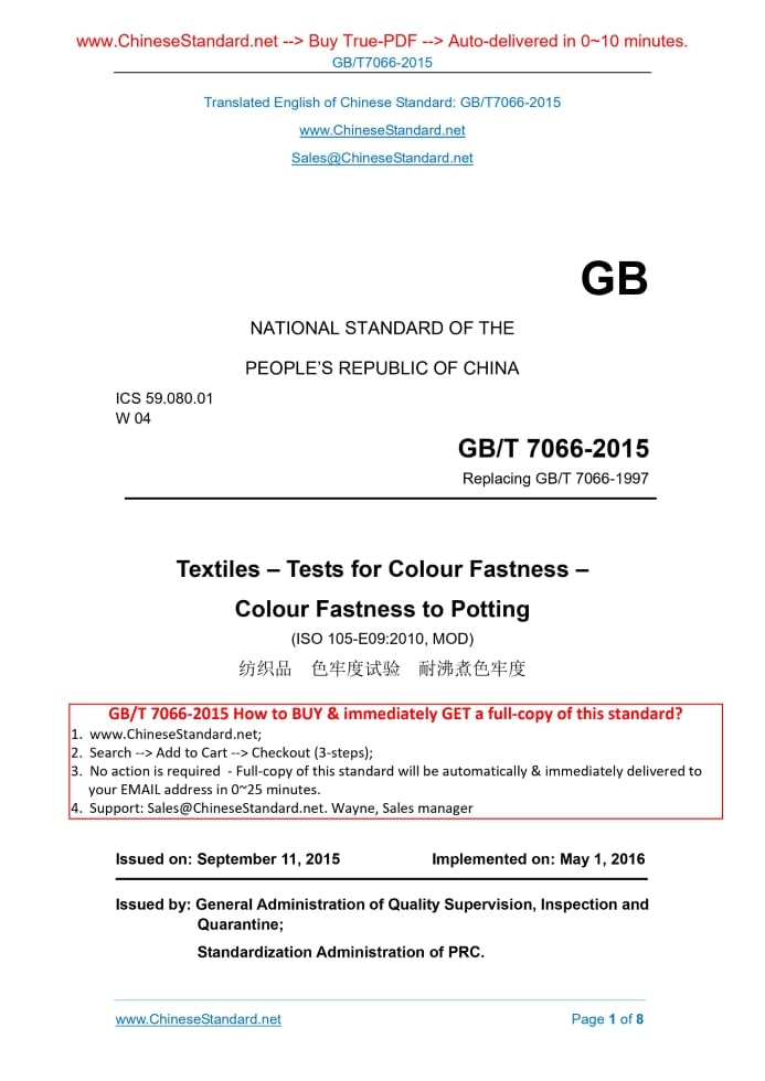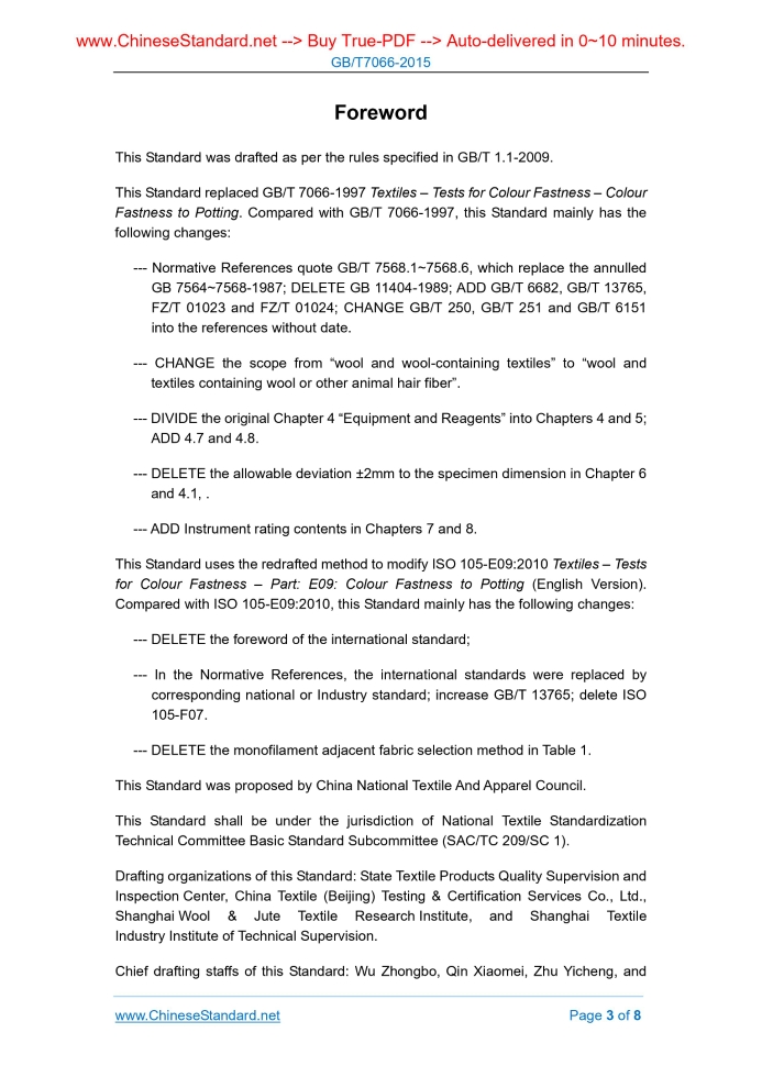 Similar standardsGB/T 7066-2015: Textiles -- Tests for colour fastness -- Colour fastness to potting---This is an excerpt. Full copy of true-PDF in English version (including equations, symbols, images, flow-chart, tables, and figures etc.), auto-downloaded/delivered in 9 seconds, can be purchased online: https://www.ChineseStandard.net/PDF.aspx/GBT7066-2015GB NATIONAL STANDARD OF THE PEOPLE’S REPUBLIC OF CHINA ICS 59.080.01 W 04 Replacing GB/T 7066-1997 Textiles – Tests for Colour Fastness – Colour Fastness to Potting (ISO 105-E09.2010, MOD) Issued on: SEPTEMBER 11, 2015 Implemented on: MAY 1, 2016 Issued by. General Administration of Quality Supervision, Inspection and Quarantine; Standardization Administration of PRC. Table of ContentsForeword ... 3 1 Scope ... 5 2 Normative References ... 5 3 Principles ... 6 4 Equipment and Materials ... 6 5 Reagents ... 7 6 Specimens ... 7 7 Operating Procedures ... 7 8 Test Report ... 7ForewordThis Standard was drafted as per the rules specified in GB/T 1.1-2009. This Standard replaced GB/T 7066-1997 Textiles – Tests for Colour Fastness – Colour Fastness to Potting. Compared with GB/T 7066-1997, this Standard mainly has the following changes. --- Normative References quote GB/T 7568.1~7568.6, which replace the annulled GB 7564~7568-1987; DELETE GB 11404-1989; ADD GB/T 6682, GB/T 13765, FZ/T 01023 and FZ/T 01024; CHANGE GB/T 250, GB/T 251 and GB/T 6151 into the references without date. --- CHANGE the scope from “wool and wool-containing textiles” to “wool and textiles containing wool or other animal hair fiber”. --- DIVIDE the original Chapter 4 “Equipment and Reagents” into Chapters 4 and 5; ADD 4.7 and 4.8. --- DELETE the allowable deviation ±2mm to the specimen dimension in Chapter 6 and 4.1, . --- ADD Instrument rating contents in Chapters 7 and 8. This Standard uses the redrafted method to modify ISO 105-E09.2010 Textiles – Tests for Colour Fastness – Part. E09. Colour Fastness to Potting (English Version). Compared with ISO 105-E09.2010, this Standard mainly has the following changes. --- DELETE the foreword of the international standard; --- In the Normative References, the international standards were replaced by corresponding national or Industry standard; increase GB/T 13765; delete ISO 105-F07. --- DELETE the monofilament adjacent fabric selection method in Table 1. This Standard was proposed by China National Textile And Apparel Council. This Standard shall be under the jurisdiction of National Textile Standardization Technical Committee Basic Standard Subcommittee (SAC/TC 209/SC 1). Drafting organizations of this Standard. State Textile Products Quality Supervision and Inspection Center, China Textile (Beijing) Testing & Certification Services Co., Ltd., Shanghai Wool & Jute Textile Research Institute, and Shanghai Textile Industry Institute of Technical Supervision. Chief drafting staffs of this Standard. Wu Zhongbo, Qin Xiaomei, Zhu Yicheng, and Textiles – Tests for Colour Fastness – Colour Fastness to Potting1 ScopeThis Standard specifies a method for determination the color fastness to potting of various textiles. It is mainly applicable to wool and textiles containing wool or other animal hair fibers.2 Normative ReferencesThe following documents are essential to the application of this document. For the dated documents, only the versions with the dates indicated are applicable to this document; for the undated documents, only the latest version (including all the amendments) are applicable to this document. GB/T 250 Textiles - Tests for Colour Fastness - Grey Scale for Assessing Change in Colour (GB/T 250-2008, ISO 105-A02.1993, IDT) GB/T 251 Textiles - Tests for Colour Fastness - Grey Scale for Assessing Staining (GB/T 251-2008, ISO 105-A03.1993, IDT) GB/T 6151 Textiles - Tests for Colour Fastness - General Principle of Testing (GB/T 6151-1997, eqv ISO 105-A01.1994) GB/T 6682 Water for Analytical Laboratory Use - Specification and Test Methods (GB/T 6682-1992, ISO 3696.1987, MOD) GB/T 7568.1 Textiles - Tests for Colour Fastness - Specification for Wool Adjacent Fabric (GB/T 7568.1-2002, ISO 105-F01.2001, MOD) GB/T 7568.2 Textiles - Tests for Colour Fastness - Standard Adjacent Fabrics - Part 2. Cotton and Viscose GB/T 7568.3 Textiles - Tests for Colour Fastness - Standard Adjacent Fabrics - Part 3. Polyamide (GB/T 7568.3-2008, ISO 105-F03.2001, MOD) GB/T 7568.4 Textiles - Tests for Colour Fastness - Specification for Polyester Adjacent Fabric (GB/T 7568.4-2002, ISO 105-F04.2001, MOD) GB/T 7568.5 Textiles - Tests for Colour Fastness - Specification for Acrylic ......Source: Above contents are excerpted from the full-copy PDF -- translated/reviewed by: www.ChineseStandard.net / Wayne Zheng et al. Tips & Frequently Asked Questions:Question 1: How long will the true-PDF of English version of GB/T 7066-2015 be delivered?Answer: The full copy PDF of English version of GB/T 7066-2015 can be downloaded in 9 seconds, and it will also be emailed to you in 9 seconds (double mechanisms to ensure the delivery reliably), with PDF-invoice.Question 2: Can I share the purchased PDF of GB/T 7066-2015_English with my colleagues?Answer: Yes. The purchased PDF of GB/T 7066-2015_English will be deemed to be sold to your employer/organization who actually paid for it, including your colleagues and your employer's intranet.Question 3: Does the price include tax/VAT?Answer: Yes. Our tax invoice, downloaded/delivered in 9 seconds, includes all tax/VAT and complies with 100+ countries' tax regulations (tax exempted in 100+ countries) -- See Avoidance of Double Taxation Agreements (DTAs): List of DTAs signed between Singapore and 100+ countriesQuestion 4: Do you accept my currency other than USD?Answer: Yes. www.ChineseStandard.us -- GB/T 7066-2015 -- Click this link and select your country/currency to pay, the exact amount in your currency will be printed on the invoice. Full PDF will also be downloaded/emailed in 9 seconds.Q