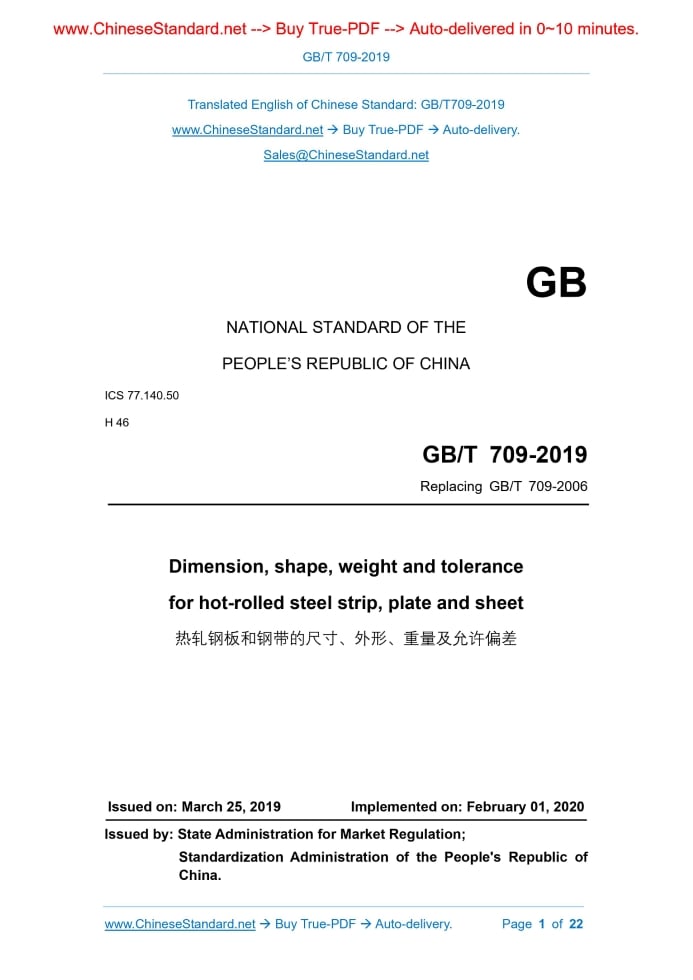 GB/T 709-2019: Dimension, shape, weight and tolerance for hot-rolled steel strip, plate and sheet Delivery: 9 seconds. True-PDF full-copy in English & invoice will be downloaded + auto-delivered via email. See step-by-step procedure Status: Valid GB/T 709: Historical versions