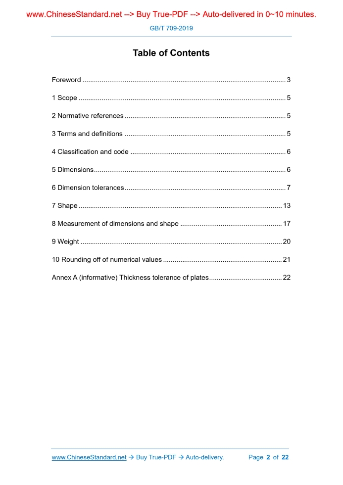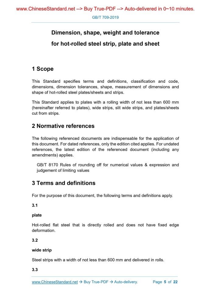Similar standardsGB/T 709-2019: Dimension, shape, weight and tolerance for hot-rolled steel strip, plate and sheet---This is an excerpt. Full copy of true-PDF in English version (including equations, symbols, images, flow-chart, tables, and figures etc.), auto-downloaded/delivered in 9 seconds, can be purchased online: https://www.ChineseStandard.net/PDF.aspx/GBT709-2019 NATIONAL STANDARD OF THE PEOPLE’S REPUBLIC OF CHINA ICS 77.140.50 H 46 Replacing GB/T 709-2006 Dimension, shape, weight and tolerance for hot-rolled steel strip, plate and sheet Issued on. MARCH 25, 2019 Implemented on. FEBRUARY 01, 2020 Issued by. State Administration for Market Regulation; Standardization Administration of the People's Republic of China. Table of ContentsForeword... 3 1 Scope... 5 2 Normative references... 5 3 Terms and definitions... 5 4 Classification and code... 6 5 Dimensions... 6 6 Dimension tolerances... 7 7 Shape... 13 8 Measurement of dimensions and shape... 17 9 Weight... 20 10 Rounding off of numerical values... 21 Annex A (informative) Thickness tolerance of plates... 22ForewordThis Standard is drafted in accordance with the rules given in GB/T 1.1-2009. This Standard replaces GB/T 709-2006 “Dimension, shape, weight and tolerances for hot-rolled steel plates and sheets”. Compared with GB/T 709-2006, the main technical changes of this Standard are as follows. - ADD the terms and definitions of “slit wide strip” and “plate/sheet cut from strip” (see 3.3, 3.4); - MODIFY “positive tolerance” to “upper tolerance” and “negative tolerance” to “lower tolerance” (see 4.2 of this Standard, 4.2 of 2006 edition); - ADD the classification and technical requirements of general precision of flatness PF.A and higher precision of flatness PF.B (see 4.4, 7.1.1.2); - MODIFY the dimension range of steel plates/sheets and strips (see Table 1 of this Standard, 5.1 of 2006 edition); - COMBINE the classes N, A, B, and C tolerances of plates INTO one table; ADD the thickness tolerance requirements for thickness greater than 400 mm; ADJUST the upper limit of the nominal width TO 5300 mm (see Table 2 of this Standard, Table 1, Table 2, Table 3, Table 4 of 2006 edition); - ADD the negotiation terms of thickness tolerance for steel plates/sheets with a thickness greater than 200 mm (see 6.1.1.3); - ADD the requirement that it may supply according to the tolerances given in Annex A after agreed upon between the supply and demand parties (see 6.1.1.4); - MODIFY the level classification of the thickness tolerance of steel strips (including plates/sheets cut form strips) according to the specified minimum yield strength less than 345 MPa TO less than 360 MPa; separately SPECIFY the thickness tolerance of those with the minimum yield strength not less than 360 MPa (see Table 3 and Table 4 of this Standard, Table 5 of 2006 edition); - ADD the requirement that steel plates/sheets and strips are supplied according to general precision when the thickness tolerance and flatness are default (see 6.1.2, 7.1.2); - ADD the negotiation terms when the yield strength and requirements are not specified in the thickness tolerance and flatness requirements of steel strips and plate/sheet cut from strip in the product standard (see 6.1.2.3, 7.1.3); - MODIFY the length tolerance of plates (see Table 8 of this Standard, Table 10 of 2006 edition); - MODIFY the length tolerance of plates/sheets cut from strips (see Table 9 of this Standard, Table 11 of 2006 edition); - MODIFY the requirements for the flatness of plates (see 7.1.1 of this Standard, Table 12 of 2006 edition); - MODIFY the requirements for the flatness of plates/sheets cut from strips (see Table 11 of this Standard, Table 13 of 2006 edition); - MODIFY the “cutting angle” to “out-of-squareness”; ADD the method and requirements for the measurement of out-of-squareness using the diagonal method (see 7.3 of this Standard, 7.3 of 2006 edition); - ADD the schematic diagram of the measurement of flatness of plates (see Figure 2); - ADD the schematic diagram of the measurement of out-of-squareness using the diagonal method (see Figure 6); - ADD the weight of a steel plate, when the rounding of more than 1000kg to the integer value of kg is worth stipulated (see Table 14). This Standard was proposed by China Iron and Steel Industry Association. This Standard is under the jurisdiction of National Technical Committee on Steel of Standardization Administration of China (SAC/TC 183). Drafting organizations of this Standard. China Metallurgical Information and Standardization Institute, Liuzhou Iron and Steel Co., Ltd., Hunan Hualing Xiangtan Iron and Steel Co., Ltd., Shougang Group Co., Ltd., Tangshan Ruifeng Iron and Steel (Group) Co., Ltd., Shandong Iron and Steel Group Rizhao Co., Ltd., Baoshan Iron and Steel Co., Ltd. Co., Ltd., Angang Steel Co., Ltd. Main drafters of this Standard. Hou Jie, Zhang Weixu, Li Qian, Luo Jun, Luo Deng, Shi Li, Zhang Liqiang, Sun Weihua, Huang Jinhua, Guan Jichun, Fan Lei, Zhang Yongwei, Feng Bingxiao, Hou Donghua. The previous released versions replaced by this Standard are as follows. - GB 709-1965, GB 709-1988, GB/T 709-2006. Dimension, shape, weight and tolerance for hot-rolled steel strip, plate and sheet1 ScopeThis Standard specifies terms and definitions, classification and code, dimensions, dimension tolerances, shape, measurement of dimensions and shape of hot-rolled steel plates/sheets and strips. This Standard applies to plates with a rolling width of not less than 600 mm (hereinafter referred to plates), wide strips, slit wide strips, and plates/sheets cut from strips.2 Normative referencesThe following referenced documents are indispensable for the application of this document. For dated references, only the edition cited applies. For undated references, the latest edition of the referenced document (including any amendments) applies. GB/T 8170 Rules of rounding off for numerical values & expression and judgeme