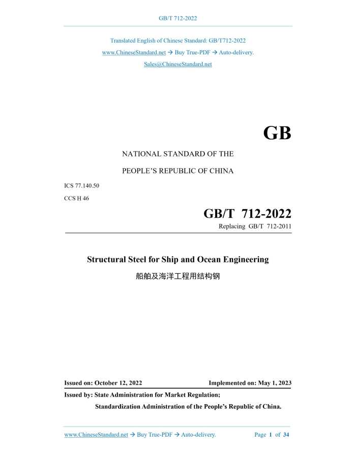GB/T 712-2022: Structural steel for ship and ocean engineering Delivery: 9 seconds. True-PDF full-copy in English & invoice will be downloaded + auto-delivered via email. See step-by-step procedure Status: Valid GB/T 712: Historical versions
