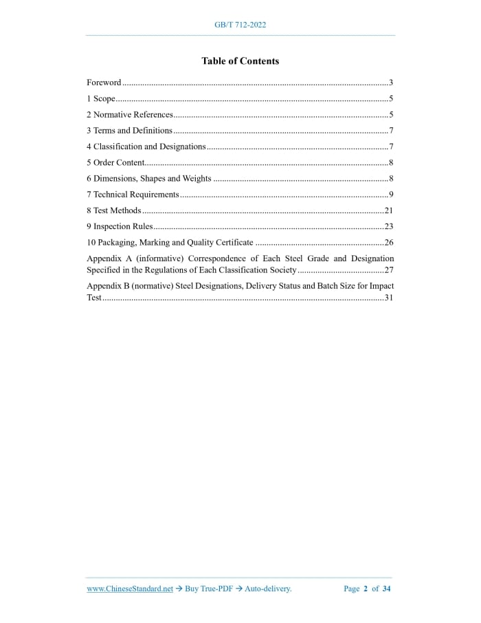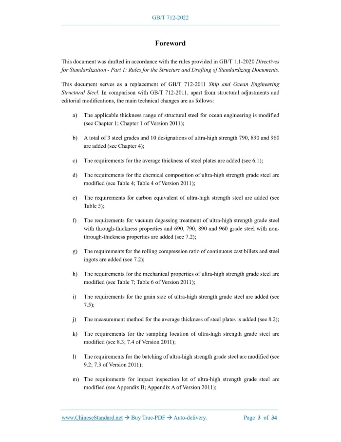 Similar standardsGB/T 712-2022: Structural steel for ship and ocean engineering---This is an excerpt. Full copy of true-PDF in English version (including equations, symbols, images, flow-chart, tables, and figures etc.), auto-downloaded/delivered in 9 seconds, can be purchased online: https://www.ChineseStandard.net/PDF.aspx/GBT712-2022GB NATIONAL STANDARD OF THE PEOPLE’S REPUBLIC OF CHINA ICS 77.140.50 CCS H 46 Replacing GB/T 712-2011 Structural Steel for Ship and Ocean Engineering Issued on. OCTOBER 12, 2022 Implemented on. MAY 1, 2023 Issued by. State Administration for Market Regulation; Standardization Administration of the People’s Republic of China. Table of ContentsForeword... 3 1 Scope... 5 2 Normative References... 5 3 Terms and Definitions... 7 4 Classification and Designations... 7 5 Order Content... 8 6 Dimensions, Shapes and Weights... 8 7 Technical Requirements... 9 8 Test Methods... 21 9 Inspection Rules... 23 10 Packaging, Marking and Quality Certificate... 26 Appendix A (informative) Correspondence of Each Steel Grade and Designation Specified in the Regulations of Each Classification Society... 27 Appendix B (normative) Steel Designations, Delivery Status and Batch Size for Impact Test... 31ForewordThis document was drafted in accordance with the rules provided in GB/T 1.1-2020 Directives for Standardization - Part 1.Rules for the Structure and Drafting of Standardizing Documents. This document serves as a replacement of GB/T 712-2011 Ship and Ocean Engineering Structural Steel. In comparison with GB/T 712-2011, apart from structural adjustments and editorial modifications, the main technical changes are as follows. a) The applicable thickness range of structural steel for ocean engineering is modified (see Chapter 1; Chapter 1 of Version 2011); b) A total of 3 steel grades and 10 designations of ultra-high strength 790, 890 and 960 are added (see Chapter 4); c) The requirements for the average thickness of steel plates are added (see 6.1); d) The requirements for the chemical composition of ultra-high strength grade steel are modified (see Table 4; Table 4 of Version 2011); e) The requirements for carbon equivalent of ultra-high strength steel are added (see Table 5); f) The requirements for vacuum degassing treatment of ultra-high strength grade steel with through-thickness properties and 690, 790, 890 and 960 grade steel with non- through-thickness properties are added (see 7.2); g) The requirements for the rolling compression ratio of continuous cast billets and steel ingots are added (see 7.2); h) The requirements for the mechanical properties of ultra-high strength grade steel are modified (see Table 7; Table 6 of Version 2011); i) The requirements for the grain size of ultra-high strength grade steel are added (see 7.5); j) The measurement method for the average thickness of steel plates is added (see 8.2); k) The requirements for the sampling location of ultra-high strength grade steel are modified (see 8.3; 7.4 of Version 2011); l) The requirements for the batching of ultra-high strength grade steel are modified (see 9.2; 7.3 of Version 2011); m) The requirements for impact inspection lot of ultra-high strength grade steel are modified (see Appendix B; Appendix A of Version 2011); n) Controlled rolling (CR) is modified (see Appendix B; Appendix A of Version 2011). Please be noted that certain content of this document may involve patents. The institution issuing this document does not undertake the responsibility of identifying these patents. This document was proposed by China Iron and Steel Association. This document shall be under the jurisdiction of National Technical Committee 183 on Steel of Standardization Administration of China (SAC/TC 183). The drafting organizations of this document. Angang Steel Company Limited; China Metallurgical Information and Standardization Institute; Xinyu Iron & Steel Co., Ltd.; Hunan Valin Xiangtan Iron & Steel Co., Ltd.; Jiangyin Xingcheng Special Steel Co., Ltd.; Hebei Puyang Steel Co., Ltd.; Nanjing Iron and Steel Group Co., Ltd.; Bensteel Group Co., Ltd.; Zhongke Xiwang Special Steel Co., Ltd.; Guangxi Liuzhou Steel Group Co., Ltd.; Laiwu Branch of Shandong Iron and Steel Co., Ltd.; Qingdao NCS Testing Protection Technology Co., Ltd.; Shougang Group Co., Ltd.; China Classification Society; Guangdong Shao Steel Songshan Co., Ltd. The main drafters of this document. Wang Hua, Guan Jichun, Pu Zhimin, Zhang Weixu, Sun Menghan, Xiong Wenming, Yang Jianhua, Meng Yu, Wang Zhicong, Jin Xing, Huang Jianguo, Zhang Jian, Wei Sheng, Wang Zhongxue, Ding Guoqing, Di Guobiao, Zhao Jie, Qiu Wensheng, Yan Ling, Chen Hua, Zhang Peng, Tian Zijian, Liu Zhifang, Zhou Wenhao, Liu Guanyou, Chen Jianchao, Yin Zhijun, Ren Changpo, Xin Shiqi, Yuan Qinpan, Zhang Pei, Yang Haiyang, Qin Liye, Gao Xuhui. This document was firstly issued in 1965, firstly revised in 1979, secondly revised in 1988, thirdly revised in 2000 and fourthly revised in 2011.This is the fifth revision. Structural Steel for Ship and Ocean Engineering1 ScopeThis document specifies the classification and designations, order content, dimensions, shapes, weights, technical requirements, test methods, inspection rules, packaging, marking and quality certificate of structural steel for ship and ocean engineering. This document is applicable to steel plates (with a thickness of not greater than 150 mm) for the manufacturing of hull structures, such as. ocean-going, coastal and inland navigation ships and fishing boats, etc., steel plates (with a thickness of not greater than 250 mm) for ocean engineering structures, steel strips and shear plates with a thickness of not greater than 25.4 mm, and profile steel with a thickness of not greater than 50 mm or steel bars with a diameter of not greater than 50 mm (hereinafter referred to as the steel).2 Normative ReferencesThe contents of the following documents constitute indispensable clauses of this document through the normative refer