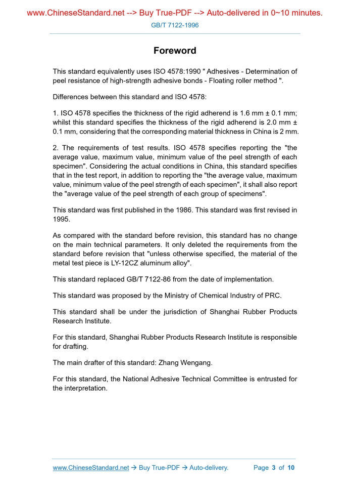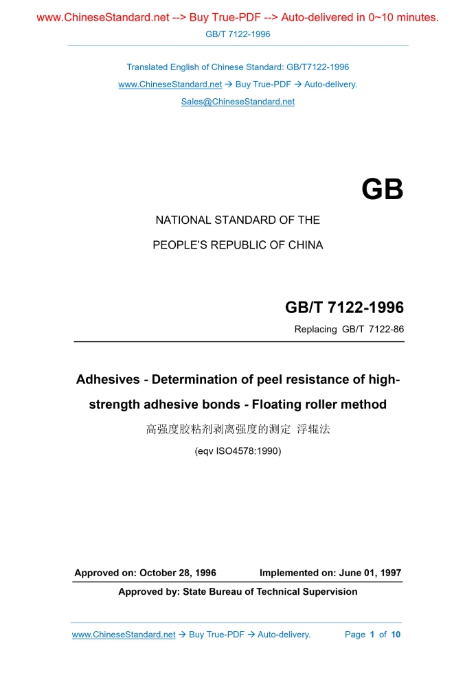 GB/T 7122-1996: Adhesives. Determination of peel resistance of high-strength adhesive bonds. Floating roller method Delivery: 9 seconds. True-PDF full-copy in English & invoice will be downloaded + auto-delivered via email. See step-by-step procedure GB/T 7122: Historical versions