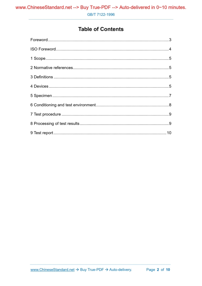 Similar standardsGB/T 7122-1996: Adhesives. Determination of peel resistance of high-strength adhesive bonds. Floating roller method---This is an excerpt. Full copy of true-PDF in English version (including equations, symbols, images, flow-chart, tables, and figures etc.), auto-downloaded/delivered in 9 seconds, can be purchased online: https://www.ChineseStandard.net/PDF.aspx/GBT7122-1996 GB NATIONAL STANDARD OF THE PEOPLE’S REPUBLIC OF CHINA Replacing GB/T 7122-86 Adhesives - Determination of peel resistance of high- strength adhesive bonds - Floating roller method (eqv ISO4578:1990) APPROVED ON: OCTOBER 28, 1996 IMPLEMENTED ON: JUNE 01, 1997 Approved by: State Bureau of Technical Supervision Table of ContentsForeword ... 3 ISO Foreword ... 4 1 Scope ... 5 2 Normative references ... 5 3 Definitions ... 5 4 Devices ... 5 5 Specimen ... 7 6 Conditioning and test environment ... 8 7 Test procedure ... 9 8 Processing of test results ... 9 9 Test report ... 10ForewordThis standard equivalently uses ISO 4578:1990 " Adhesives - Determination of peel resistance of high-strength adhesive bonds - Floating roller method ". Differences between this standard and ISO 4578: 1. ISO 4578 specifies the thickness of the rigid adherend is 1.6 mm ± 0.1 mm; whilst this standard specifies the thickness of the rigid adherend is 2.0 mm ± 0.1 mm, considering that the corresponding material thickness in China is 2 mm. 2. The requirements of test results. ISO 4578 specifies reporting the "the average value, maximum value, minimum value of the peel strength of each specimen". Considering the actual conditions in China, this standard specifies that in the test report, in addition to reporting the "the average value, maximum value, minimum value of the peel strength of each specimen", it shall also report the "average value of the peel strength of each group of specimens". This standard was first published in the 1986. This standard was first revised in 1995. As compared with the standard before revision, this standard has no change on the main technical parameters. It only deleted the requirements from the standard before revision that "unless otherwise specified, the material of the metal test piece is LY-12CZ aluminum alloy". This standard replaced GB/T 7122-86 from the date of implementation. This standard was proposed by the Ministry of Chemical Industry of PRC. This standard shall be under the jurisdiction of Shanghai Rubber Products Research Institute. For this standard, Shanghai Rubber Products Research Institute is responsible for drafting. The main drafter of this standard: Zhang Wengang. For this standard, the National Adhesive Technical Committee is entrusted for the interpretation. Adhesives - Determination of peel resistance of high- strength adhesive bonds - Floating roller method1 ScopeThis standard specifies the method for measuring the peel strength of high- strength adhesive bonds by the floating roller method. The peel strength refers to the peel resistance between a rigid metal adherend and a flexible metal adherend under predetermined test conditions. Note: The floating roller method can obtain more stable data than other peeling methods. The surface of the flexible metal adherend is not required to coincide with the surface of the roller during the test.2 Normative referencesThe provisions contained in the following standards constitute the provisions of this standard through quotation in this standard. At the time of publication, the editions indicated were valid. All standards will be revised, and all parties using this standard shall study the possibility of using the latest version of the following standard. GB 2918-82 (88) Standard atmospheres for conditioning and testing of plastic specimens3 DefinitionsThis standard uses the following definitions. Peel strength: Under the specified test conditions, measure the average force required for the unit width of two specimens of metal adherends that are glued to each other gradually separated along the glue line, expressed in kN/m.4 Devices4.1 Tensile test device The tensile test device has a suitable load range. The chuck can separate and apply tensile force at a constant rate. The device shall be equipped with an5 Specimen5.1 The specimen size is as shown in Figure 2. The specimen can be prepared separately or cut from the test plate. The test plate and a single specimen are composed of two adherends which are glued together after proper treatment (see 5.2). 5.2 Surface treatment shall be carried out to obtain the best strength of the adherend. The surface treatment can be carried out in accordance with the manufacturer's instructions of the adhesive and stated in the test report. The adhesive shall be used according to the method recommended by the adhesive manufacturer, in order to obtain the best bonding effect with minimal deviation. Note: Different adhesives can be directly compared only when the structure of the specimen, the material and size of the adherend and the test conditions are the same. 5.3 The thickness of the flexible adherend is 0.5 mm ± 0.02 mm. The thickness of the rigid adherend is 2.0 mm ± 0.1 mm1). 5.4 The influence of cutting heat and mechanical force on the test results shall be reduced as much as possible when the specimen is cut from the glued test plate (see Figure 2). The specimen width is: a) 25 mm (preferable width); b) Other suitable widths that can be used for the test device. 1 Instructions for adoption: ISO 4578 specifies that the thickness of the rigid adherend is 1.6 mm ± 0.1 mm.7 Test procedure7.1 Insert the specimen into the peeling fixture (see 4.2), as shown in Figure 1. Clamp the unbonded end of the flexible adherend into the lower chuck (see 4.1) of the testing machine. Unless otherwise specified, the separation rate of the chuck is 100 mm/min ± 5 mm/min. If the rigid adherend is bent or deformed during the test, it is recommended to redesign the specimen, so that the rigid adherend has suff