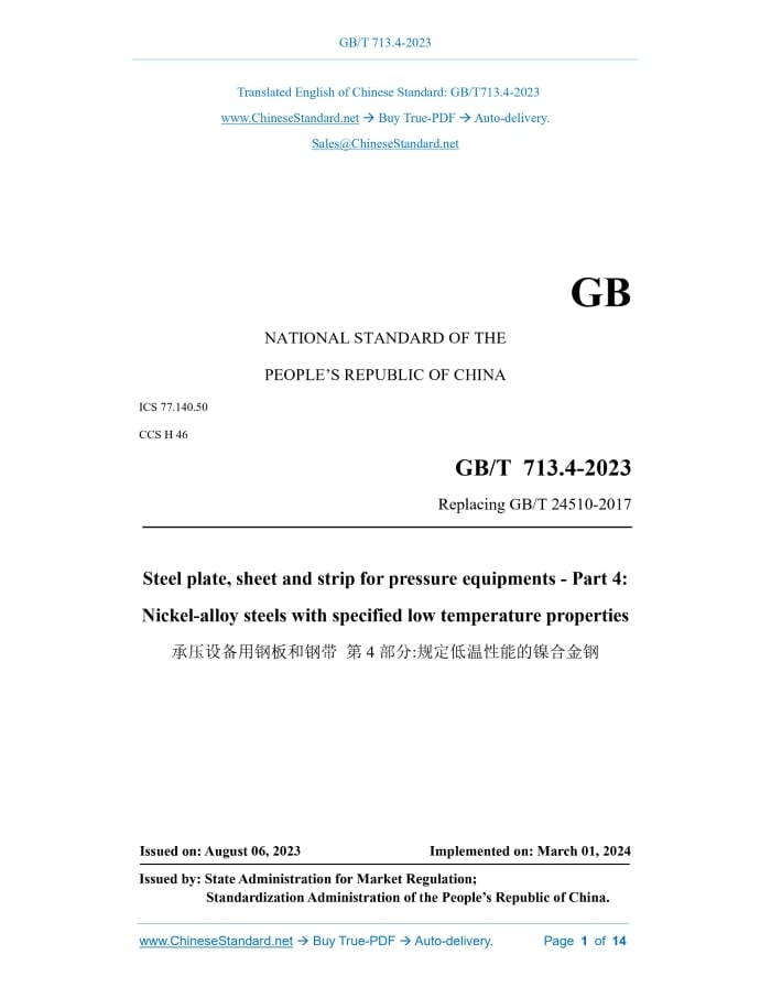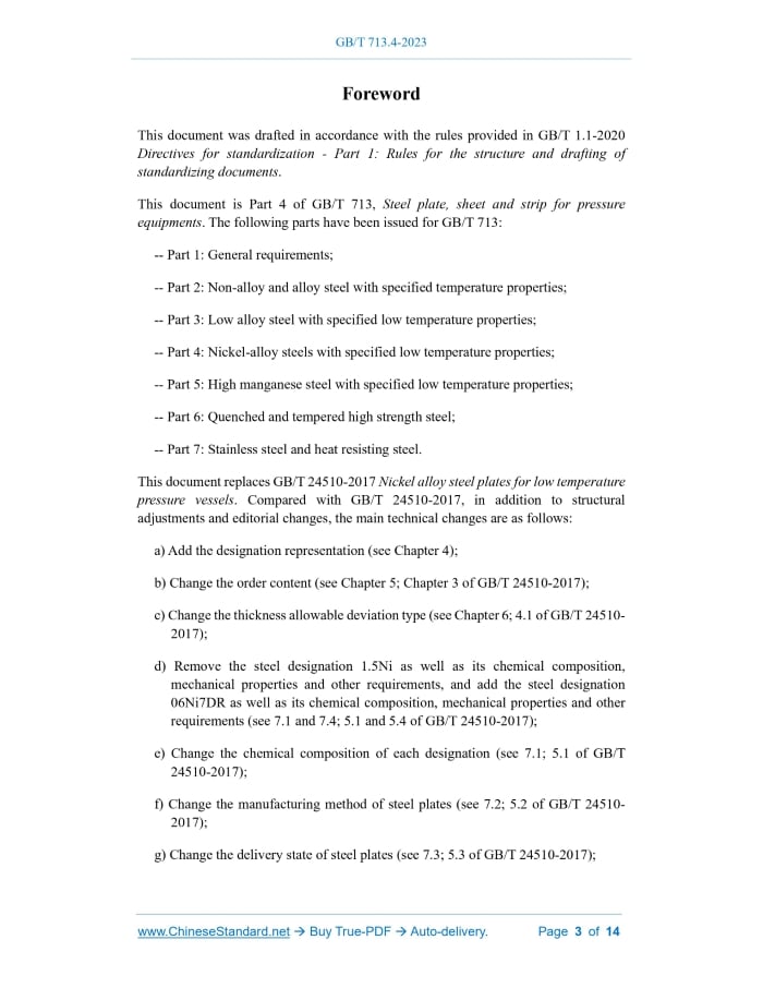 Similar standardsGB/T 713.4-2023: Steel plate, sheet and strip for pressure equipment - Part 4: Nickel-alloy steels with specified low temperature properties---This is an excerpt. Full copy of true-PDF in English version (including equations, symbols, images, flow-chart, tables, and figures etc.), auto-downloaded/delivered in 9 seconds, can be purchased online: https://www.ChineseStandard.net/PDF.aspx/GBT713.4-2023 GB NATIONAL STANDARD OF THE PEOPLE’S REPUBLIC OF CHINA ICS 77.140.50 CCS H 46 Replacing GB/T 24510-2017 Steel plate, sheet and strip for pressure equipments - Part 4: Nickel-alloy steels with specified low temperature properties ISSUED ON: AUGUST 06, 2023 IMPLEMENTED ON: MARCH 01, 2024 Issued by: State Administration for Market Regulation; Standardization Administration of the People’s Republic of China. Table of ContentsForeword ... 3 Introduction ... 5 1 Scope ... 7 2 Normative references ... 7 3 Terms and definitions ... 9 4 Designation representation ... 9 5 Order content ... 9 6 Size, shape, weight... 9 7 Technical requirements ... 9 8 Test methods ... 12 9 Inspection rules ... 13 10 Packaging, marking, quality certificates, as well as transportation and storage ... 13 Appendix A (Informative) Comparison table of similar designations between this document and relevant foreign standards ... 14ForewordThis document was drafted in accordance with the rules provided in GB/T 1.1-2020 Directives for standardization - Part 1: Rules for the structure and drafting of standardizing documents. This document is Part 4 of GB/T 713, Steel plate, sheet and strip for pressure equipments. The following parts have been issued for GB/T 713: -- Part 1: General requirements; -- Part 2: Non-alloy and alloy steel with specified temperature properties; -- Part 3: Low alloy steel with specified low temperature properties; -- Part 4: Nickel-alloy steels with specified low temperature properties; -- Part 5: High manganese steel with specified low temperature properties; -- Part 6: Quenched and tempered high strength steel; -- Part 7: Stainless steel and heat resisting steel. This document replaces GB/T 24510-2017 Nickel alloy steel plates for low temperature pressure vessels. Compared with GB/T 24510-2017, in addition to structural adjustments and editorial changes, the main technical changes are as follows: a) Add the designation representation (see Chapter 4); b) Change the order content (see Chapter 5; Chapter 3 of GB/T 24510-2017); c) Change the thickness allowable deviation type (see Chapter 6; 4.1 of GB/T 24510- 2017); d) Remove the steel designation 1.5Ni as well as its chemical composition, mechanical properties and other requirements, and add the steel designation 06Ni7DR as well as its chemical composition, mechanical properties and other requirements (see 7.1 and 7.4; 5.1 and 5.4 of GB/T 24510-2017); e) Change the chemical composition of each designation (see 7.1; 5.1 of GB/T 24510-2017); f) Change the manufacturing method of steel plates (see 7.2; 5.2 of GB/T 24510- 2017); g) Change the delivery state of steel plates (see 7.3; 5.3 of GB/T 24510-2017); Steel plate, sheet and strip for pressure equipments - Part 4: Nickel-alloy steels with specified low temperature properties1 ScopeThis document specifies the designation representation, order content, size, shape, weight, technical requirements, test methods, inspection rules, packaging, marking and quality certificate, as well as transportation and storage of nickel-alloy steels with specified low temperature properties for pressure equipment. This document applies to nickel-alloy steels with specified low temperature properties (hereinafter referred to as steel plates) with an operating temperature not lower than - 196 °C and a thickness not greater than 150 mm.2 Normative referencesThe following documents are referred to in the text in such a way that some or all of their content constitutes requirements of this document. For dated references, only the version corresponding to that date is applicable to this document; for undated references, the latest version (including all amendments) is applicable to this document. GB/T 223.5, Steel and iron - Determination of acid-soluble silicon and total silicon content - Reduced molybdosilicate spectrophotometric method GB/T 223.9, Iron, steel and alloy - Determination of aluminium content - Chrom azurol S photometric method GB/T 223.12, Methods for chemical analysis of iron, steel and alloy - The sodium carbonate separation-diphenyl carbazide photometric method for the determination of chromium content GB/T 223.18, Methods for chemical analysis of iron steel and alloy - The sodium thiosulfate separation iodimetric method for the determination of cupper content GB/T 223.23, Iron, steel and alloy - Determination of nickel content - The dimethylglyoxime spectrophotometric method GB/T 223.25, Methods for chemical analysis of iron, steel and alloy. The dimethylglyoxime gravimetric method for the determination of nickel content GB/T 223.26, Iron, steel and alloy - Determination of molybdenum content - The thiocyanate spectrophotometric method GB/T 223.40, Iron, steel and alloy - Determination of niobium content by the sulphochlorophenol S spectrophotometric method GB/T 223.59, Iron, steel and alloy - Determination of phosphorus content - Bismuth phosphomolybdate blue spectrophotometric method and antimony phosphomolybdate blue spectrophotometric method GB/T 223.63, Iron, steel and alloy - Determination of manganese content - Sodium (potassium) periodate spectrophotometric method GB/T 223.76, Methods for chemical analysis iron, steel and alloy - The flame atomic absorption spectrometric method for the determination of vanadium content GB/T 223.79, Iron and steel. Determination of multi-element contents. X-ray fluorescence spectrometry (Routine method) GB/T 223.85, Steel and iron - Determination of sulfur content - Infrared absorption method after combustion in an induction furnace GB/T 223.86, St