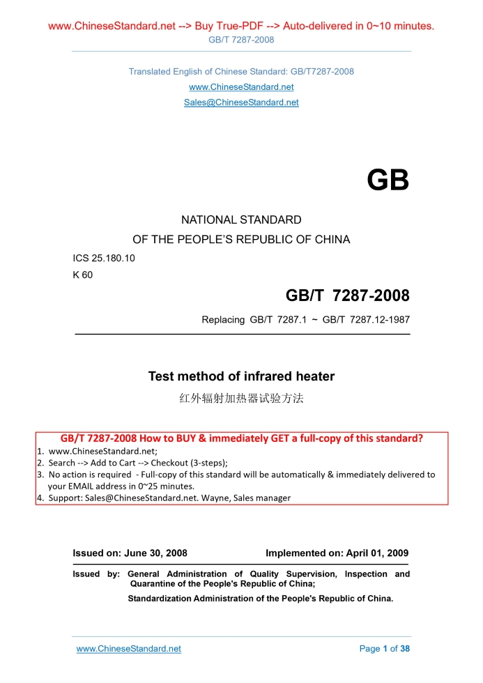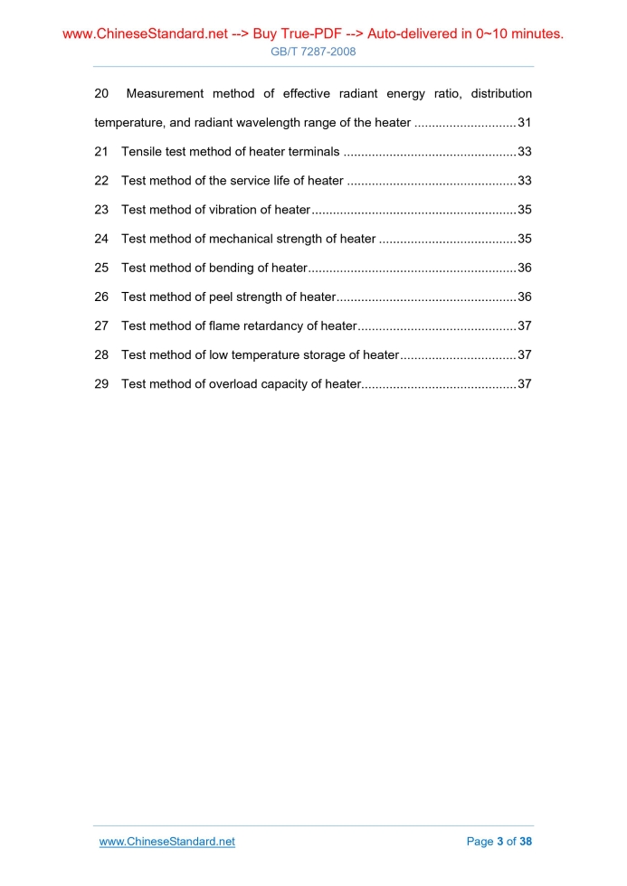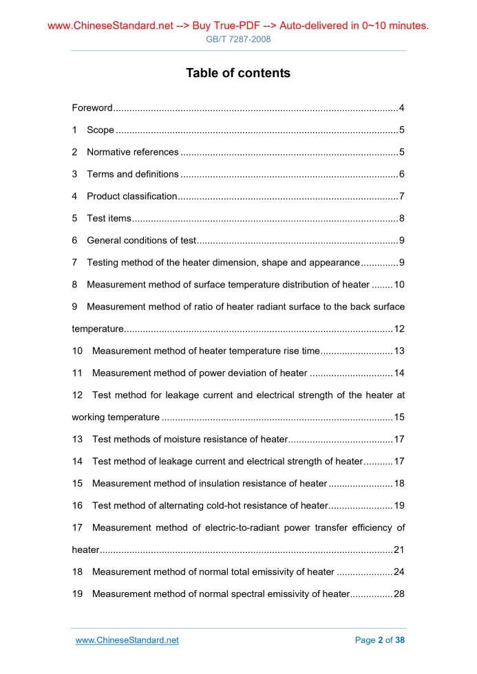 Similar standardsGB/T 7287-2008: Test method of infrared heater---This is an excerpt. Full copy of true-PDF in English version (including equations, symbols, images, flow-chart, tables, and figures etc.), auto-downloaded/delivered in 9 seconds, can be purchased online: https://www.ChineseStandard.net/PDF.aspx/GBT7287-2008GB NATIONAL STANDARD OF THE PEOPLE’S REPUBLIC OF CHINA ICS 25.180.10 K 60 Replacing GB/T 7287.1 ~ GB/T 7287.12-1987 Test method of infrared heater Issued on: JUNE 30, 2008 Implemented on: APRIL 01, 2009 Issued by. General Administration of Quality Supervision, Inspection and Quarantine of the People's Republic of China; Standardization Administration of the People's Republic of China. Table of ContentsForeword ... 4 1 Scope ... 5 2 Normative references ... 5 3 Terms and definitions ... 6 4 Product classification ... 7 5 Test items ... 8 6 General conditions of test ... 9 7 Testing method of the heater dimension, shape and appearance ... 9 8 Measurement method of surface temperature distribution of heater ... 10 9 Measurement method of ratio of heater radiant surface to the back surface temperature... 12 10 Measurement method of heater temperature rise time ... 13 11 Measurement method of power deviation of heater ... 14 12 Test method for leakage current and electrical strength of the heater at working temperature ... 15 13 Test methods of moisture resistance of heater ... 17 14 Test method of leakage current and electrical strength of heater ... 17 15 Measurement method of insulation resistance of heater ... 18 16 Test method of alternating cold-hot resistance of heater ... 19 17 Measurement method of electric-to-radiant power transfer efficiency of heater ... 21 18 Measurement method of normal total emissivity of heater ... 24 19 Measurement method of normal spectral emissivity of heater ... 28 20 Measurement method of effective radiant energy ratio, distribution temperature, and radiant wavelength range of the heater ... 31 21 Tensile test method of heater terminals ... 33 22 Test method of the service life of heater ... 33 23 Test method of vibration of heater ... 35 24 Test method of mechanical strength of heater ... 35 25 Test method of bending of heater ... 36 26 Test method of peel strength of heater ... 36 27 Test method of flame retardancy of heater ... 37 28 Test method of low temperature storage of heater ... 37 29 Test method of overload capacity of heater... 37ForewordThis standard replaces GB/T 7287.1 ~ GB/T 7287.12-1987 “Test method of infrared heater”. As compared with the latter, the main changes of this standard are as follows. - In accordance with the development of infrared heater manufacturing and testing technology, EXTEND the scope of application from the medium temperature infrared heater to a variety of low temperature, medium temperature and high temperature infrared heater. - ADD three parts. “Normative references”, “Terms and definitions”, and “Product classifications”. - In accordance with the changes of relevant standard, ADD the test methods of such performance indicators as “leakage current and electrical strength at working temperature”, “moisture resistance”, “effective radiation energy ratio and distribution temperature”, “terminal tensile force”, “mechanical strength”, “bending test”, “peel strength”, “flame retardant performance”, “low temperature storage”, and “overload capacity”, and so on. - As for the measurement of normal total emissivity, ADD the “thermal image measurement method” (method B) on the basis of the “relative radiometer method”. - As for the electrical heat radiation conversion efficiency, ADD the “thermal image measurement method” (method B) and the “distribution radiancy method” (method C) on the basis of the "radiometer method". This standard was proposed by China Electrical Equipment Industry Association. This standard shall be under the jurisdiction of the National Industrial Electrical Heating Equipment Standardization Technical Committee (SAC/TC 121). The drafting organizations of this standard. National Infrared and Industrial Electrical Heating Product Quality Supervision and Inspection Center, Yangzhong Datang Electric Manufacturing Co., Ltd., Nanjing Lishui Best Co., Ltd. The main drafters of this standard. Zeng Yu, Xiong Jie, Ye Ping, Li Gang, Tang Ruixian, Wei Siping. This Standard replaces the standard previously issued as follows. - GB/T 7287.1 ~ 7287.12-1987. Test method of infrared heater1 ScopeThis standard specifies the performance test method for infrared heaters (hereinafter shortly referred to as “heaters”). This standard applies to the infrared heaters, including various low temperature, medium temperature and high temperature metallic matrix or non-metallic matrix electrical infrared heaters. This standard describes the basic characteristics of infrared heaters AND specifies the methods to test these characteristics, for reference by the user.2 Normative referencesThe provisions in following documents become the provisions of this Standard through reference in this Standard. For the dated references, the subsequent amendments (excluding corrections) or revisions do not apply to this Standard; however, parties who reach an agreement based on this Standard are encouraged to study if the latest versions of these documents are applicable. For undated references, the latest edition of the referenced document applies. GB/T 2423.10-2008 Environmental testing for electric and electronic products - Part 2. Test methods - Test Fc. Vibration (sinusoidal) (IEC 60068-2-6.1995, IDT) GB/T 2900.23-2008 Electrotechnical terminology - Industrial electroheat (IEC 60050-841.2004, IDT) GB 4706.1-2005 Household and similar electrical appliances - Safety - Part 1. General requirements (IEC 603351.2001, IDT) GB 4706.8-2003 Household and similar electrical appliances - Safety - Particular requirements for blankets pads and similar flexible 