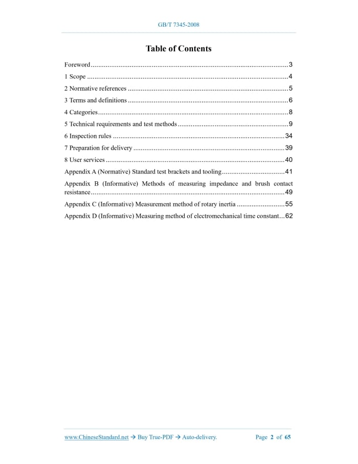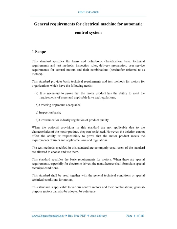 Similar standardsGB/T 7345-2008: General requirements for electrical machine for automatic control system---This is an excerpt. Full copy of true-PDF in English version (including equations, symbols, images, flow-chart, tables, and figures etc.), auto-downloaded/delivered in 9 seconds, can be purchased online: https://www.ChineseStandard.net/PDF.aspx/GBT7345-2008GB NATIONAL STANDARD OF THE PEOPLE’S REPUBLIC OF CHINA ICS 29.160.30 K 24 Replacing GB/T 7345-1994 General requirements for electrical machine for automatic control system Issued on. JUNE 30, 2008 Implemented on. APRIL 01, 2009 Issued by. General Administration of Quality Supervision, Inspection and Quarantine of PRC; National Standardization Administration. Table of ContentsForeword... 3 1 Scope... 4 2 Normative references... 5 3 Terms and definitions... 6 4 Categories... 8 5 Technical requirements and test methods... 9 6 Inspection rules... 34 7 Preparation for delivery... 39 8 User services... 40 Appendix A (Normative) Standard test brackets and tooling... 41 Appendix B (Informative) Methods of measuring impedance and brush contact resistance... 49 Appendix C (Informative) Measurement method of rotary inertia... 55 Appendix D (Informative) Measuring method of electromechanical time constant... 621 ScopeThis standard specifies the terms and definitions, classification, basic technical requirements and test methods, inspection rules, delivery preparation, user service requirements for control motors and their combinations (hereinafter referred to as motors). This standard provides basic technical requirements and test methods for motors for organizations which have the following needs. a) It is necessary to prove that the motor product has the ability to meet the requirements of users and applicable laws and regulations; b) Ordering or product acceptance; c) Inspection basis; d) Government or industry regulation of product quality. When the optional provisions in this standard are not applicable due to the characteristics of the motor product, they can be deleted. However, the deletion cannot affect the ability or responsibility to prove that the motor product meets the requirements of users and applicable laws and regulations. The test methods specified in this standard are commonly used; users of the standard are allowed to choose and use them. This standard specifies the basic requirements for motors. When there are special requirements, especially for electronic drives, the manufacturer shall formulate special technical conditions. This standard shall be used together with the general technical conditions or special technical conditions for motors. This standard is applicable to various control motors and their combinations; general- purpose motors can also be adopted by reference.2 Normative referencesThe provisions in following documents become the provisions of this Standard through reference in this Standard. For the dated references, the subsequent amendments (excluding corrections) or revisions do not apply to this Standard; however, parties who reach an agreement based on this Standard are encouraged to study if the latest versions of these documents are applicable. For undated references, the latest edition of the referenced document applies. GB 755 Rotating electrical machines - Rating and performance (idt IEC 60034- 1.1996) GB/T 2423.1 Environmental testing for electric and electronic products - Part 2.Test methods - Tests A. Cold (idt IEC 60068-2-1.1990) GB/T 2423.2 Environmental testing for electric and electronic products - Part 2.Test methods - Tests B. Dry heat (idt IEC 60068-2-2.1974) GB/T 2423.3 Environmental testing - Part 2.Testing method - Test Cab. Damp heat, steady state (eqv IEC 68-2-3.1984) GB/T 2423.4 Environmental testing for electric and electronic products - Part 2.Test method - Test Db. Damp heat, cyclic (12 h + 12 h cycle) (eqv IEC 68-2-30.1980) GB/T 2423.5 Environmental testing - Part 2.Test methods - Test Ea and guidance. Shock (idt IEC 68-2-27.1987) GB/T 2423.10 Environmental testing - Part 2.Test methods - Test Fc. Vibration (sinusoidal) (idt IEC 68-2-6.1982)3 Terms and definitionsThe terms and definitions as established in GB/T 2900.26, as well as the following terms and definitions, apply to this standard. 3.1 Electrical machine for automatic control system Various motors, motor components, systems used for status monitoring, signal processing or servo drive in automatic control systems. Examples. Synchro, rotary transformer, induction phase shifter, induction synchronizer, shaft angle encoder, tachogenerator, servo motor, stepper motor, torque motor, hysteresis synchronous motor, ultrasonic motor, permanent magnet brushless motor system, etc. 3.2 Organization A group of people or individuals whose responsibilities, authorities, relationships are arranged. Examples. Manufacturers, agents, users, testing agencies, government organizations, etc. 3.3 Manufacturer Individuals or organizations that design, produce or assemble and sell motors. 3.4 Transporter An organization or individual that ships a manufacturer's motors to users. 3.5 Frame size The code used when motors are classified according to their overall dimensions or shaft center height. 3.6 Reliability The ability of a motor to complete specified functions within a specified period of time and under specified operating conditions.4 Categories4.1 Model designation The motor model designation method shall comply with the requirements of GB/T 10405. 4.2 Basic appearance structure and installation type The basic appearance structure and installation type of the motor shall comply with the requirements of GB/T 7346. 4.3 Frame size The frame size of the motor shall meet the following requirements. 4.4 Rated voltage and rated frequency Unless otherwise specified, the rated voltage and rated frequency of the motor shall be selected from Table 1.5 Technical requirements and test methods5.1 Appearance 5.1.1 Technical requirements The surface