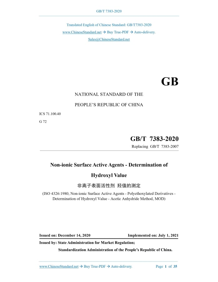 GB/T 7383-2020: Non-ionic surface active agents - Determination of hydroxyl value Delivery: 9 seconds. True-PDF full-copy in English & invoice will be downloaded + auto-delivered via email. See step-by-step procedure Status: Valid GB/T 7383: Historical versions
