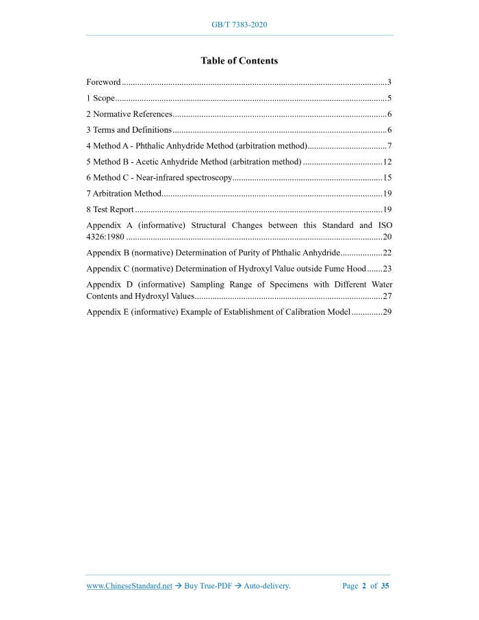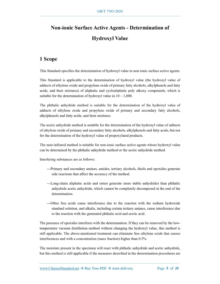 GB/T 7383-2020: Non-ionic surface active agents - Determination of hydroxyl value---This is an excerpt. Full copy of true-PDF in English version (including equations, symbols, images, flow-chart, tables, and figures etc.), auto-downloaded/delivered in 9 seconds, can be purchased online: https://www.ChineseStandard.net/PDF.aspx/GBT7383-2020GB NATIONAL STANDARD OF THE PEOPLE’S REPUBLIC OF CHINA ICS 71.100.40 G 72 Replacing GB/T 7383-2007 Non-ionic Surface Active Agents - Determination of Hydroxyl Value (ISO 4326:1980, Non-ionic Surface Active Agents - Polyethoxylated Derivatives - Determination of Hydroxyl Value - Acetic Anhydride Method, MOD) ISSUED ON: DECEMBER 14, 2020 IMPLEMENTED ON: JULY 1, 2021 Issued by: State Administration for Market Regulation; Standardization Administration of the People’s Republic of China. Table of ContentsForeword ... 3 1 Scope ... 5 2 Normative References ... 6 3 Terms and Definitions ... 6 4 Method A - Phthalic Anhydride Method (arbitration method) ... 7 5 Method B - Acetic Anhydride Method (arbitration method) ... 12 6 Method C - Near-infrared spectroscopy ... 15 7 Arbitration Method ... 19 8 Test Report ... 19 Appendix A (informative) Structural Changes between this Standard and ISO 4326:1980 ... 20 Appendix B (normative) Determination of Purity of Phthalic Anhydride ... 22 Appendix C (normative) Determination of Hydroxyl Value outside Fume Hood ... 23 Appendix D (informative) Sampling Range of Specimens with Different Water Contents and Hydroxyl Values ... 27 Appendix E (informative) Example of Establishment of Calibration Model ... 29 Non-ionic Surface Active Agents - Determination of Hydroxyl Value1 ScopeThis Standard specifies the determination of hydroxyl value in non-ionic surface active agents. This Standard is applicable to the determination of hydroxyl value (the hydroxyl value of adducts of ethylene oxide and propylene oxide of primary fatty alcohols, alkylphenols and fatty acids, and their mixtures) of aliphatic and cycloaliphatic poly alkoxy compounds, which is suitable for the determination of hydroxyl value in 10 ~ 1,000. The phthalic anhydride method is suitable for the determination of the hydroxyl value of adducts of ethylene oxide and propylene oxide of primary and secondary fatty alcohols, alkylphenols and fatty acids, and their mixtures. The acetic anhydride method is suitable for the determination of the hydroxyl value of adducts of ethylene oxide of primary and secondary fatty alcohols, alkylphenols and fatty acids, but not for the determination of the hydroxyl value of propoxylated products. The near-infrared method is suitable for non-ionic surface active agents whose hydroxyl value can be determined by the phthalic anhydride method or the acetic anhydride method. Interfering substances are as follows: ---Primary and secondary amines, amides, tertiary alcohols, thiols and epoxides generate side reactions that affect the accuracy of the method. ---Long-chain aliphatic acids and esters generate more stable anhydrides than phthalic anhydride acetic anhydride, which cannot be completely decomposed at the end of the determination. ---Other free acids cause interference due to the reaction with the sodium hydroxide standard solution, and alkalis, including certain tertiary amines, cause interference due to the reaction with the generated phthalic acid and acetic acid. The presence of epoxides interferes with the determination. If they can be removed by the low- temperature vacuum distillation method without changing the hydroxyl value, this method is still applicable. The above-mentioned treatment can eliminate free ethylene oxide that causes interferences and with a concentration (mass fraction) higher than 0.5%. The moisture present in the specimen will react with phthalic anhydride and acetic anhydride, but this method is still applicable if the measures described in the determination procedures are followed for prevention.2 Normative ReferencesThe following documents are indispensable to the application of this document. In terms of references with a specified date, only versions with a specified date are applicable to this document. In terms of references without a specified date, the latest version (including all the modifications) is applicable to this document. GB/T 601 Chemical Reagent - Preparations of Standard Volumetric Solutions GB/T 2384 Dyes Intermediates - General Method for the Determination of Melting Range GB/T 3143 Color Determination Method of Liquid Chemicals - Hazen Unit - Platinum - Cobalt Scale GB/T 6365 Surface Active Agents - Determination of Free Alkalinity or Free Acidity - Titrimetric Method (GB/T 6365-2006, ISO 4314:1977, IDT) GB/T 6372 Surface Active Agents and Detergents - Methods of Sample Division (GB/T 6372- 2006, ISO 607:1977, IDT) GB/T 8170 Rules of Rounding off for Numerical Values & Expression and Judgement of Limiting Values GB/T 11275 Surface Active Agents - Determination of Water Content (GB/T 11275-2007, ISO 4317:1991, MOD) GB/T 29858 Standard Guidelines for Molecular Spectroscopy Multivariate Calibration Quantitative Analysis ISO 4327 Non-ionic Surface Active Agents - Polyalkoxylated Derivatives - Determination of Hydroxyl Value - Phthalic Anhydride Method3 Terms and DefinitionsThe following terms and definitions are applicable to this document. 3.1 hydroxyl value (OH) Hydroxyl value refers to the number of milligrams of potassium hydroxide required to neutralize the acid generated by the esterification of hydroxyl groups in 1 g of specimen with phthalic anhydride or acetic anhydride. 3.2 modeling samples Modeling samples refer to a series of representative samples selected for the establishment of the calibration model. 3.3 validation samples Validation samples refer to a series of representative samples selected for the validation of the calibration model. 3.4 calibration Calibration refers to the process of establishing a model by correlating the concentration or properties of a group o