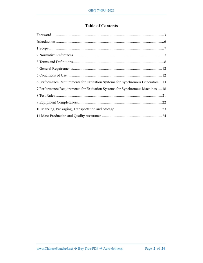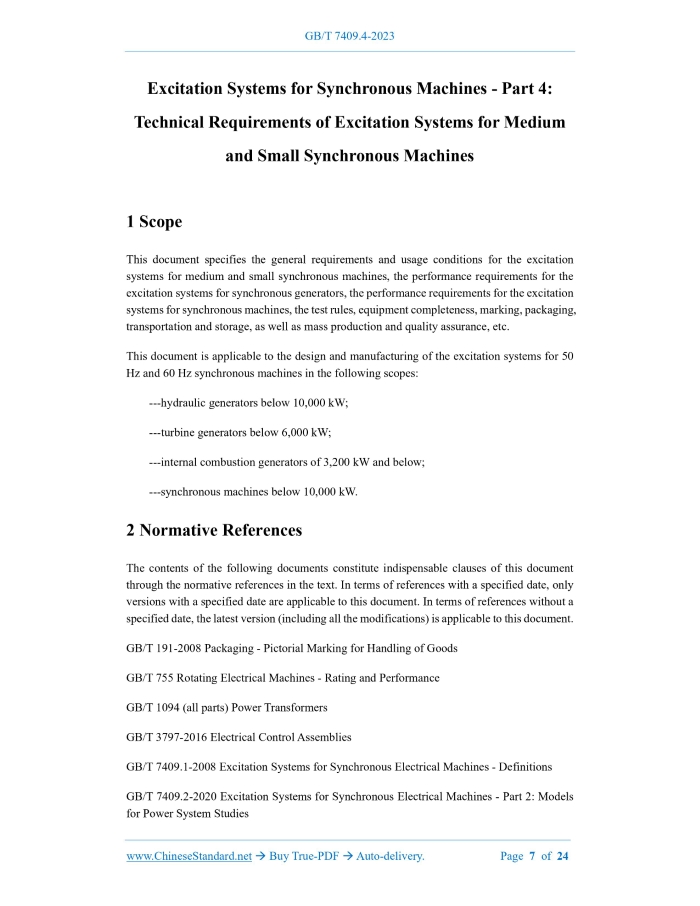 Similar standardsGB/T 7409.4-2023: Excitation systems for synchronous machines - Part 4: Technical requirements of excitation systems for medium and small synchronous machines---This is an excerpt. Full copy of true-PDF in English version (including equations, symbols, images, flow-chart, tables, and figures etc.), auto-downloaded/delivered in 9 seconds, can be purchased online: https://www.ChineseStandard.net/PDF.aspx/GBT7409.4-2023 GB NATIONAL STANDARD OF THE PEOPLE’S REPUBLIC OF CHINA ICS 29.160.01 CCS K 20 Replacing GB/T 10585-1989 Excitation Systems for Synchronous Machines - Part 4: Technical Requirements of Excitation Systems for Medium and Small Synchronous Machines ISSUED ON: SEPTEMBER 7, 2023 IMPLEMENTED ON: APRIL 1, 2024 Issued by: State Administration for Market Regulation; Standardization Administration of the People’s Republic of China. Table of ContentsForeword ... 3 Introduction ... 6 1 Scope ... 7 2 Normative References ... 7 3 Terms and Definitions ... 8 4 General Requirements ... 12 5 Conditions of Use ... 12 6 Performance Requirements for Excitation Systems for Synchronous Generators ... 13 7 Performance Requirements for Excitation Systems for Synchronous Machines ... 18 8 Test Rules ... 21 9 Equipment Completeness ... 22 10 Marking, Packaging, Transportation and Storage ... 23 11 Mass Production and Quality Assurance ... 24 Excitation Systems for Synchronous Machines - Part 4: Technical Requirements of Excitation Systems for Medium and Small Synchronous Machines1 ScopeThis document specifies the general requirements and usage conditions for the excitation systems for medium and small synchronous machines, the performance requirements for the excitation systems for synchronous generators, the performance requirements for the excitation systems for synchronous machines, the test rules, equipment completeness, marking, packaging, transportation and storage, as well as mass production and quality assurance, etc. This document is applicable to the design and manufacturing of the excitation systems for 50 Hz and 60 Hz synchronous machines in the following scopes: ---hydraulic generators below 10,000 kW; ---turbine generators below 6,000 kW; ---internal combustion generators of 3,200 kW and below; ---synchronous machines below 10,000 kW.2 Normative ReferencesThe contents of the following documents constitute indispensable clauses of this document through the normative references in the text. In terms of references with a specified date, only versions with a specified date are applicable to this document. In terms of references without a specified date, the latest version (including all the modifications) is applicable to this document. GB/T 191-2008 Packaging - Pictorial Marking for Handling of Goods GB/T 755 Rotating Electrical Machines - Rating and Performance GB/T 1094 (all parts) Power Transformers GB/T 3797-2016 Electrical Control Assemblies GB/T 7409.1-2008 Excitation Systems for Synchronous Electrical Machines - Definitions GB/T 7409.2-2020 Excitation Systems for Synchronous Electrical Machines - Part 2: Models for Power System Studies The time required from the start of disturbance, until the difference between the generator terminal voltage and the steady-state value does not exceed 3% of the rated value (or otherwise specified) and remains within this area. NOTE: the unit is second (s).4 General RequirementsIn addition to satisfying the requirements of this document, the excitation system shall also comply with the stipulations of GB/T 755. The excitation systems for the synchronous machines shall also comply with the stipulations of GB/T 3797-2016.5 Conditions of Use5.1 The excitation systems specified in this document shall be installed indoors or in a climate- protected outdoor location. The mobile power supply can be installed in a climate-protected outdoor location. Users shall consult with the manufacturer for climate protection measures for outdoor installation. 5.2 The operating altitude does not exceed 1,000 m. NOTE: for the excitation systems used at altitudes higher than 1,000 m, the users shall consult with the manufacturer. 5.3 The requirements for ambient air temperature are as follows: a) The indoor ambient air temperature is 5 C ~ 40 C, and the outdoor ambient air temperature is 15 C ~ 40 C; b) The daily average value of ambient air temperature does not exceed 35 C. NOTE 1: if the indoor ambient air temperature is lower than 5 C, but not lower than 10 C, or the outdoor ambient air temperature is lower than 15 C, but not lower than 25 C, the users shall declare to the manufacturer. NOTE 2: if the ambient air temperature exceeds 40 C, or the indoor temperature is lower than 15 C and the outdoor temperature is lower than 25 C, the users shall consult with the manufacturer. 5.4 The monthly average maximum relative humidity in the wettest month of the location of use is 90%, and the monthly average minimum temperature in that month is 25 C. 5.5 It shall be used in an environment with clean air and no explosion hazard, and there shall be no gas or conductive dust in the surrounding air that is sufficient to corrode metal and destroy insulation. 5.6 Other special conditions of use shall be determined through negotiation between the users and the manufacturer.6 Performance Requirements for Excitation Systems forSynchronous Generators 6.1 Long-term Load Capacity When the excitation voltage and current of the synchronous generators do not exceed 1.1 times the rated values, the excitation systems shall be able to continuously operate for a long time. 6.2 Maximum Voltage Multiple The requirements for the maximum voltage multiple are as follows: a) For the excitation systems for hydraulic generators and turbine generators, it is generally not less than 1.6; b) For the excitation systems for internal combustion generators, it is generally not less than 1.5; c) When there are special requirements, the users shall consult with the manufacturer. NOTE 1: for the